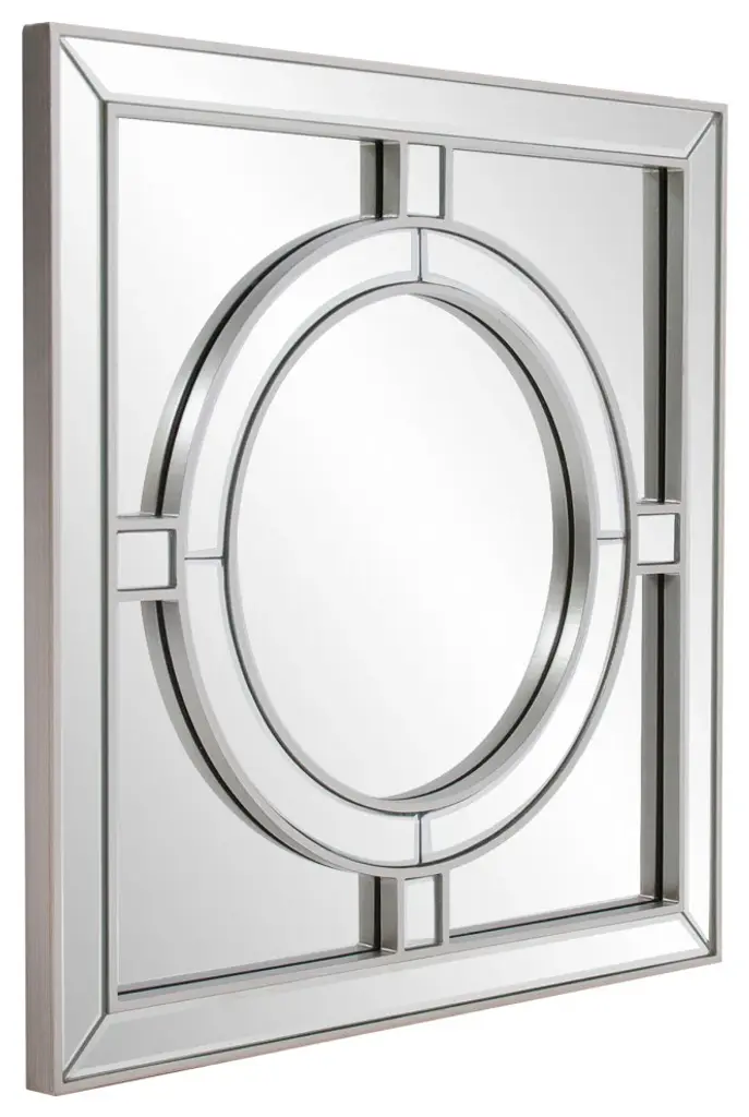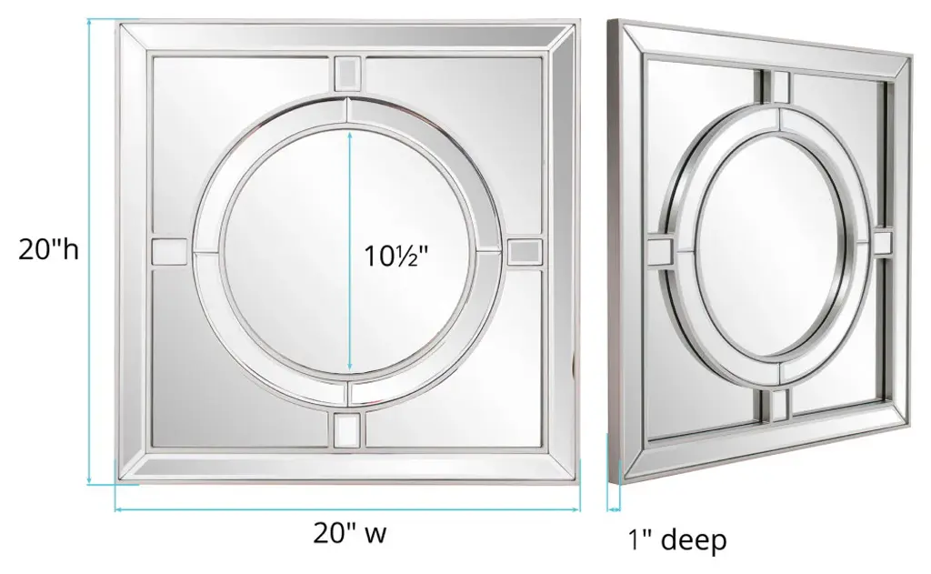 Our Arwen Mirror is a gorgeous piece. It is composed of a simple square shape with a round central design creating a windowpane look. The frame is then trimmed in champagne silver leaf. The end result is a striking piece perfect (but not limited) for your Modern, Art Deco or Traditional look. Alone or in a group on the wall, it is a perfect focal point for an entryway, bathroom, bedroom or any room in your home. D-rings are affixed to the back of the mirror so it is ready to hang right out of the box!