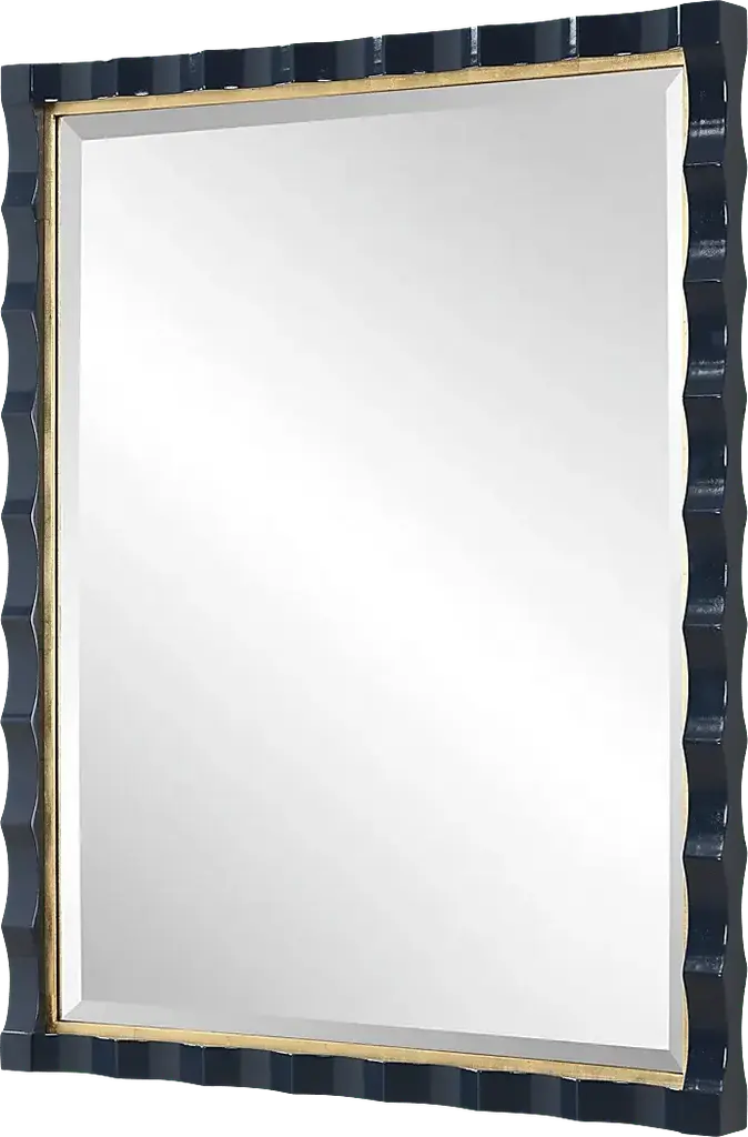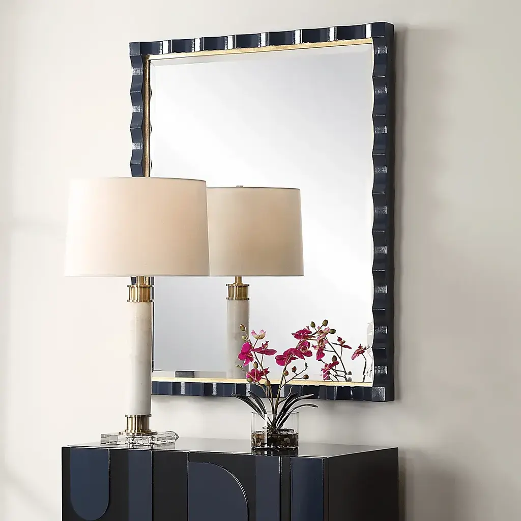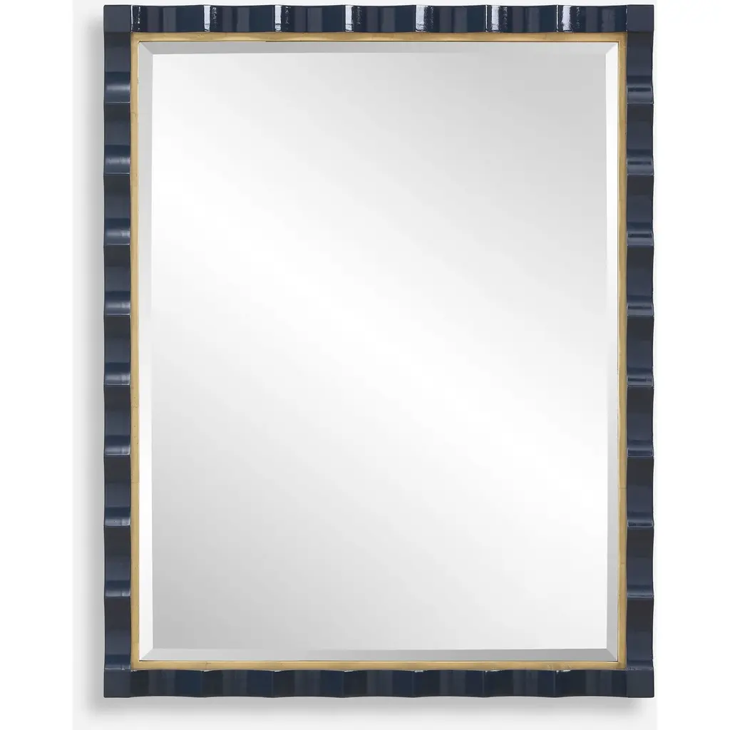Elegantly designed with a scalloped edge and a stunning gold leaf inner liner, this Asba mirror is beautifully finished in a rich, high-gloss navy lacquer. Perfect for adding a touch of luxury and depth to any room, the Asba mirror blends classic charm with a modern twist. A generous 1" bevel is added to this piece, which may be hung horizontal or vertical.