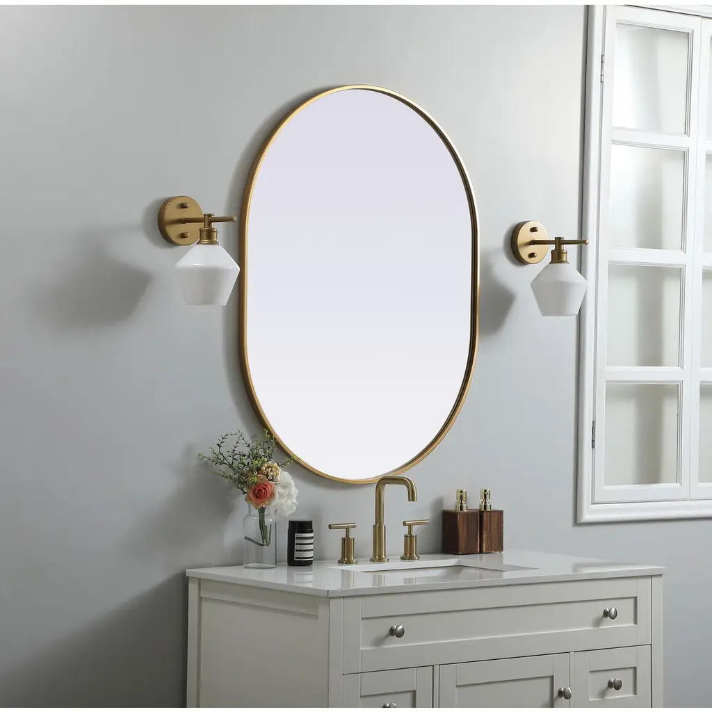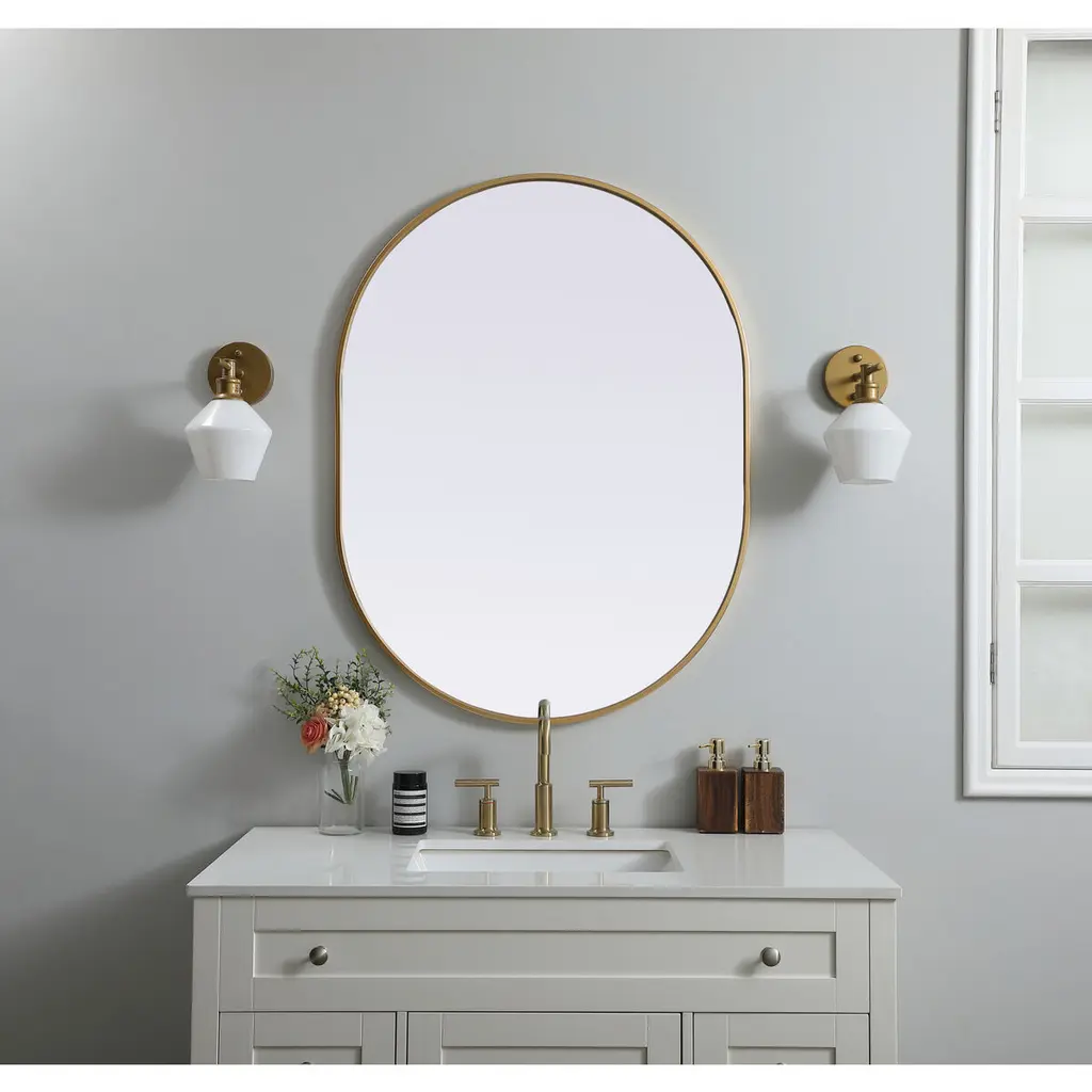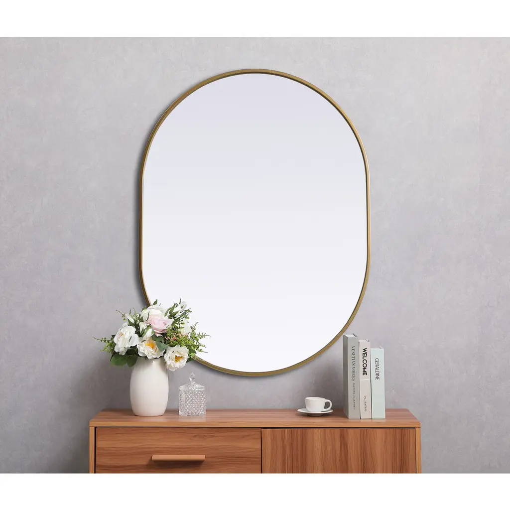 Instantly open up any space in your home with this minimalist wall-mounted mirror. Crafted of metal, this mirror strikes a pill-shaped silhouette. Its slender, clean-lined frame sports a classic finish, while the glass mirror within features a flat, for a brilliant reflection, letting the light bounce off to expand your space. Designed in a pill shape, this metal-frame mirror showcases in the three available satin finishes in black, brass, or silver. Mount this work of art in any room of your choice for added visual impact.