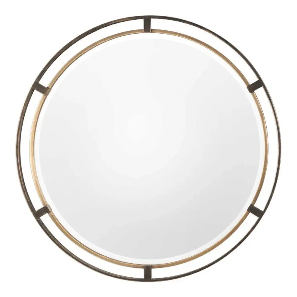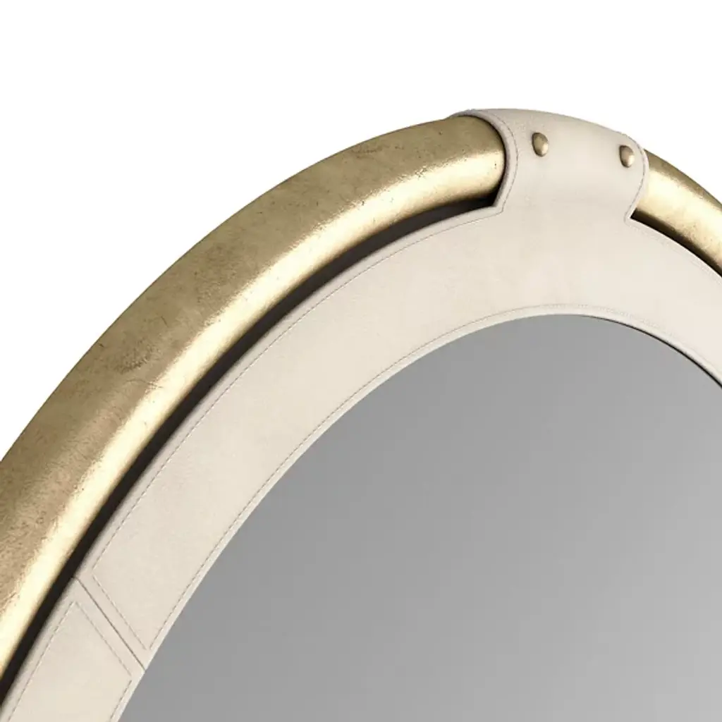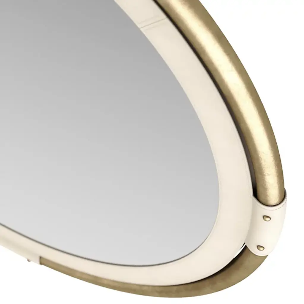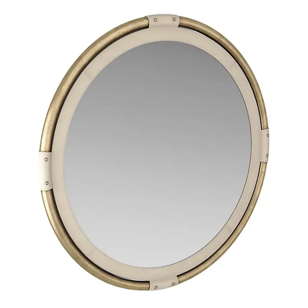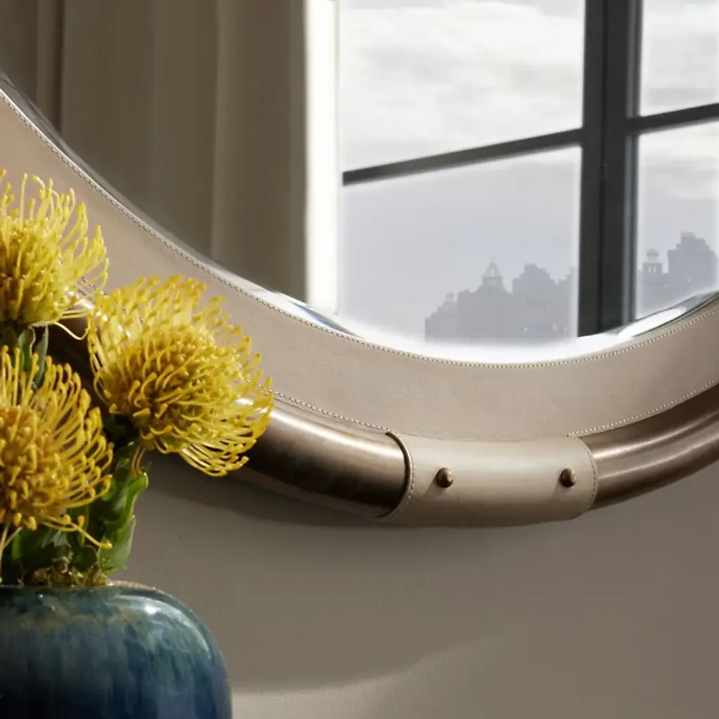 The Asmara Mirror from Arteriors is a round and impeccably designed piece that combines quality materials as a sartorial and durable addition to your setting. Crafted from a blend of brass, leather, and metal, this mirror showcases premium materials and exhibits fine craftsmanship. The beveled mirror is accentuated with a bullnose design that adds sophistication.