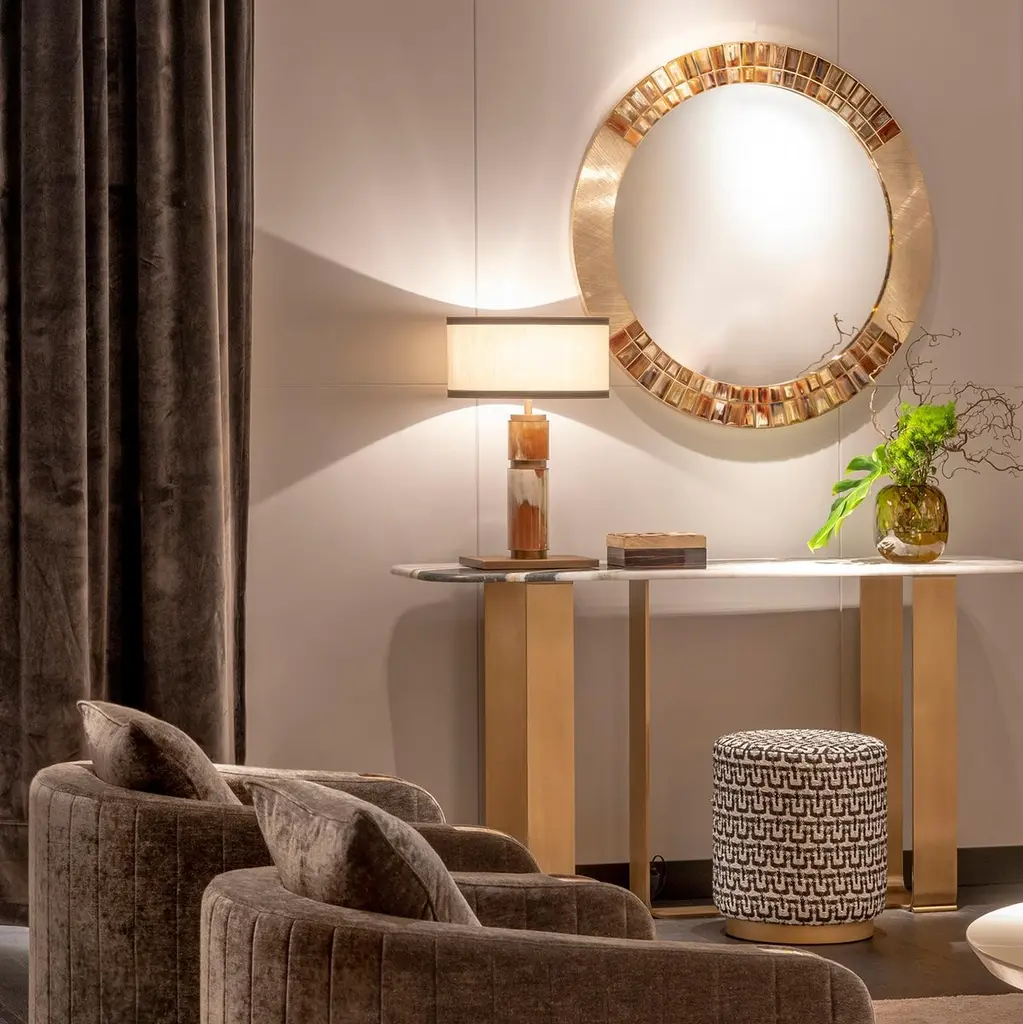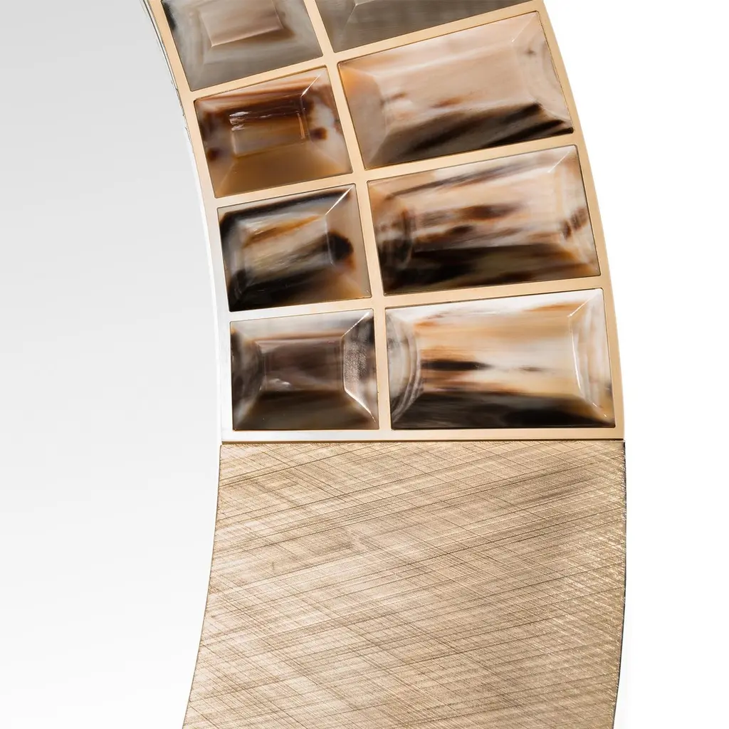 Ancient techniques conveyed from the Florentine goldsmith culture give birth to Astrid mirror, a luxurious statement piece of decor. Shiny gems in Corno Italiano, hand-shaped to recall precious stones, are nestled into a hand engraved brass frame, pleated in 24-karat gold finish. A stunning combination of materials and artisanal know-how which will add a meaningful tone to your interior.Note: Colors and shades of Corno Italiano processed by our Company are unique and due to the natural origin of raw material. For this reason Corno Italiano tones that can be seen in pictures are indicative and cannot be reproduced in finished products.
