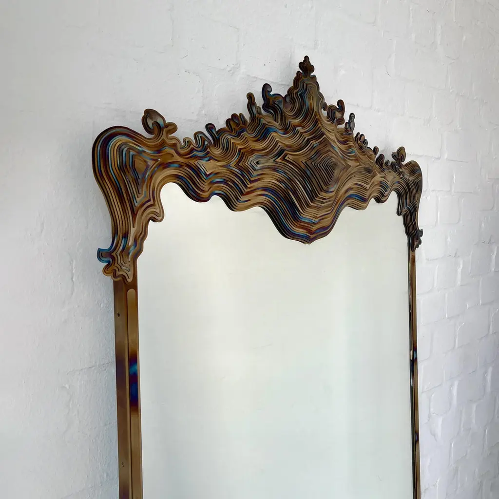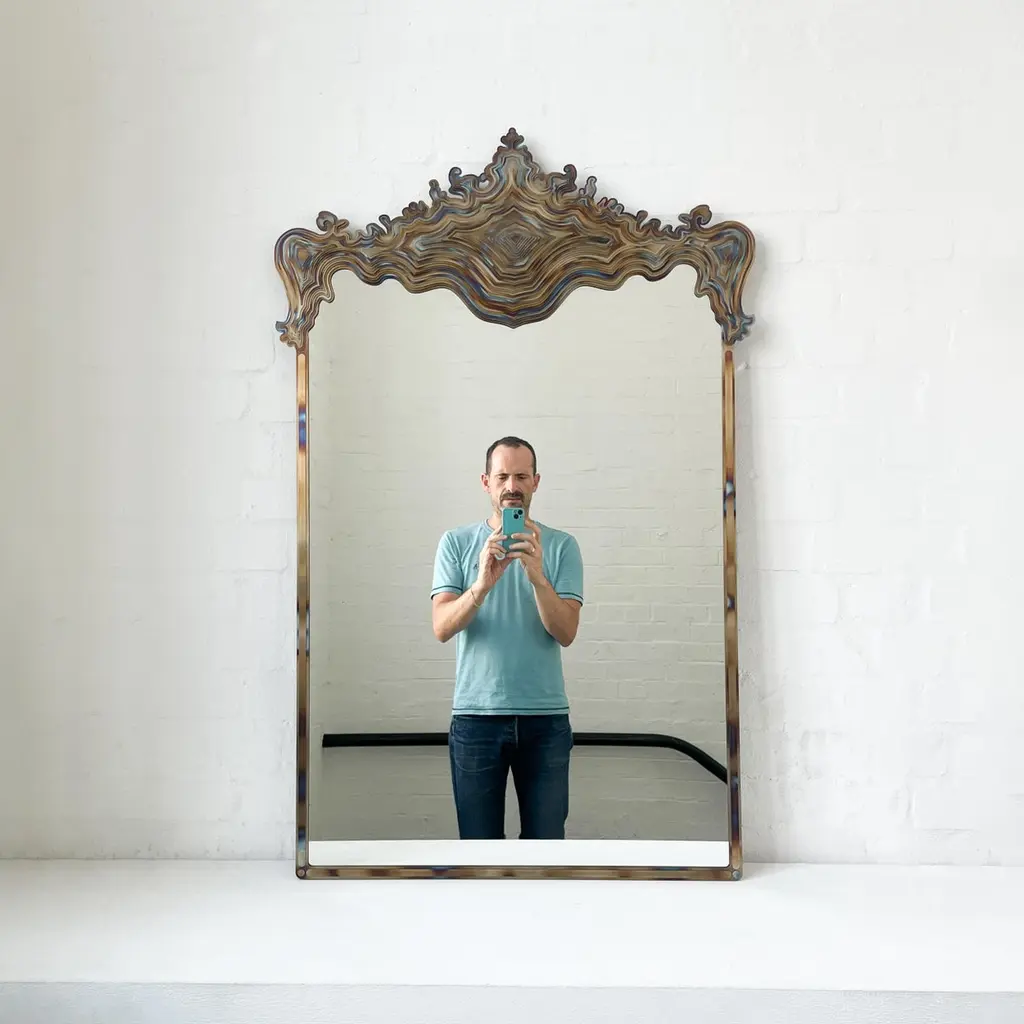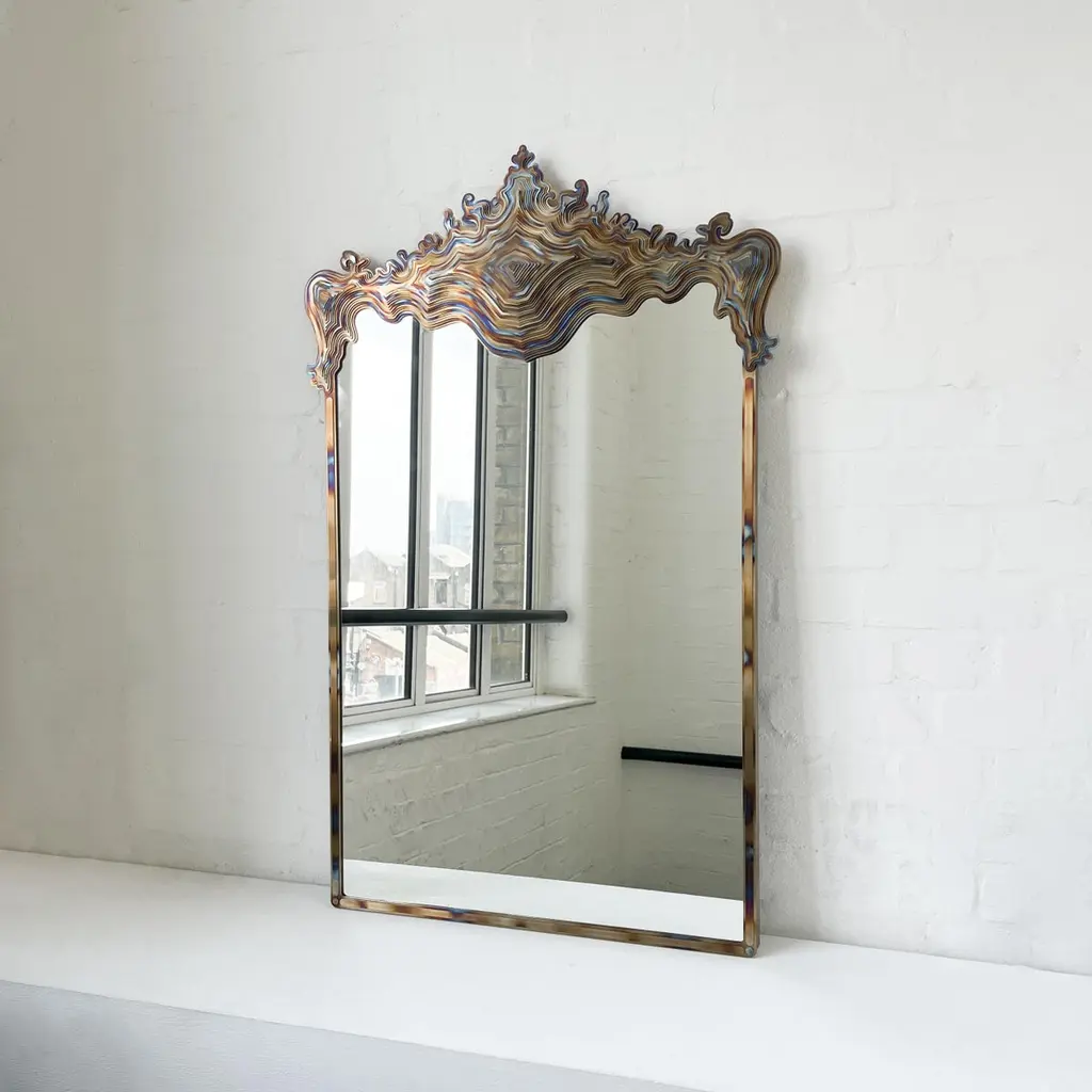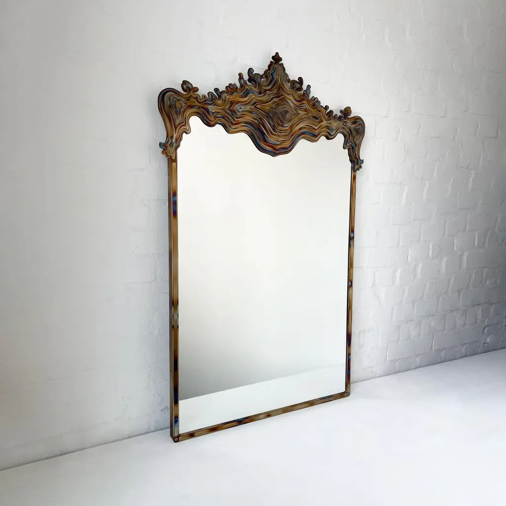 Asturias™ special edition mirror with a stunning tempered stainless steel frame. Handcrafted & designed in London, UK. Shipped worldwide.Introducing the latest stunning creation by mirror designer JL Alguacil.Always drawing inspiration from nature, Alguacil’s newest special edition—the Asturias Mirror—pays tribute to the dramatic landscapes of Asturias, where mountains meet the sea along a breathtaking coastline.In this piece, the designer takes his signature metal layering technique to new heights, adding intricate detail and exceptional precision. The result is a highly crafted and technically sophisticated work of art.The frame features a unique steel-burned finish, evoking the warm tones and textures of autumn leaves—an unexpected and beautiful nod to the natural world.A one-of-a-kind mirror of extraordinary craftsmanship and astonishing aesthetic impact.Dimensions (customisable):H 113cm x W 72.7cm x D 3.1cm / H 44.5 in x W 28.7 in x D 1.21 inShipped safely and insured worldwide. All our mirrors are made on demand. Fabrication lead time for this mirror is approximately 7-8 weeks. Our mirrors are shipped by courier express, which typically requires 1 to 2 days to the UK, or 2 to 7 days outside the UK depending on the destination.ORDERS OF MULTIPLE MIRRORS OF THE SAME TYPE: Please contact us to receive a Packing and Shipping quote when ordering multiple mirrors of the same type. An order for multiple mirrors of the same type may not be accepted without extra packing and shipping fees. Thank you.