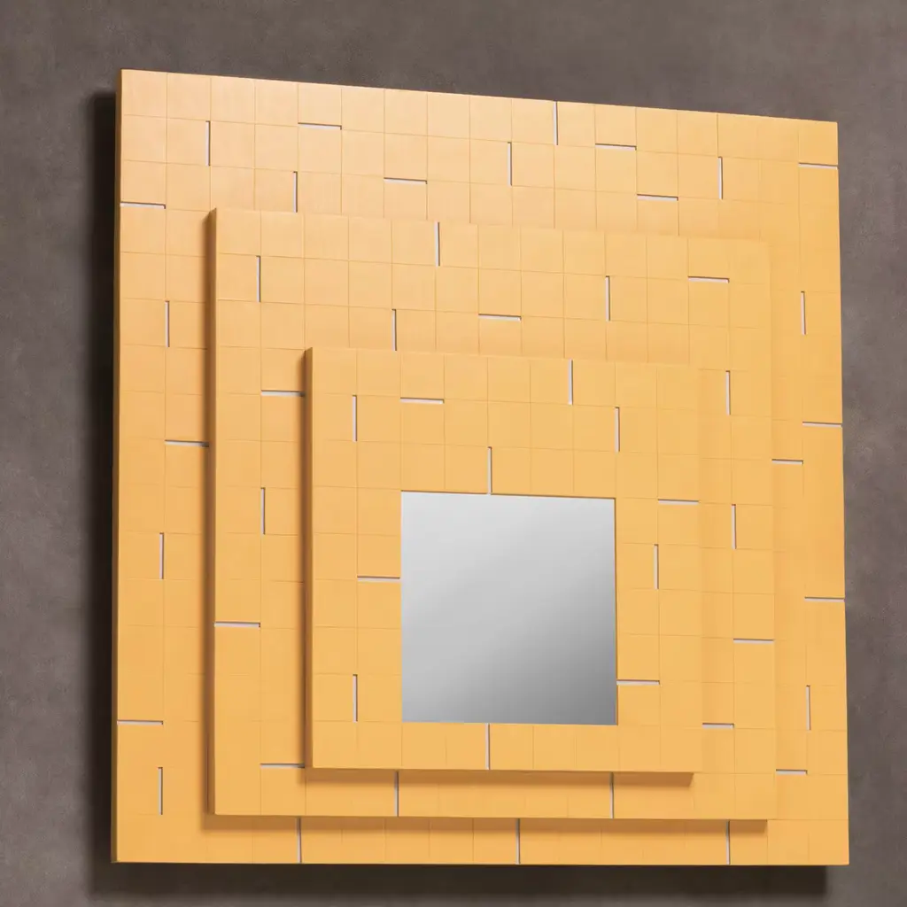 Inspired by Josef Albers' series of paintings "Homage to the Square" that explore the chromatic interactions with nested squares, this stunning saddle leather mirror has a frame consisting of three squares in a solid yellow color nested within one another with the mirror sitting at the lower center. The multidimensional effect, enhanced by black grooves on the geometric pattern of the tiles, will bring movement, form, and light to any room. A stunning mirror that can be hung or leaned against a wall, in a bedroom over a dresser, in an entryway on a console, solo or in multiples for an eye-catching effect.