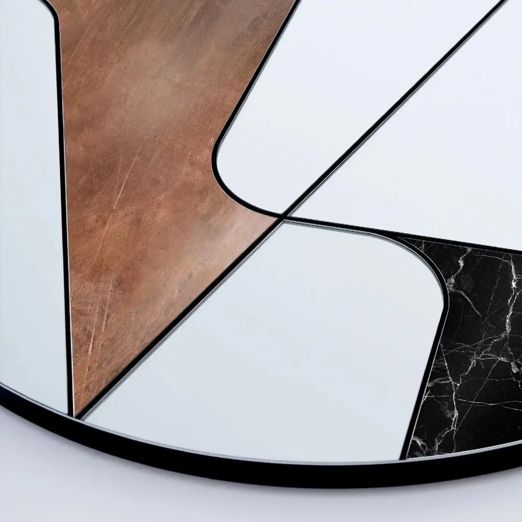 Atlas Itinera Insula VI 120 Wall Mirror by Atlas ProjectDimensions: D 3/5 x Ø 120 cm. Materials: Black powder painted iron, copper, black leather, mirror, and wood.Available in different finishes and sizes. Please contact us.ITINERAThe material fills the space. Elegantly combined materials give you a perfect balance of richness and simplicity.The Itinera Collection lends itself to customization, through the combination of materials and colors. For that purpose, we have selected a wide range of fine materials, each with its unique characteristics,to draw on to create your Itinera product according to your taste and needs.Our ProjectThe synergy between a thirty-year Italian craft experience and an original design, based on the need to research and develop topics up with the new aesthetic trends, gives birth to Atlasproject, an exclusive furniture collection conceived by the designer Massimiliano Giordano.Born and developed first in Copenhagen, then in Vienna and finally in Rome, the project is – as a matter of fact - a journey of contamination and encounter between the many cultures of the European Design.The production is focused on a dynamic dialogue between geometries and materials, which leads to collections of deep impact and elegance. Every piece merges essential geometric shapes with the most surprising materials, textures, and colors, as the result of a careful selection of natural materials and hand-processed metals.The Atlasproject collections are entirely made in Italy, where the tradition of artisanality is still a deep value, to ensure high-quality and long-life products.Of Neapolitan origins, Massimiliano Giordano grew up inthe family’s artistic atelier.The artisan knowledge and the design skills lead him to Atlasproject, a creative container inspired by the journey, leit motiv of his personal and professional life. In fact, the designer leaves from Naples towards Copenhagen, where he will stay for five years, and then for Vienna for five years more in the heart of the Mitteleuropean design, and finally in Rome, where he currently lives and works.The amazing connections between the encountered design souls actually represent the most significant stylistic figure of his works.