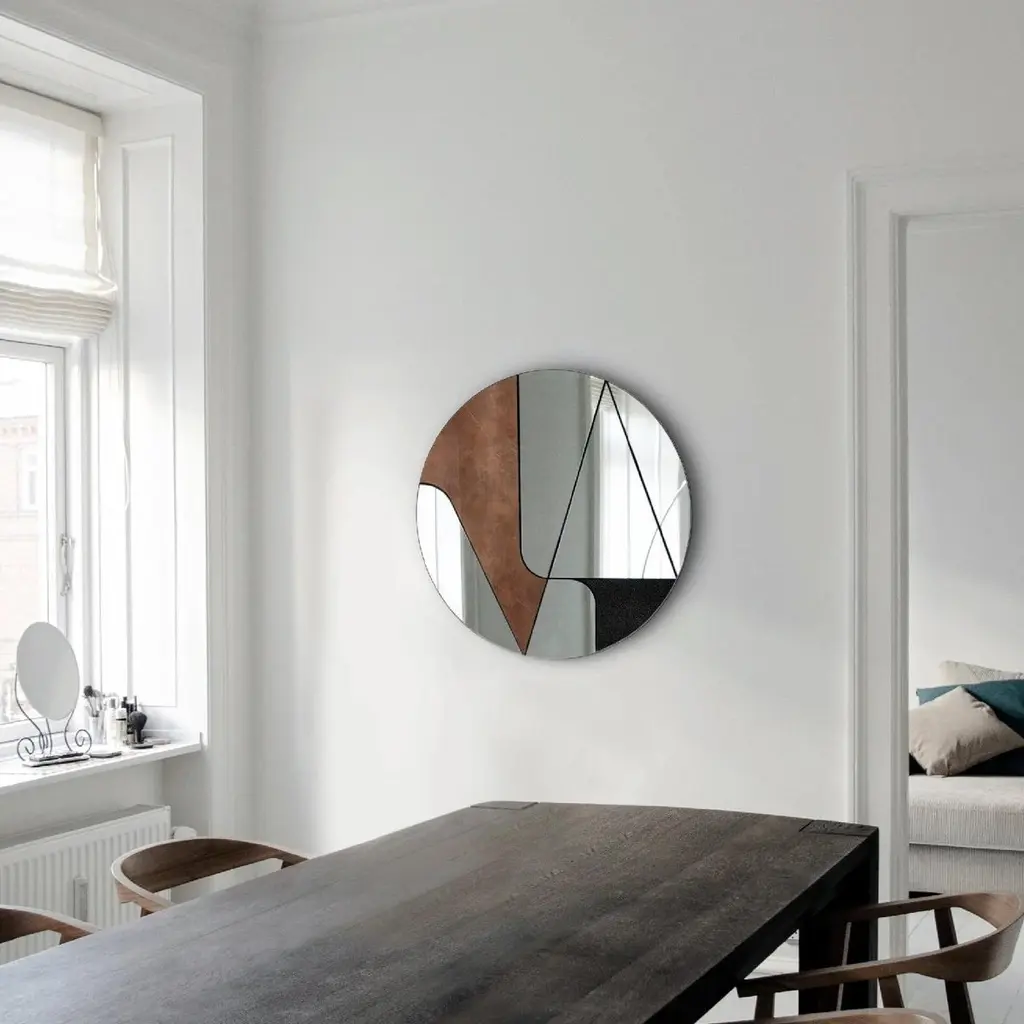 Atlas Itinera Insula VI 90 Wall Mirror by Atlas ProjectDimensions: D 3/5 x Ø 90 cm. Materials: Black powder painted iron, copper, black leather, mirror, and wood.Available in different finishes and sizes. Please contact us.ITINERAThe material fills the space. Elegantly combined materials give you a perfect balance of richness and simplicity.The Itinera Collection lends itself to customization, through the combination of materials and colors. For that purpose, we have selected a wide range of fine materials, each with its unique characteristics,to draw on to create your Itinera product according to your taste and needs.Our ProjectThe synergy between a thirty-year Italian craft experience and an original design, based on the need to research and develop topics up with the new aesthetic trends, gives birth to Atlasproject, an exclusive furniture collection conceived by the designer Massimiliano Giordano.Born and developed first in Copenhagen, then in Vienna and finally in Rome, the project is – as a matter of fact - a journey of contamination and encounter between the many cultures of the European Design.The production is focused on a dynamic dialogue between geometries and materials, which leads to collections of deep impact and elegance. Every piece merges essential geometric shapes with the most surprising materials, textures, and colors, as the result of a careful selection of natural materials and hand-processed metals.The Atlasproject collections are entirely made in Italy, where the tradition of artisanality is still a deep value, to ensure high-quality and long-life products.Of Neapolitan origins, Massimiliano Giordano grew up inthe family’s artistic atelier.The artisan knowledge and the design skills lead him to Atlasproject, a creative container inspired by the journey, leit motiv of his personal and professional life. In fact, the designer leaves from Naples towards Copenhagen, where he will stay for five years, and then for Vienna for five years more in the heart of the Mitteleuropean design, and finally in Rome, where he currently lives and works.The amazing connections between the encountered design souls actually represent the most significant stylistic figure of his works.