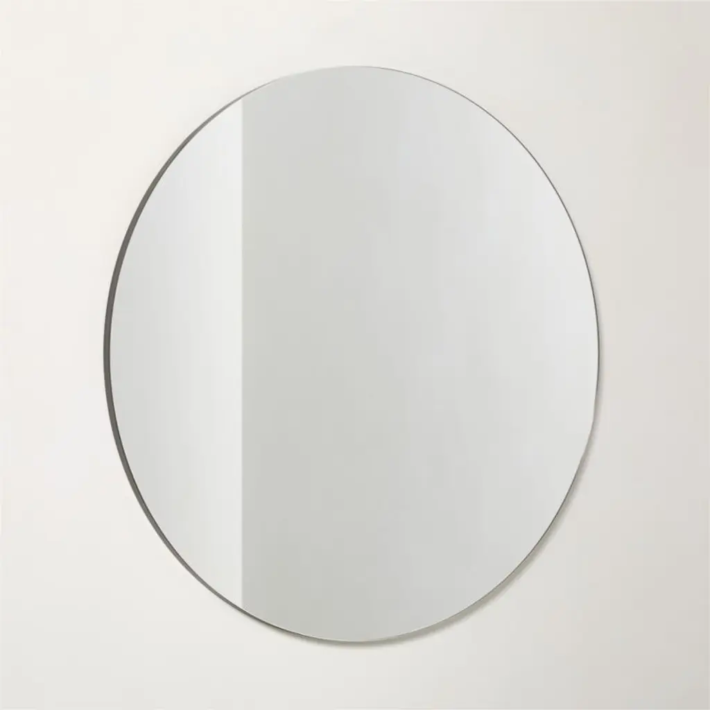 Floating, frameless effect elevates this simple brass round mirror. French cleat mounting system allows for an uncomplicated hang. Hardware is included. CB2 exclusive.