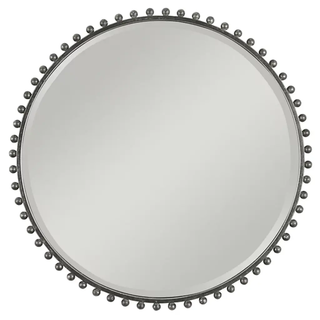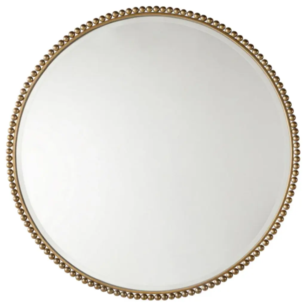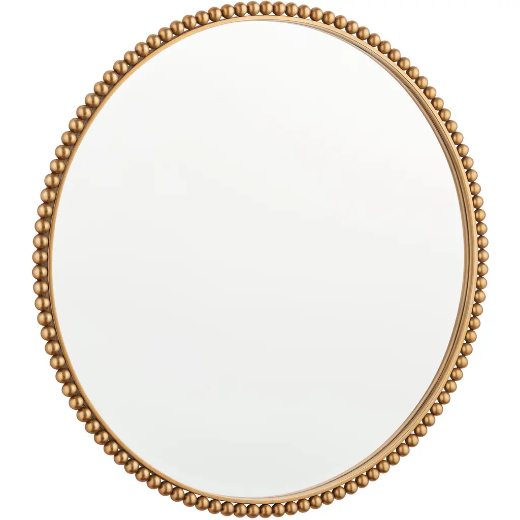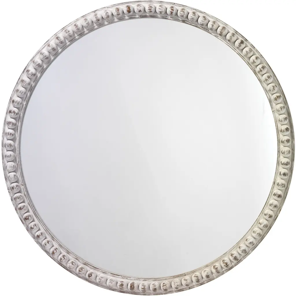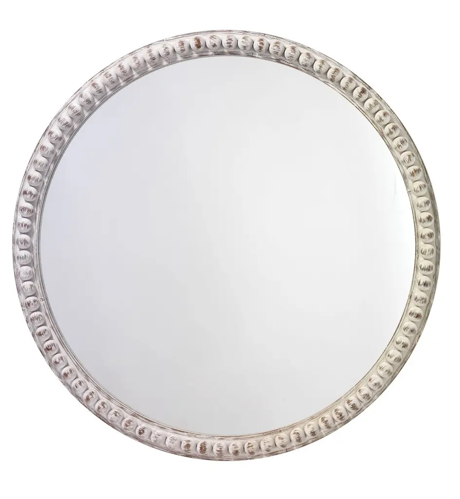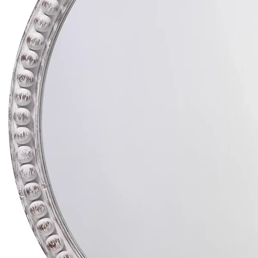 Experience the timeless elegance of the Audrey Beaded Mirror by Jamie Young Co. Its delicate, round frame features a rustic, white-washed wood finish and wooden spheres that circle the perimeter for an extra touch of charm. This light and airy mirror is perfect for guest rooms or bathrooms. Hang it effortlessly using the included D-loops.
