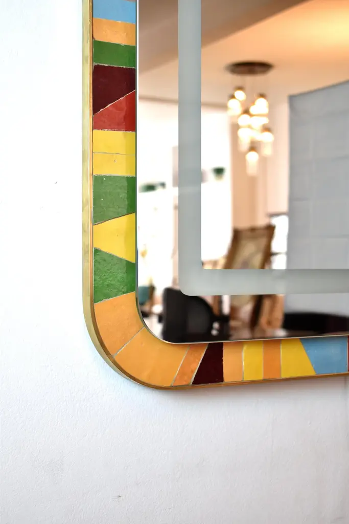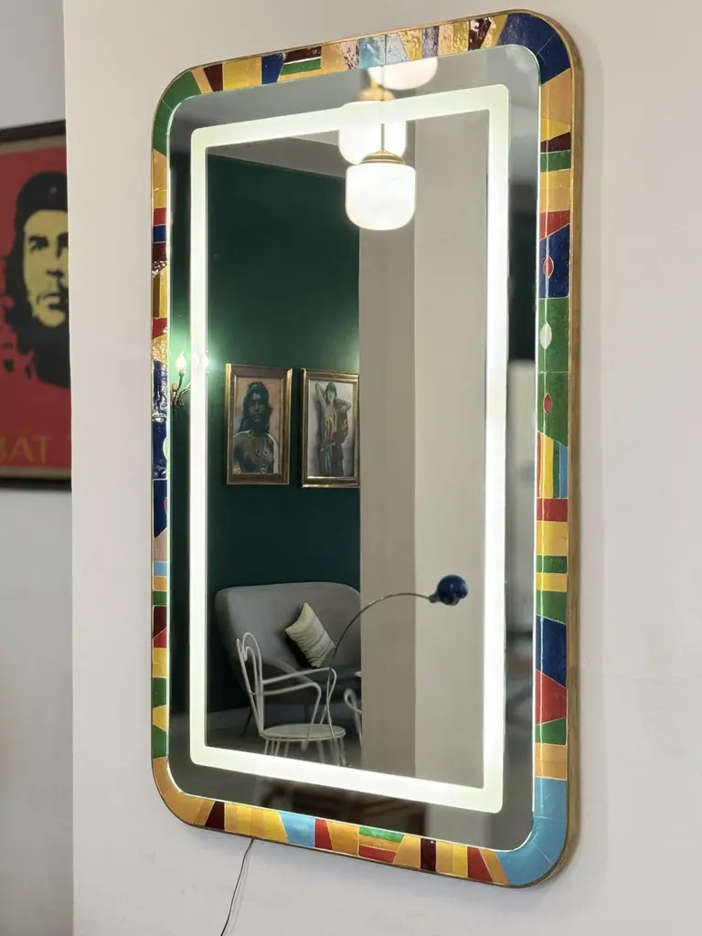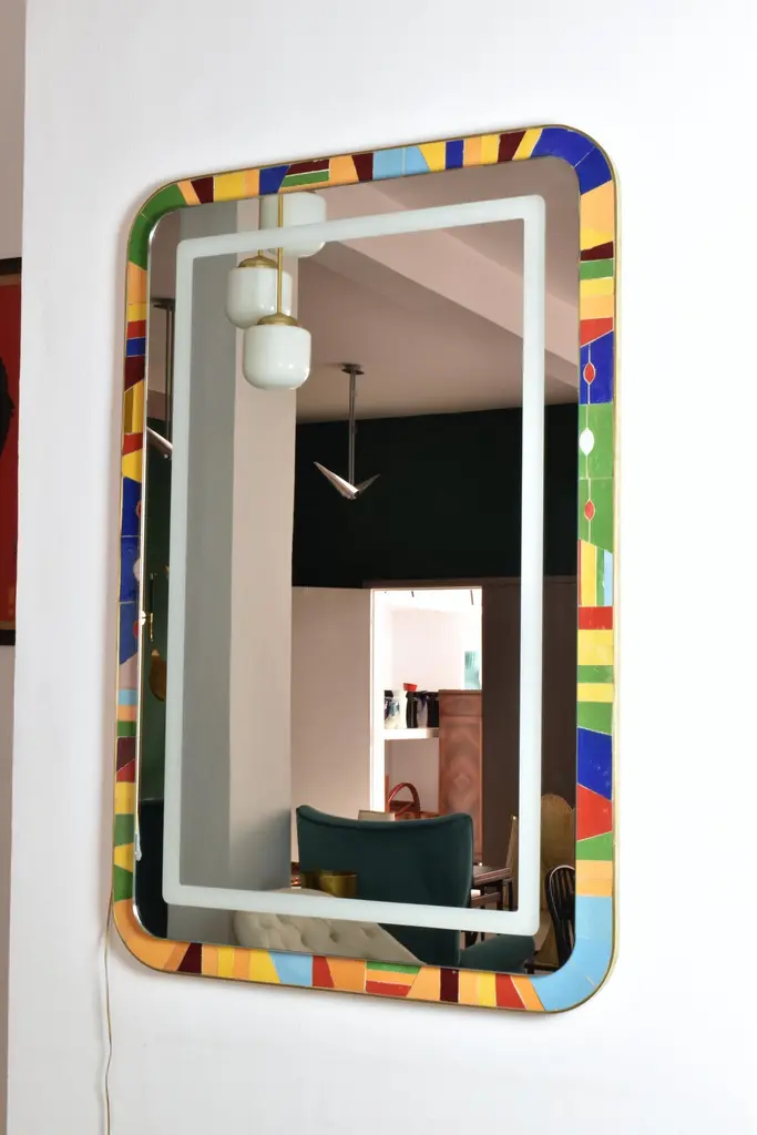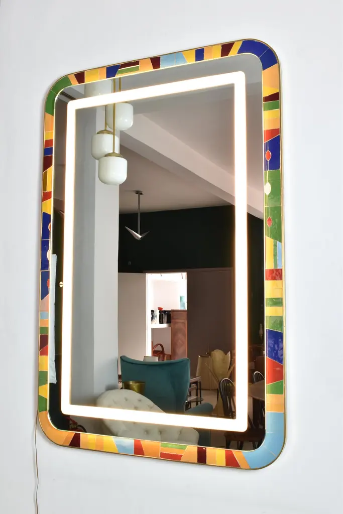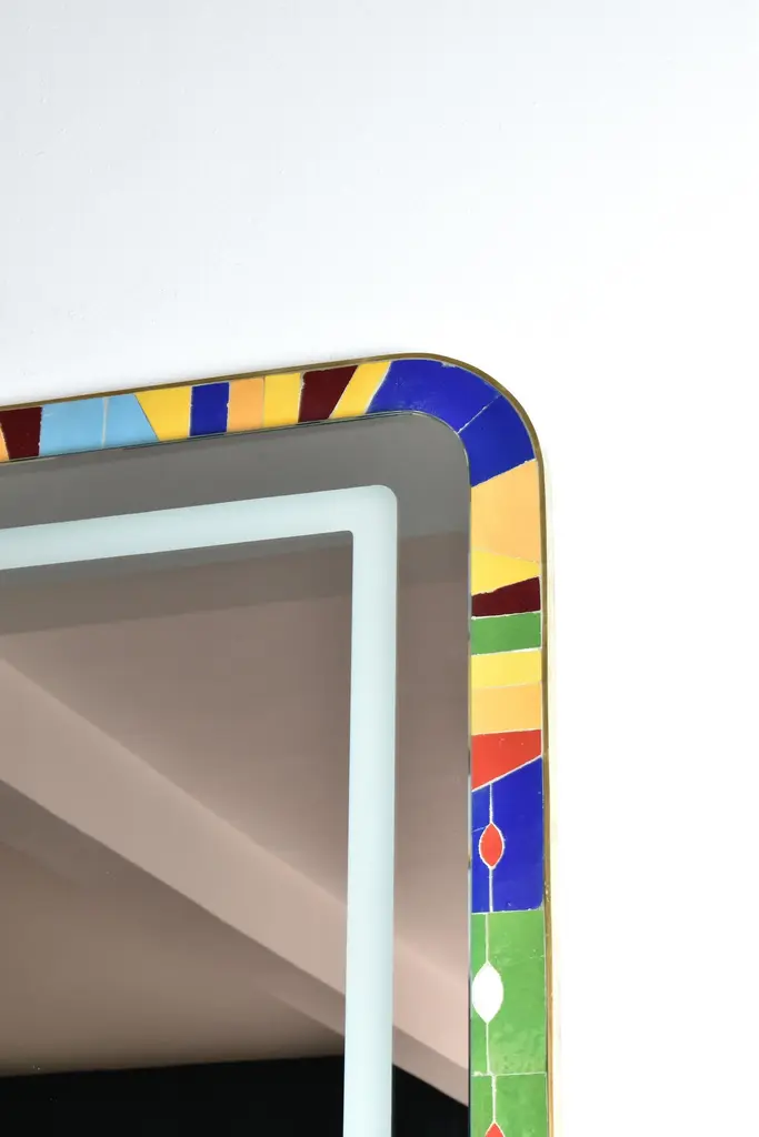 Introducing our exquisite handcrafted LED light mosaic and brass bathroom Mirror. Within the strong brass frame, vibrant handmade mosaics are artfully arranged, crafting a poetic harmony of geometric compositions and rich hues. The rectangular mirror is designed with rounded corners portraying an organic feel to its overall aspect. Designed by Jonathan Amar, this LED light mirror is created for bathrooms. This piece embraces modern technology with the heritage of Moroccan artisanry. Limited to 80 pieces.