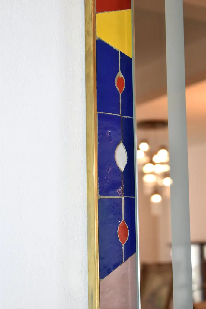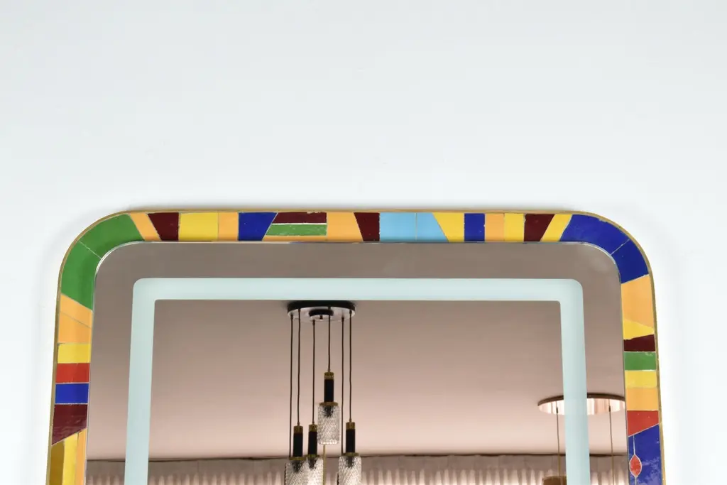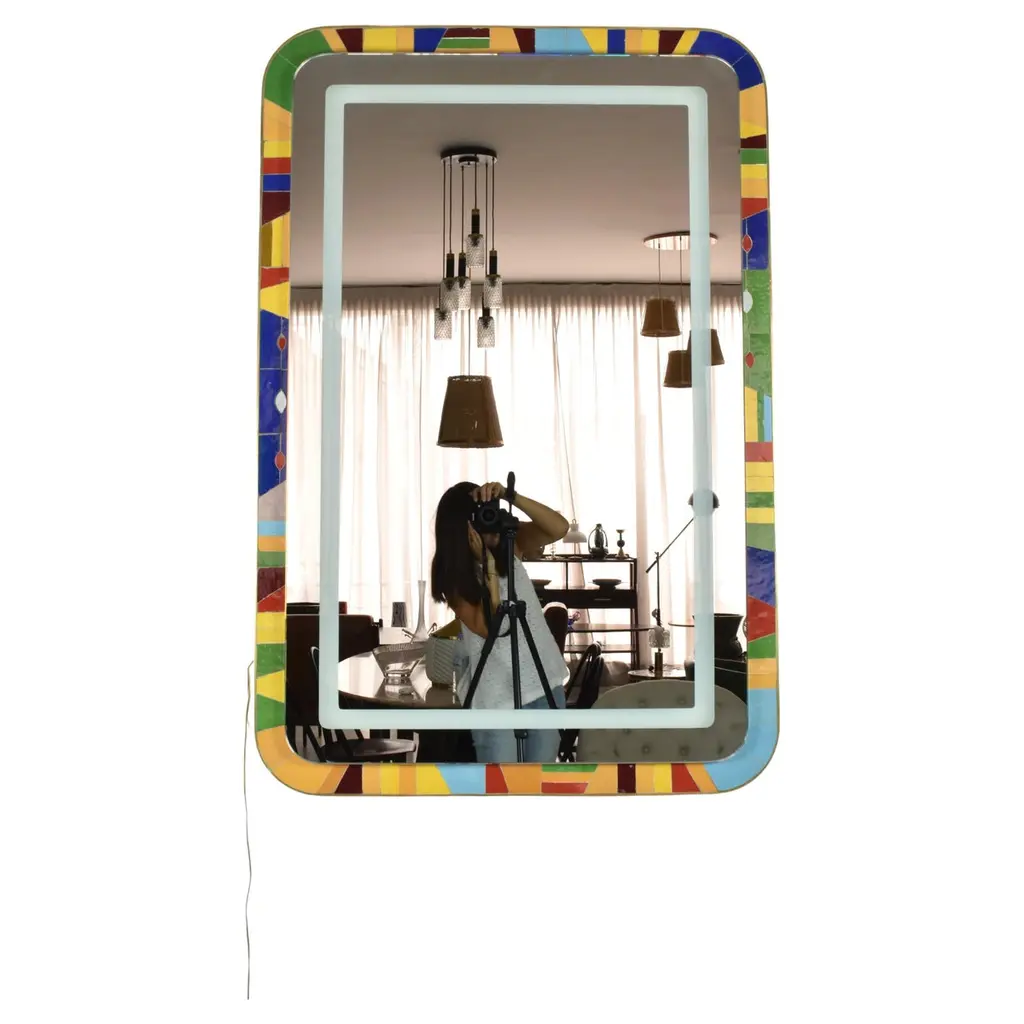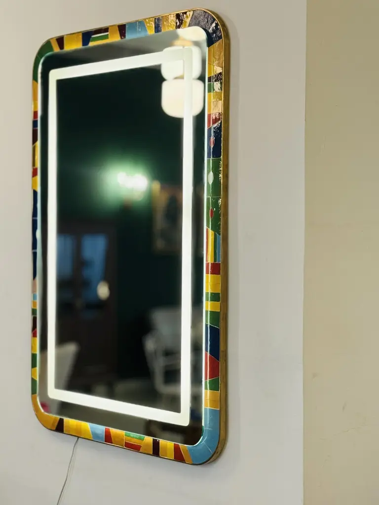 Introducing our exquisite handcrafted LED light mosaic and brass bathroom Mirror. Within the strong brass frame, vibrant handmade mosaics are artfully arranged, crafting a poetic harmony of geometric compositions and rich hues. The rectangular mirror is designed with rounded corners portraying an organic feel to its overall aspect. Designed by Jonathan Amar, this LED light mirror is created for bathrooms. This piece embraces modern technology with the heritage of Moroccan artisanry. Limited to 80 pieces.
