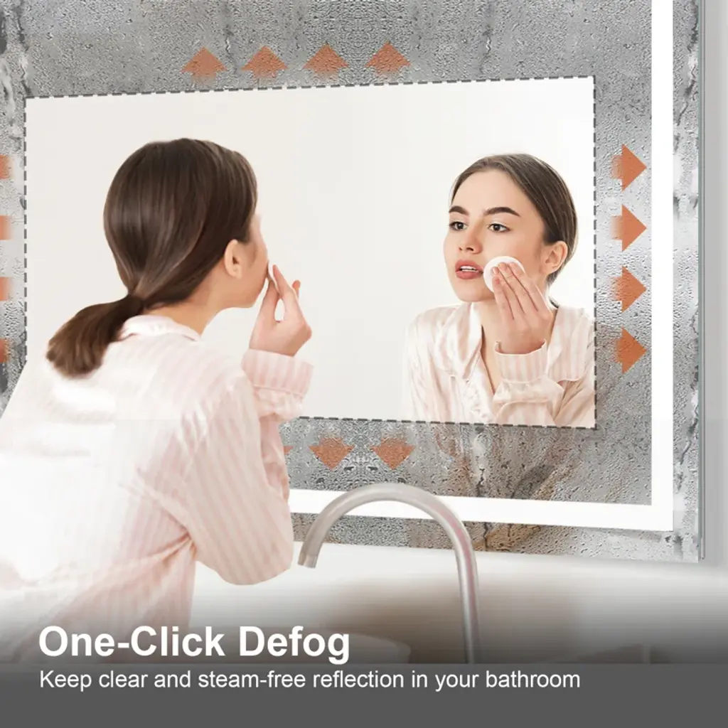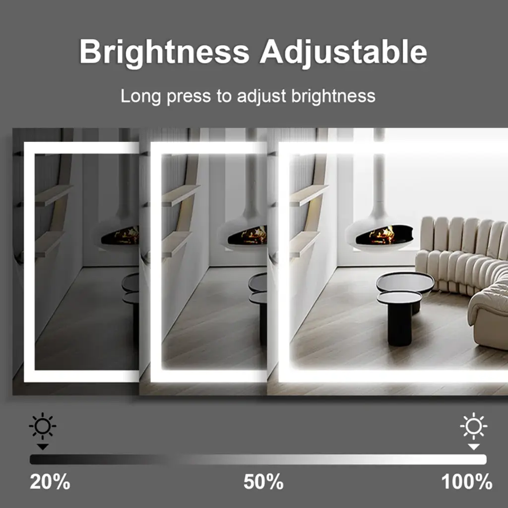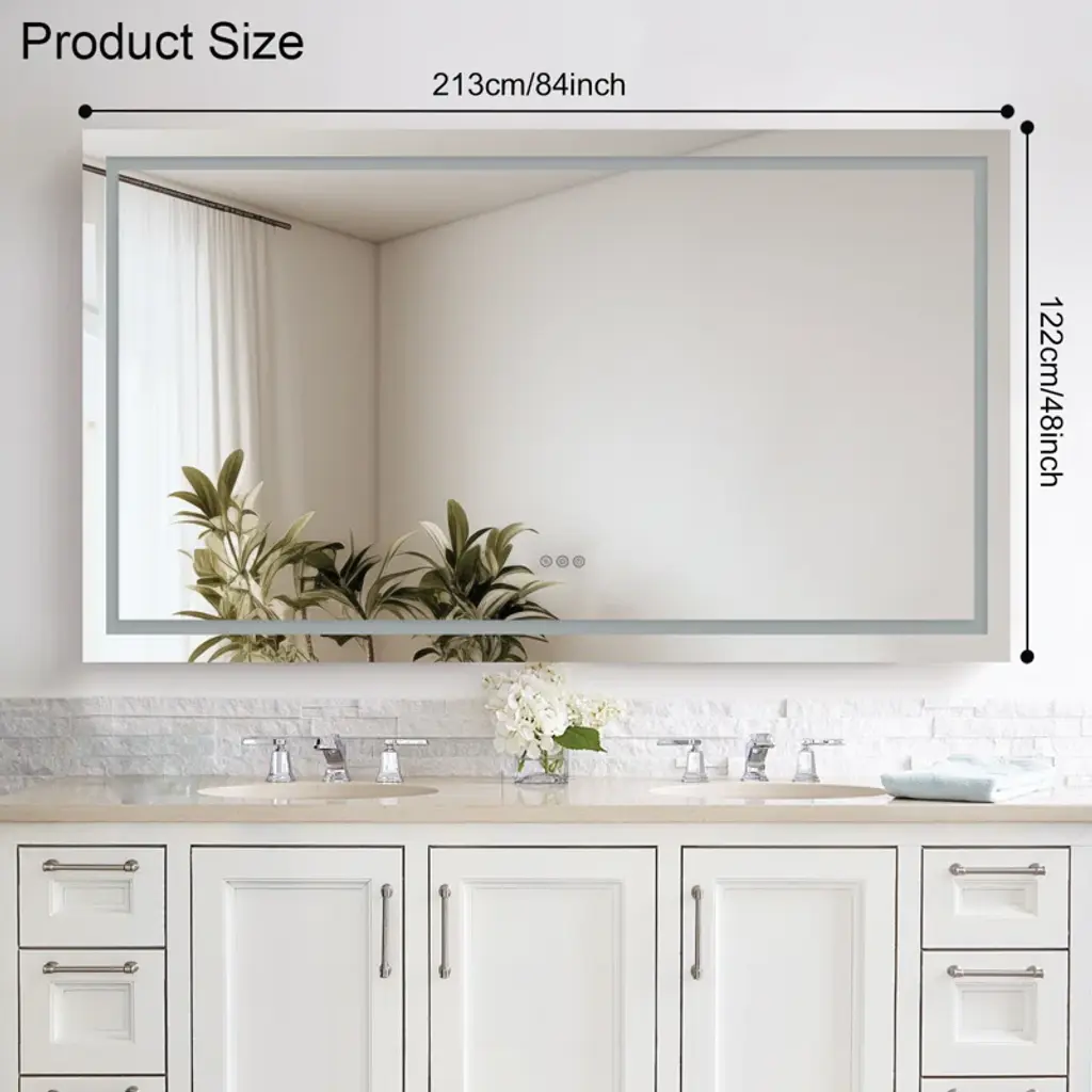This LED Bathroom Mirror for wall is designed with frameless rectangle,it provides a sophisticated look & the modern feeling, this simple yet elegant design can match your bathroom hardware very well,adds elegance and class to your bathroom.Our LED wall mirror features high-quality LED strips that are energy efficient and bright, economically and environmentally sound.With its longer lifespan and high performance,this LED vanity mirror is the perfect choice for your bathroom.You can change the color temp to 3000K/4500K/6000K,or dim the brightness to 10%-100%,just easily controlled by the three touch buttons, customize your comfortable atmosphere.The memory function will record the light settings to next turning on.Equipped with anti-fog technology, the anti fog mirror bathroom remains clear and free of condensation even in a steamy bathroom.This bathroom mirror led light is perfect for those who want a clear reflection during and after a shower.This LED mirror for bathroom can be installed with either plug-in or hardwire options.If you use a hardwired wall switch control,professional electrician is needed.Different sizes also meets the different needs of cloakroom and hair salon.