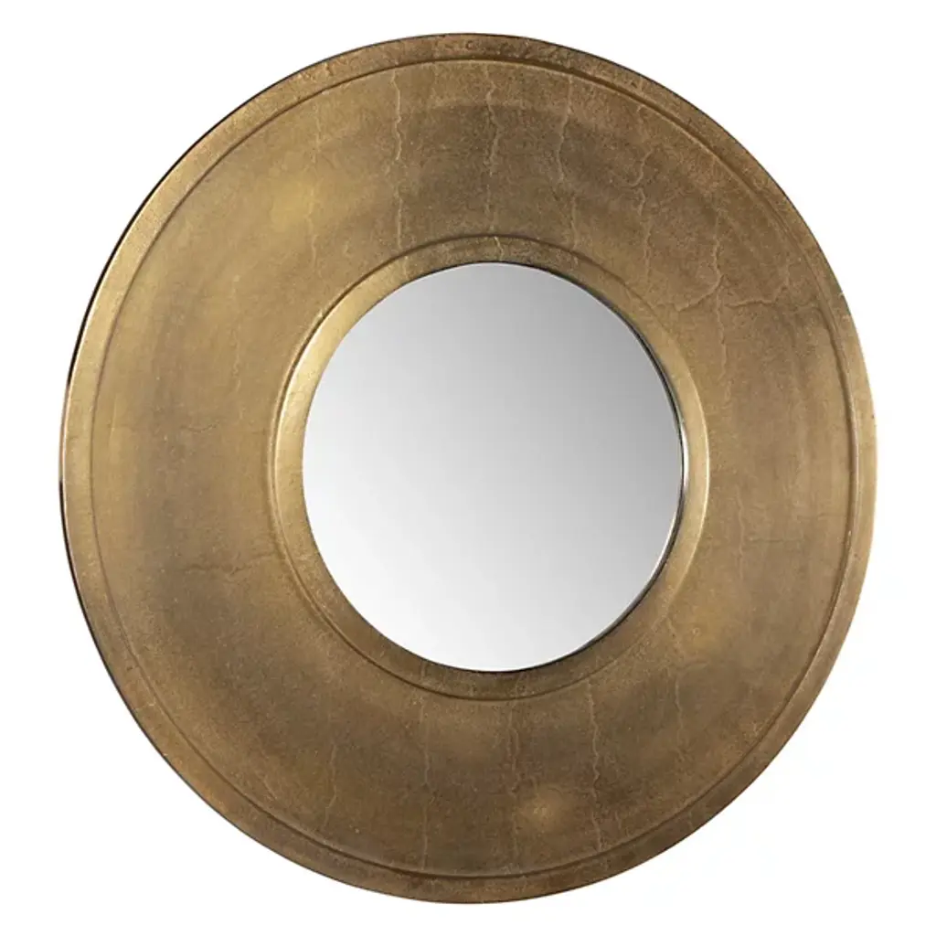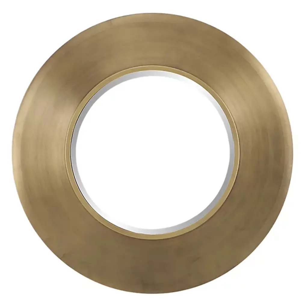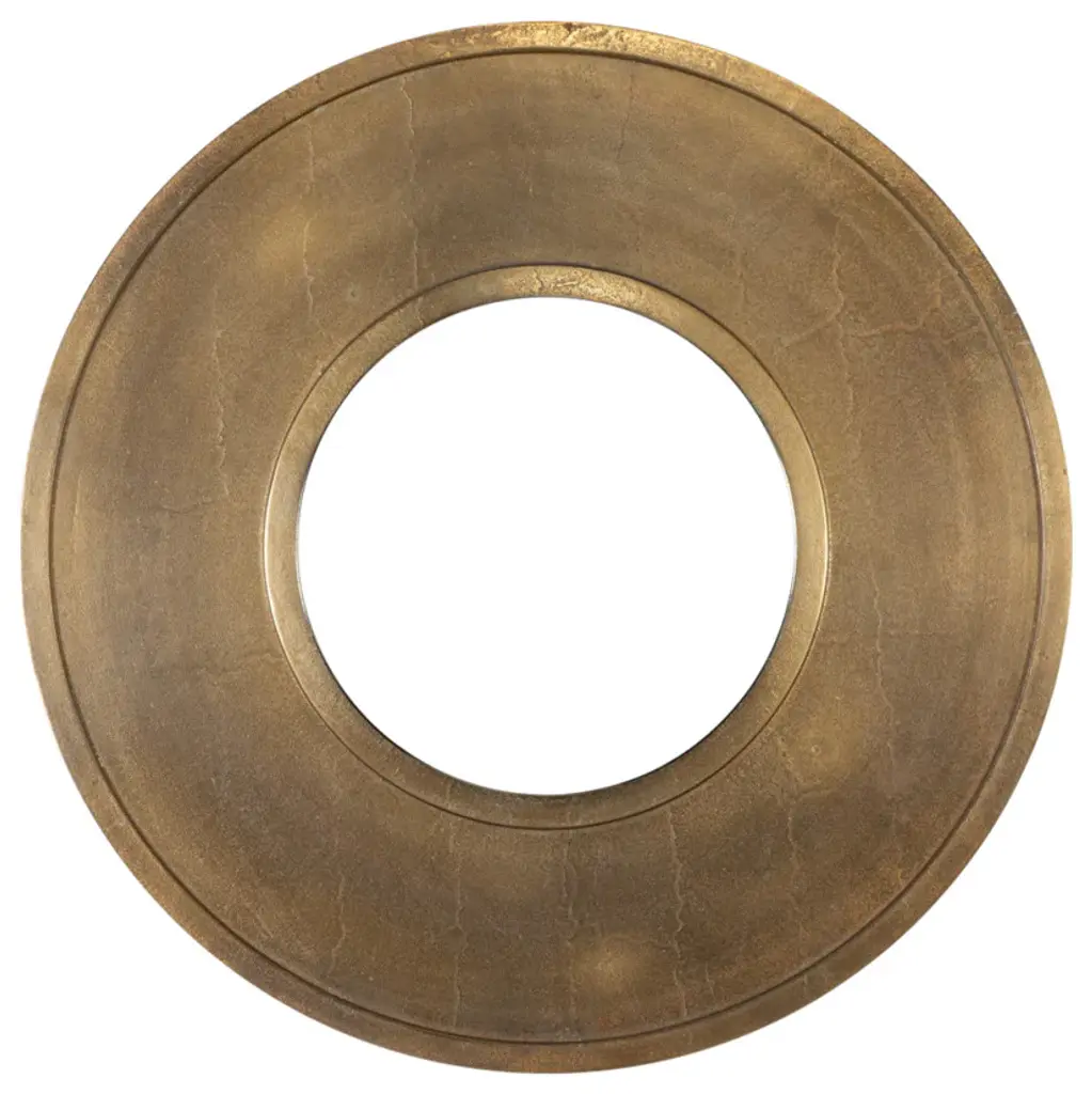 The Axel Wall Mirror from Uttermost draws inspiration from ancient sundials, with its broad circular frame surrounding a central mirror. The handcrafted aluminum frame bears natural markings that give each piece its own character. The wide outer ring creates a dramatic framing effect while maintaining visual balance. This mirror brings architectural appeal to living spaces, making it particularly suited for areas where natural light interacts with its surface.