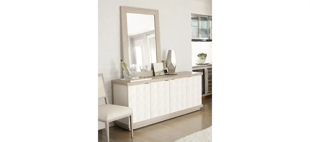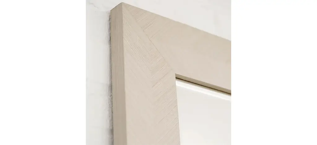 The Axiom mirror is a subtle design that makes a rich statement. Crafted from poplar solids and engineered faux veneers, the frame features an eye-catching chevron pattern. The silky yet low-sheen Linear Gray finish is subtle and sophisticated. Beveled mirrored glass adds an elegant detail to this clean, contemporary design.