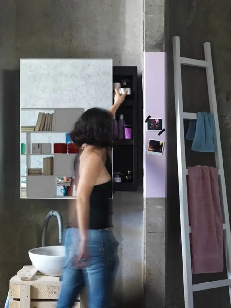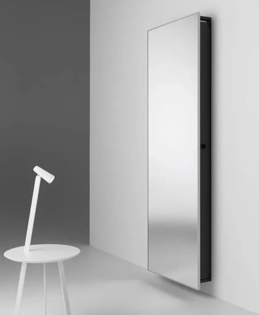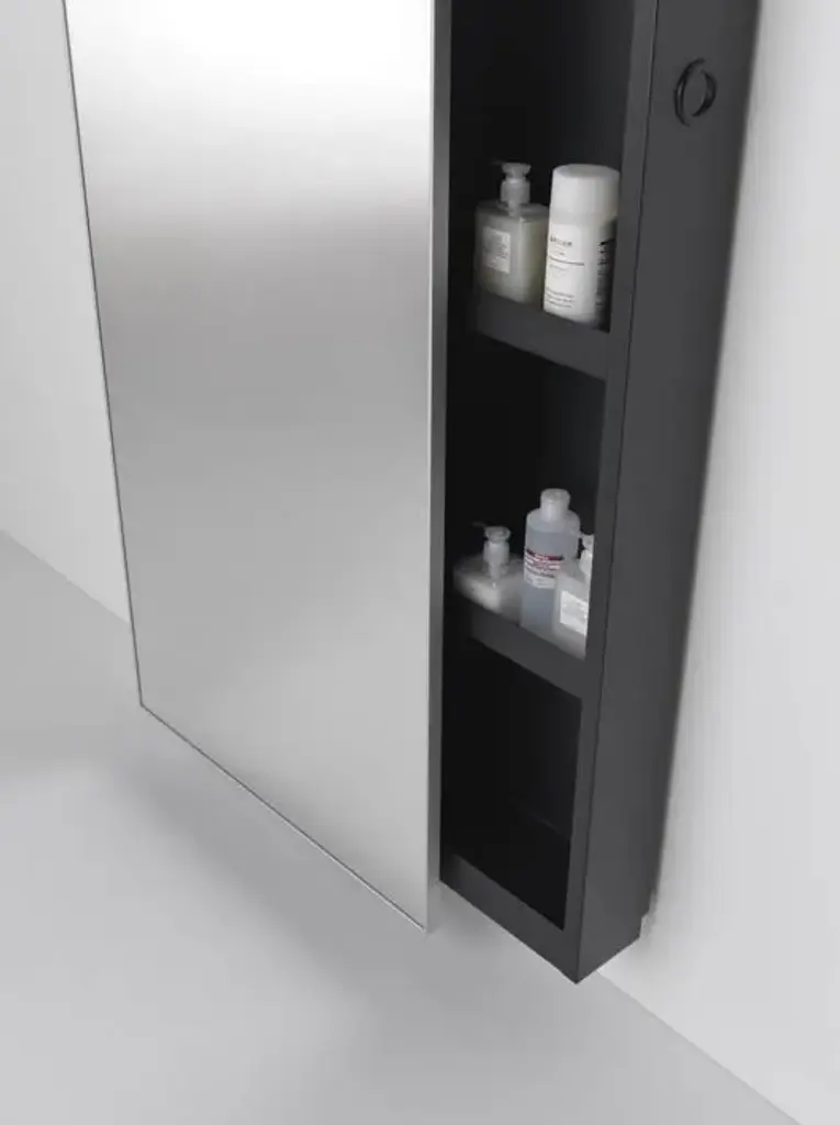 Mirror design evolves and integrates with new features. A fixed and safe mirror hides a metal storage container that slides left or right to reveal its contents. Customizable with adjustable shelves, this complement is a true “home backstage”, which can also become the star performer at centre stage.Lacquered sheet-iron structure and shelves. Mirror with non-machined edge, 4 mm thick, protected by self-adhesive polyethylene safety film. In the event of breakage, dangerous shards of glass do not come loose. Frame made from extruded anodized aluminium.FINISHBody/shelves: blackFrame: aluminium DIMENSIONS (LxDxH)cm 64x17x96 - 25.2” x 6.7” x 37.8”cm 64x17x192 - 25.2” x 6.7” x 75.6”