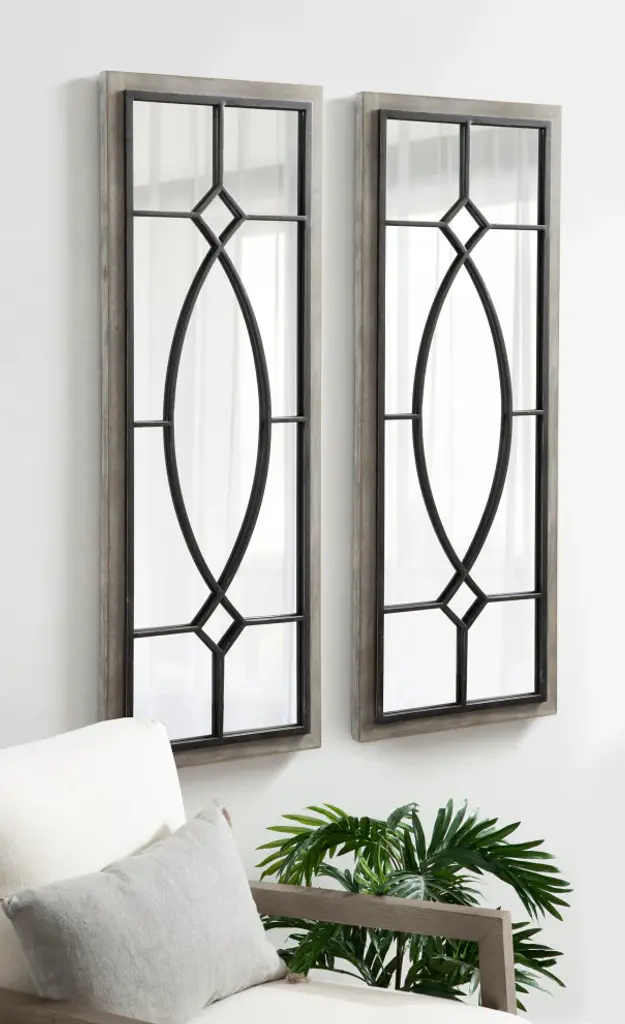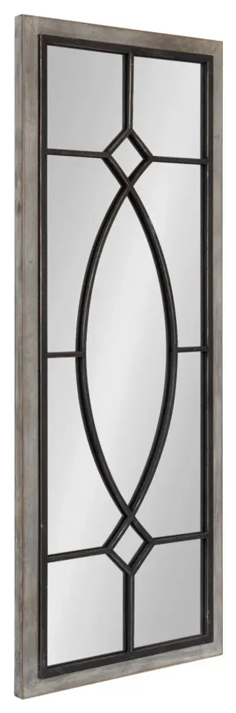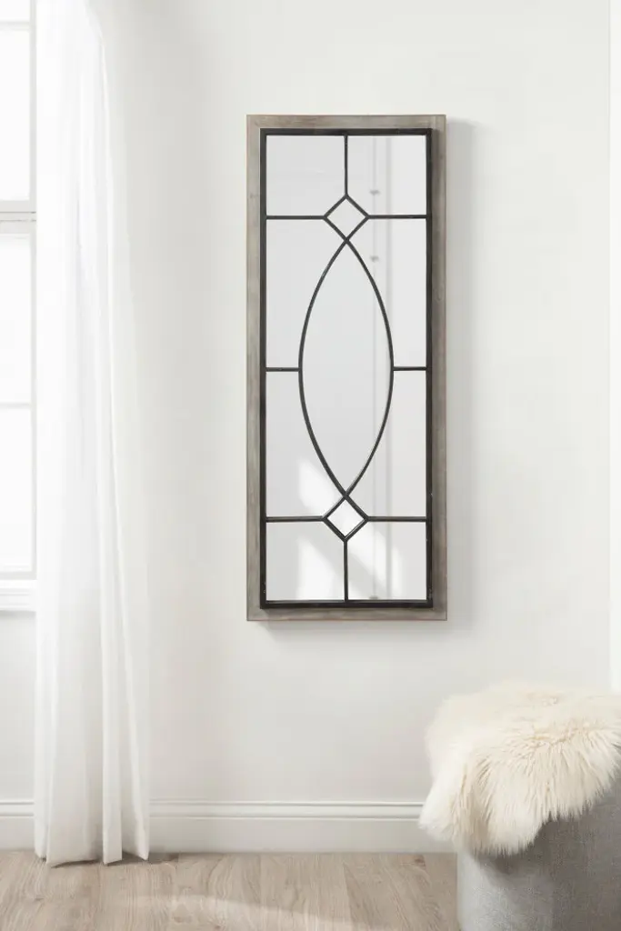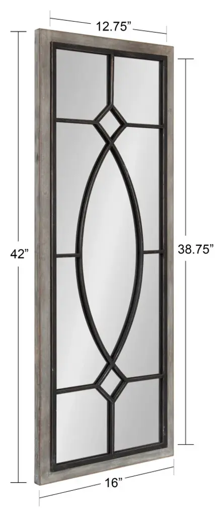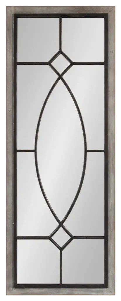 Indulge in a farmhouse aesthetic that transforms your home into a charming countryside chateau. The Bakersfield wall mirror takes inspiration from traditional windows, featuring an inlay incorporating geometric shapes and an elegant curvature. The metal inlay also has a vintage iron finish to deliver a texture reminiscent of decades of antiquity. The exterior frame is also made from a robust wooden material, creating a resiliency that will stay brand new for years of display. Adding a mirror to your home not only showcases your decorative aesthetics but enhances your space by drawing in more light, effectively making it appear more open and spacious. The Bakersfield mirror creates a commanding farmhouse statement piece for any room of the home. Hang the Bakersfield wall mirror either vertically or horizontally, thanks to the convenient metal D-ring hangers that are securely attached to the back of its frame.- Elegant Look: As a sophisticated accent piece, the Bakersfield wall mirror offers a beautiful design with a farmhouse window-inspired aesthetic, featuring a metal overlay that enhances your space with elegant curves and geometry- Quality Materials: This wall mirror features a blend of robust wooden material that is distressed by hand for the ultimate farmhouse look, completed by the metal inlay with a vintage iron finish- Large Size: The overall dimensions are 16" wide by 42" tall, creating a commanding and eye-catching presence on any wall- Vibrant: Adding a mirror to your wall enhances your living space by spreading more light, creating a more vibrant and dimensional area that feels more inviting and spacious- Easy to Hang: Use the metal D-ring hangers attached to the back of the frame to vertically or horizontally