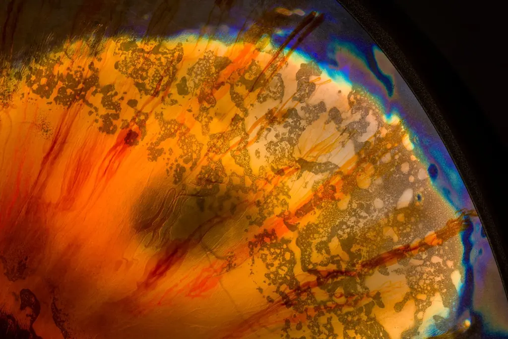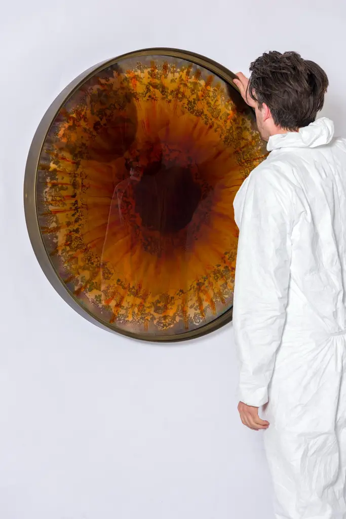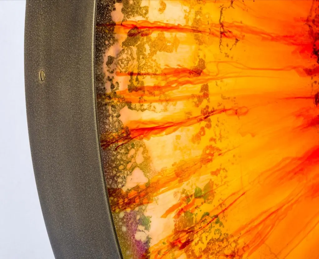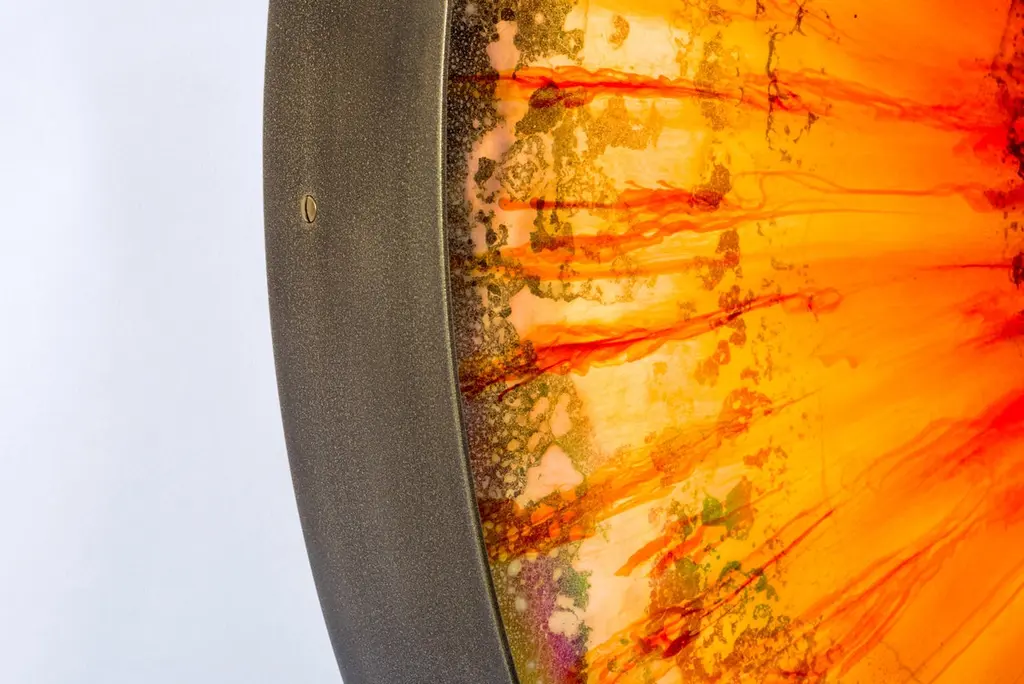 Aegean Iris mirror by Tom PalmerDimensions: D 120 x H 5 cmMterials: Glass, ResinAlso Available: Other sizes and variations available.The Iris mirrors are hand cast in a high grade Polyurethane Industrial resin that can be tinted to almost any colour. This resin is highly resistant to UV and environmental damage. I find that natural tones, blue, green / aqua tones and earth colours tend to work best and refract the light in really interesting ways. A test casts in a black / greysmoke is looking really promising.This cast convex lens is polished and coated in a protective lacquer coating before being layered over a hand silvered mirror disk.Tom Palmer (b 1986) is an Artist whose work ranges from individual pieces for private clients, to bespoke installations for international interior designers and architects. Much of Tom’s work has been informed by his ability to work with an ever-expanding range of materials and skills both ancient and contemporary. He has a particular fascination in the world of Medieval and Renaissance Europe but also the aesthetic and art of later Japanese makers and artists. He takes inspiration from functional objects as well as religious and Fine art. A brief overview of some recent pieces gives the best insight into Tom’s astonishing range. As well as working on his own pieces, Tom has developed and created specific elements for many projects on a more architectural scale for both private and industry clients. In recent years he has been called upon to create often deeply textural pieces using everything from timeless ‘noble’ materials such as stone and bronze to newly emerging Industrial composites.Tom is included in the prestigious Homo Faber Guide of craftsmanship compiled by the Michelangelo Foundation.