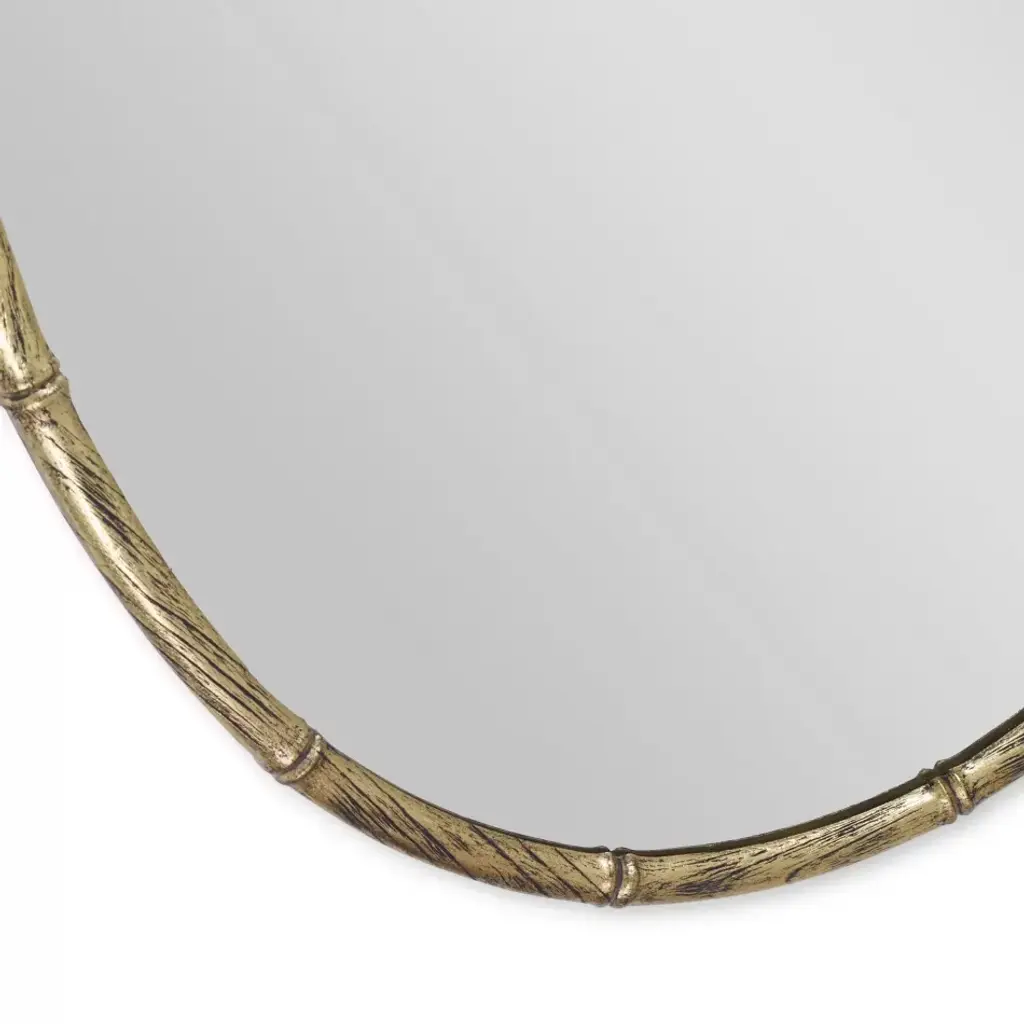 This oval mirror is surrounded by a faux bamboo frame finished in antique gold leaf. Includes a cleat for ease of installation.