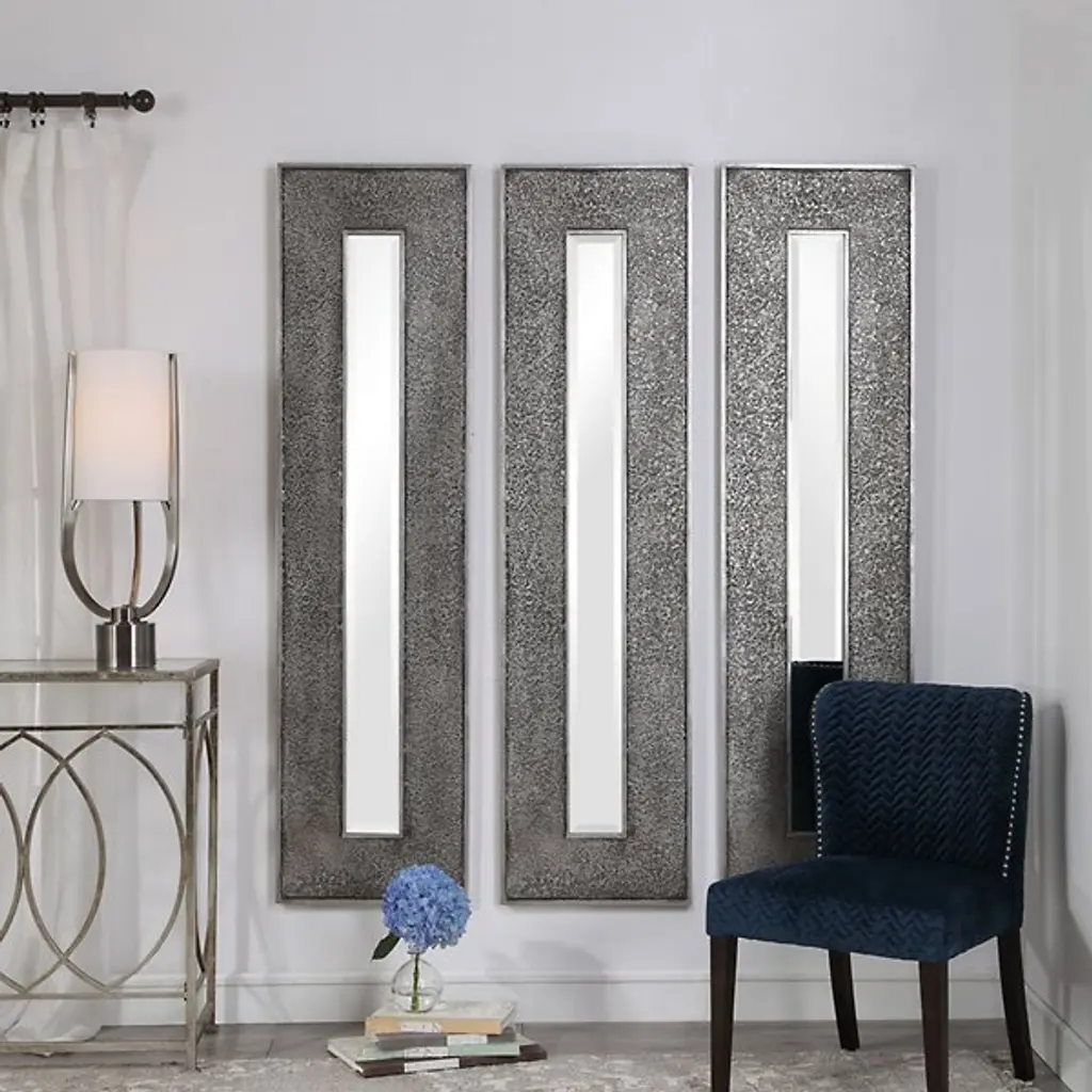 The Bannon Tall Wall Mirror from Uttermost, created by David Frisch, introduces an unconventional approach to mirror design. Its rectangular profile features a densely patterned surface that catches light differently throughout the day. The proportions make it particularly effective in hallways and transitional spaces. Multiple Bannon Tall Wall Mirrors can be arranged together to create larger compositions, each piece contributing its own character to the grouping.