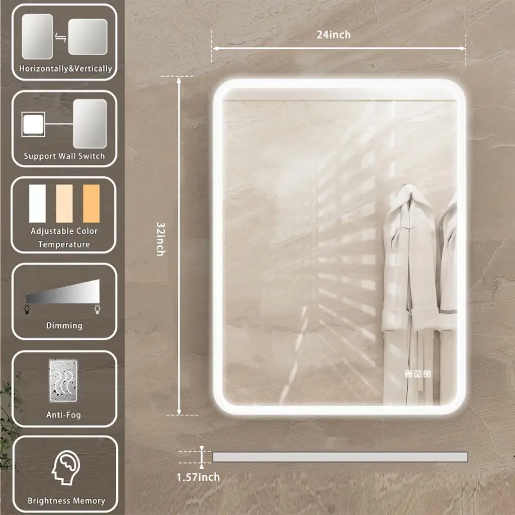 Baoure 24x32 Inch Rectangular Dimmable Anti-fog Led Wall Bathroom Iron Framed Vanity Mirror For Bathroom