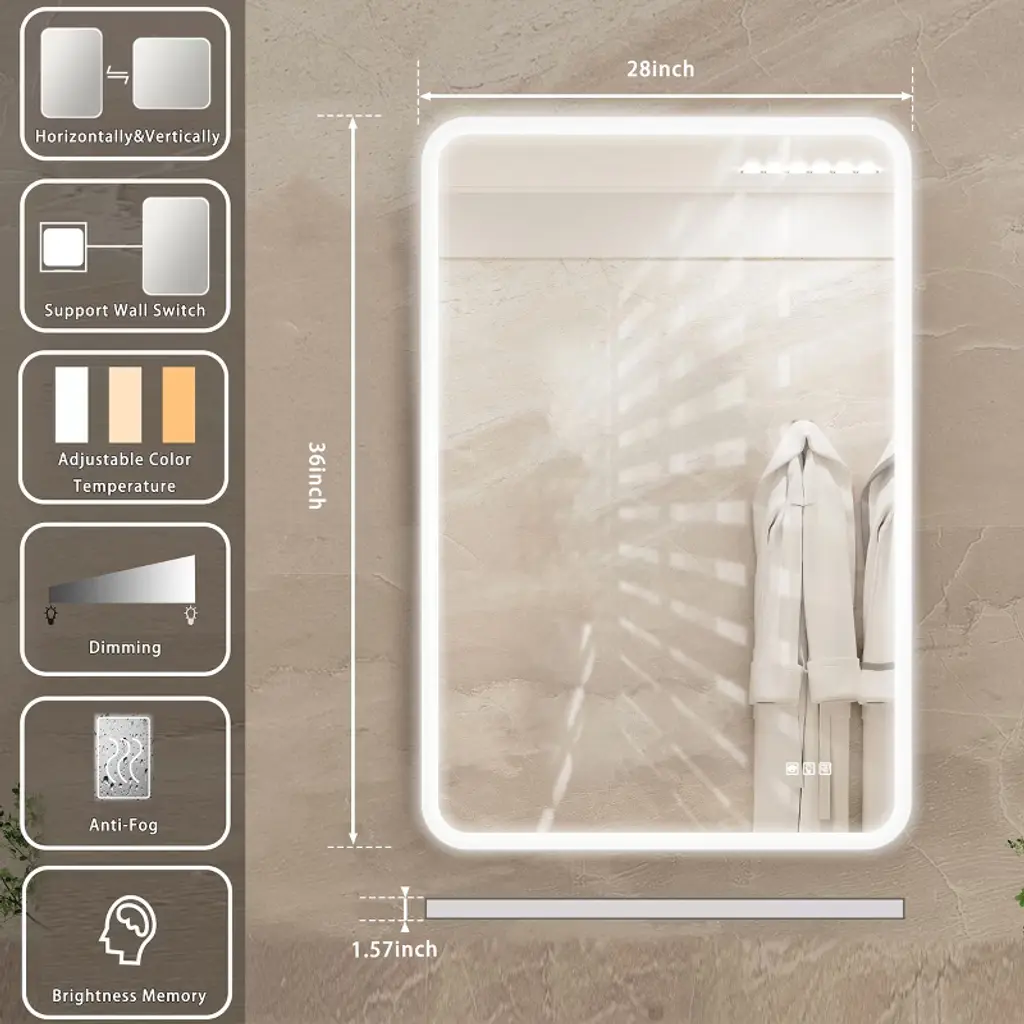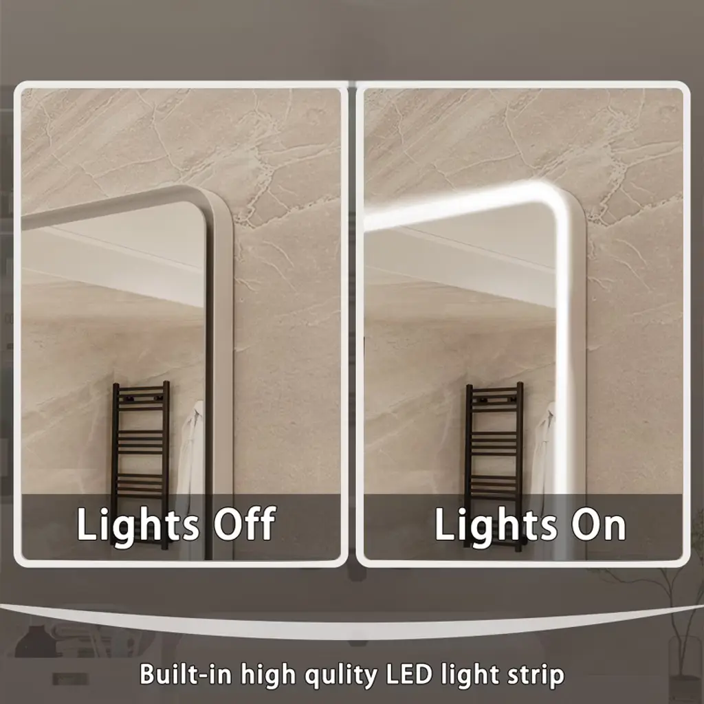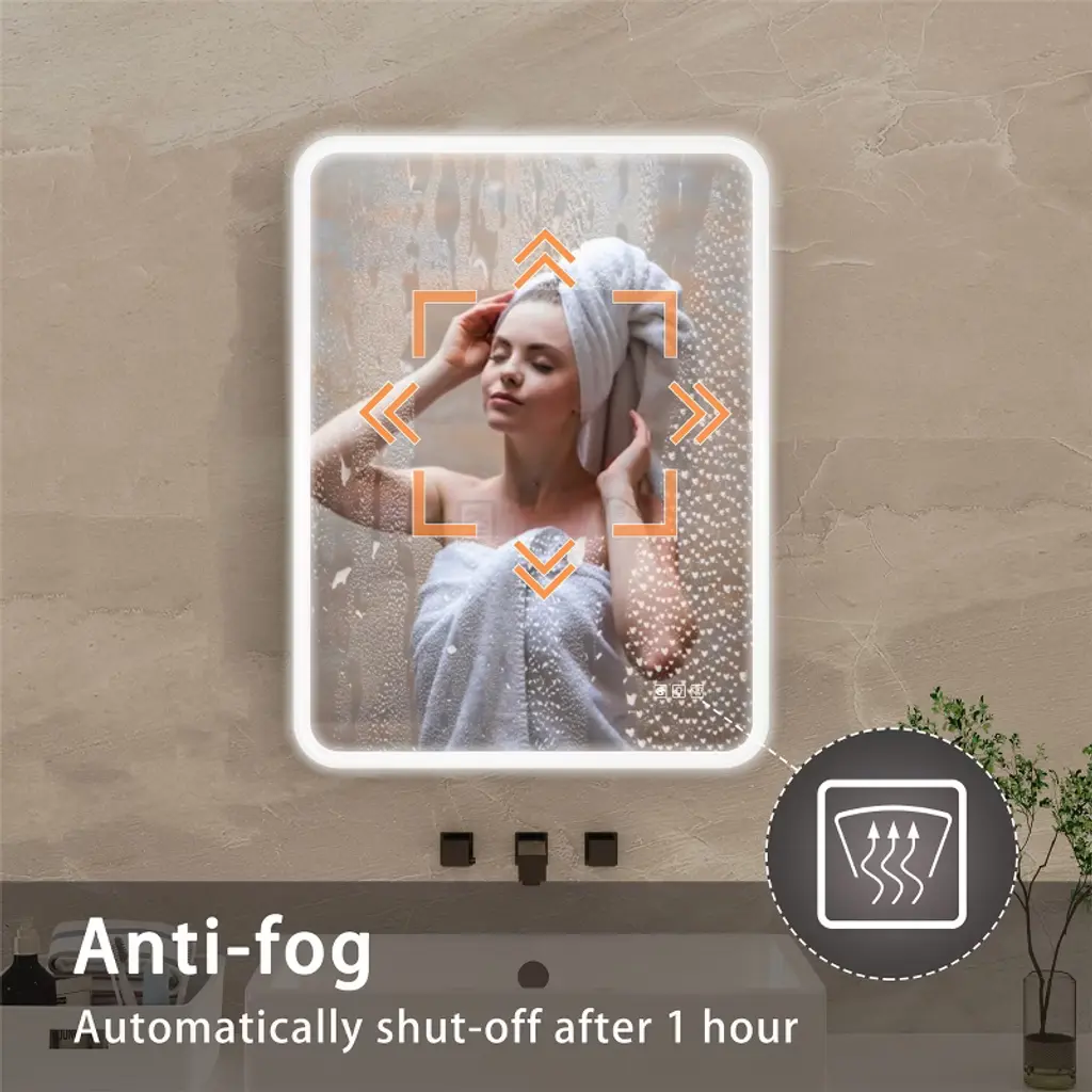 Defogging function and 3-colour changing lightFinger press three times can switch three lights, long press can adjust the brightness of the light. There is also a button is the fog function, can ensure that the mirror is not fog, keep clear.Strong anti-oxidation performance, corrosion resistance is not easy to blackenAntioxidant performance than the traditional copper-free silver mirror to enhance the three times, is the ordinary silver mirror 9 times, aluminium mirrors 27 times, the mirror surface is more translucent. Multi-layer protection, more durable.Upgraded Iron Optical LampshadeThe structure is safer than ordinary ones, constant voltage will not flash frequently, and the overall light effect is more three-dimensional.