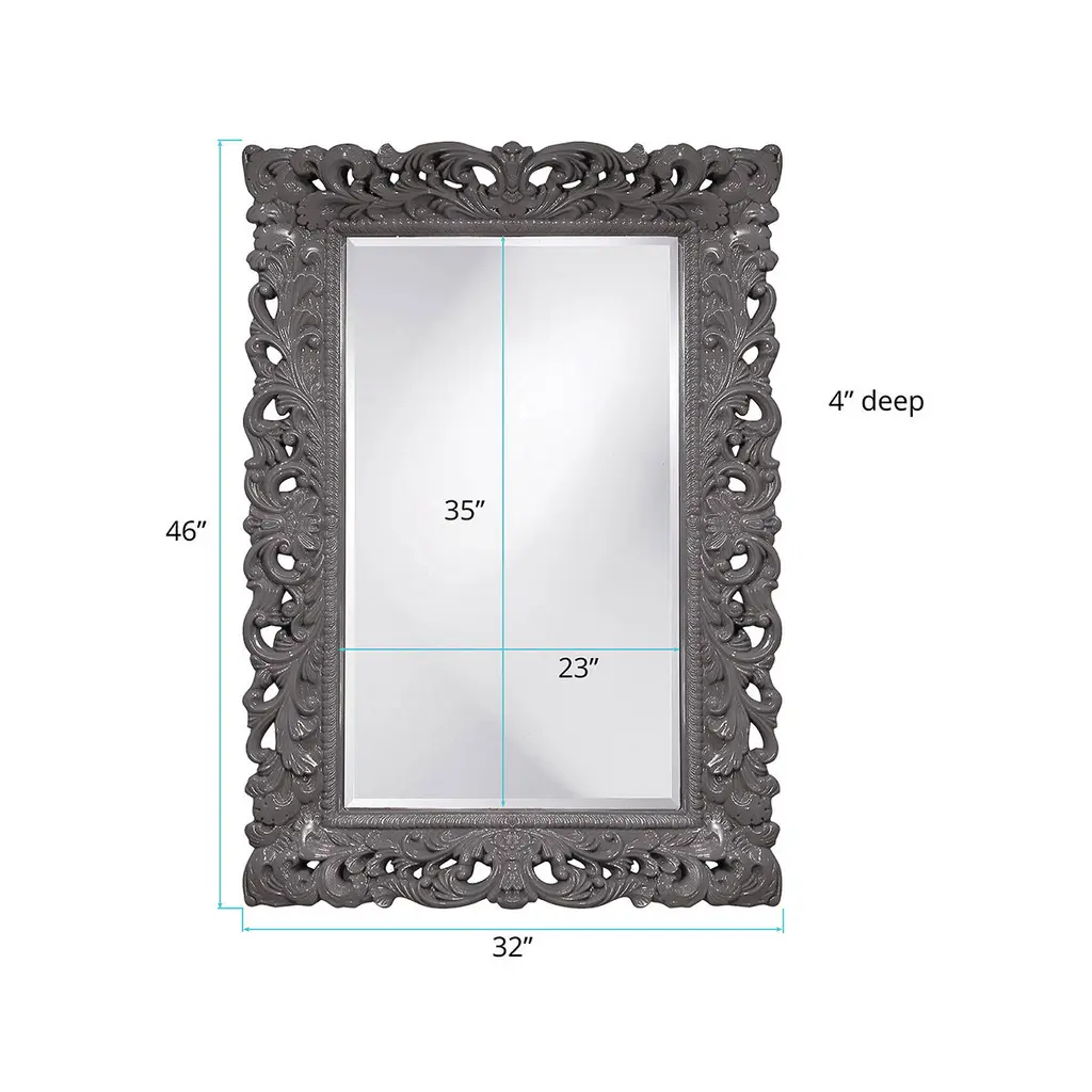 The Barcelona Mirror features an ornate rectangle frame complete with scrolls and flourishes. It is then finished in our custom glossy charcoal gray lacquer. The Barcelona Mirror is a perfect focal point for an entryway, bathroom, bedroom or any room in your home. D-rings are affixed to the back of the mirror so it is ready to hang right out of the box in either a horizontal or vertical orientation! The mirrored glass on this piece has a bevel adding to its beauty and style. The Barcelona Mirror is part of our custom paint program and is available in one of fourteen vivid colors. It is proudly painted in the USA.