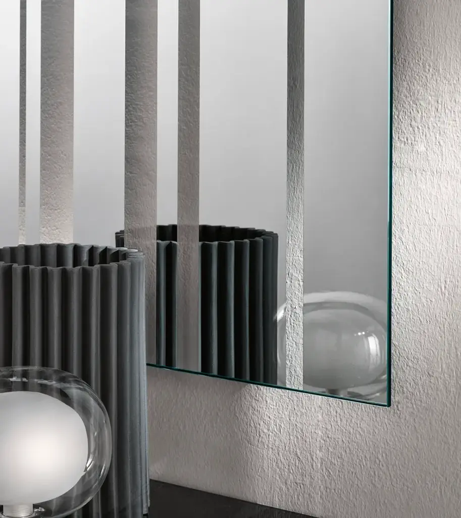 Wall mirror made of a glass panel with mirrored bands alternating with transparent bands. Available in various sizes and shapes offering a high compositional freedom.