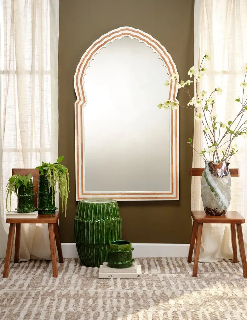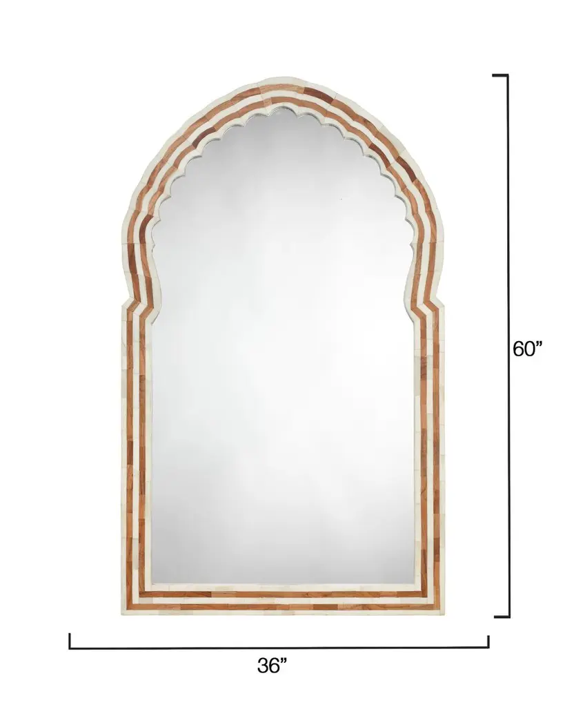 As glamorous as its namesake, this intricately embellished mirror is a little mysterious and a lot glamorous, with a design inspired by both 1930’s Hollywood and the Taj Mahal. A take on the traditional pishtaq arch, it features an expertly hand carved inlay of buffalo bone and acacia wood. It is beautifully crafted and certain to become a family heirloom.