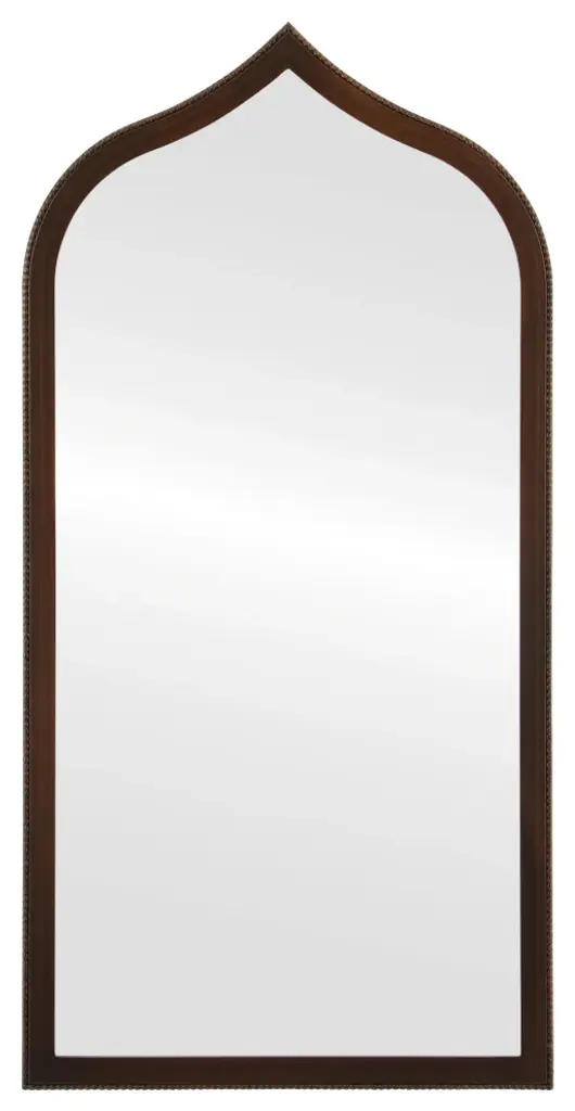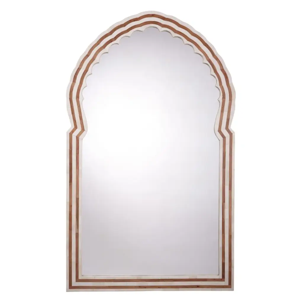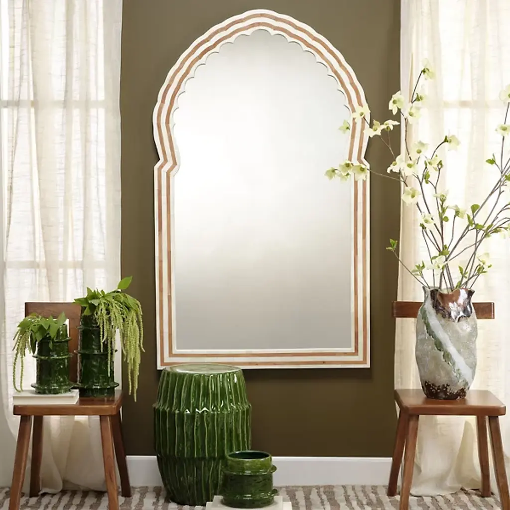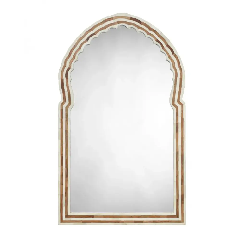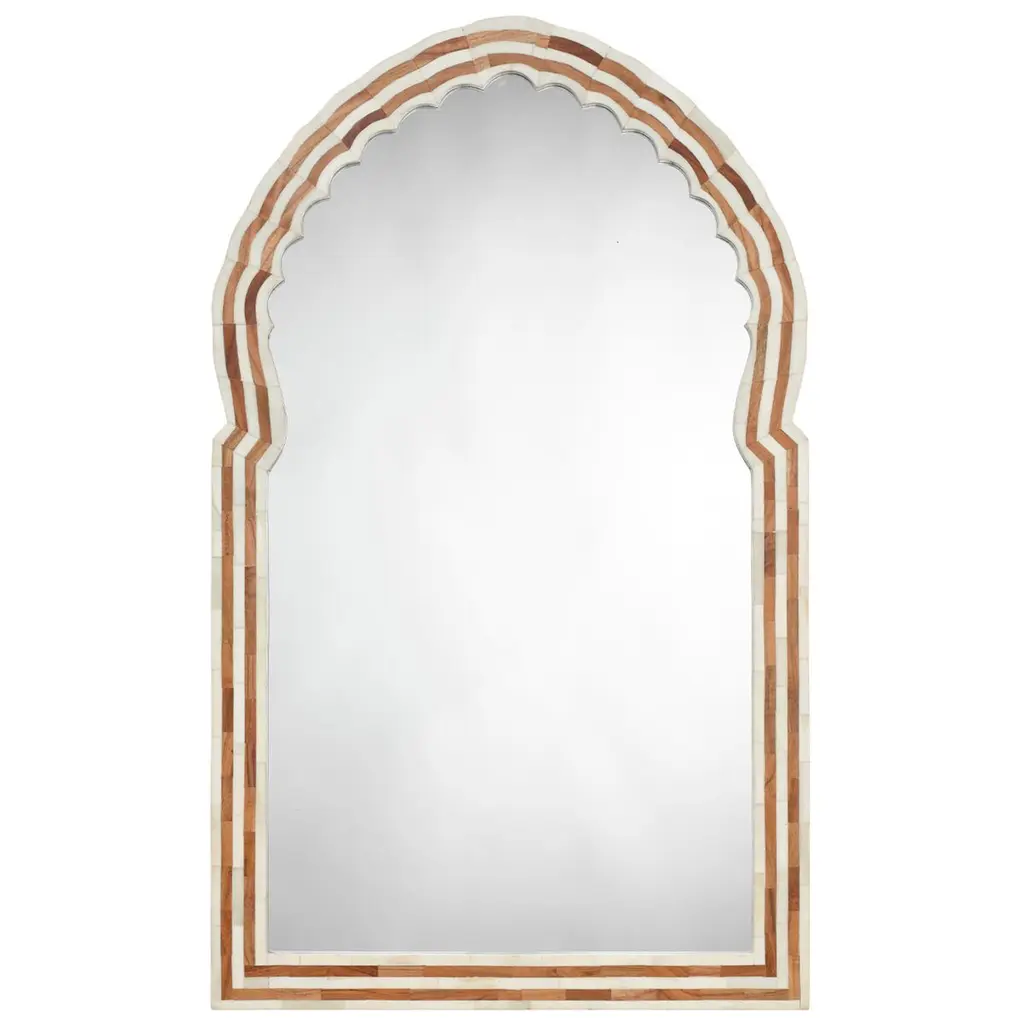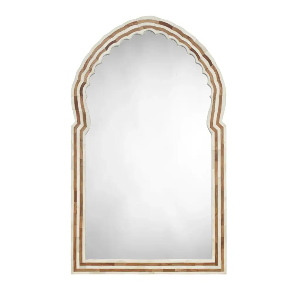 The Bardot Large Bone and Wood Mirror from Jamie Young Co. unites Hollywood glamour with Mughal architecture. The design refashions the traditional Pishtaq arch through masterful inlay work combining buffalo bone with acacia wood. The mirror’s non-beveled glass provides clear reflections while letting the frame's artistry take center stage. Versatile mounting options allow for vertical display, making it suitable for grand entryways or statement walls. The fusion of materials and techniques results in a distinctive piece that enhances sophisticated interiors while maintaining timeless appeal.