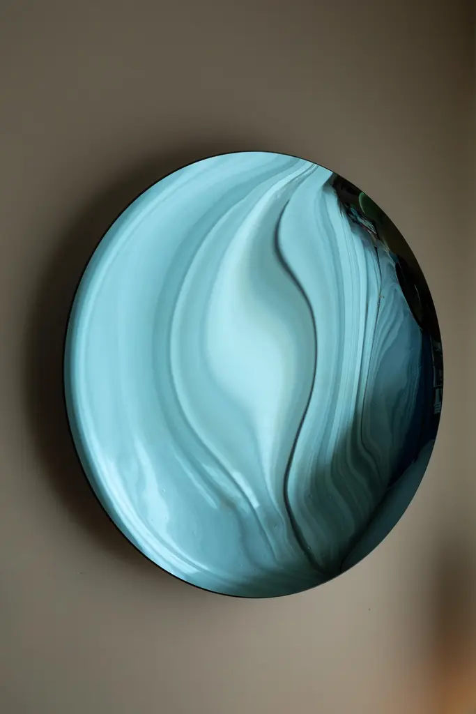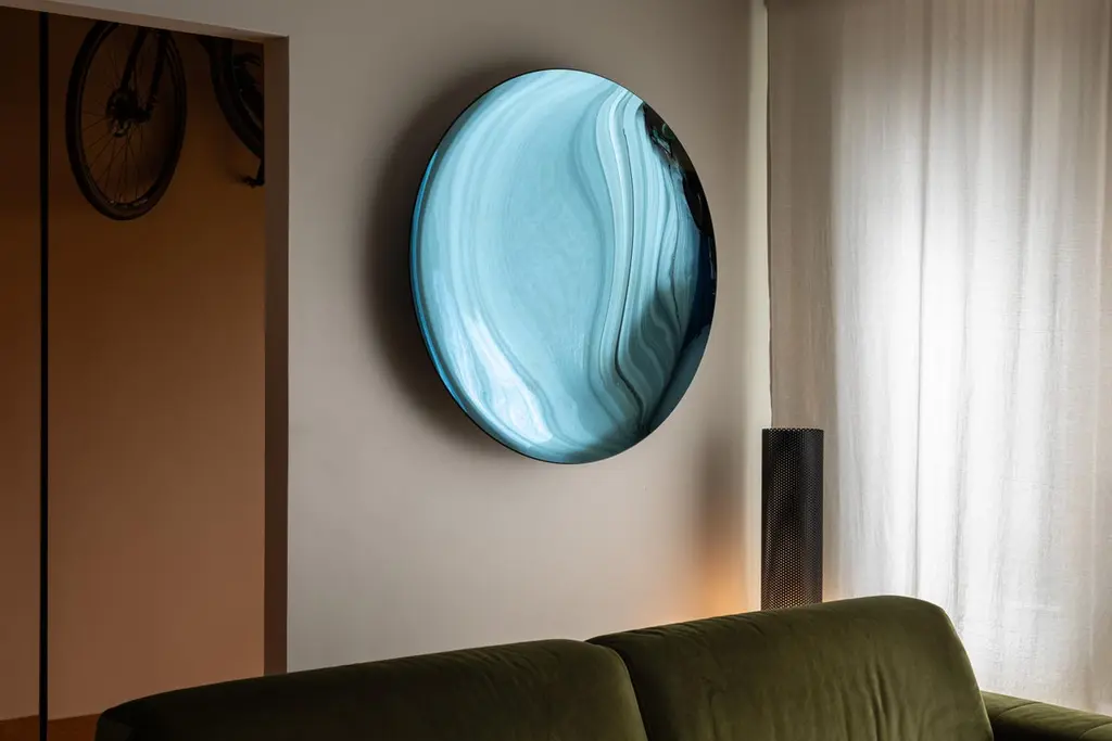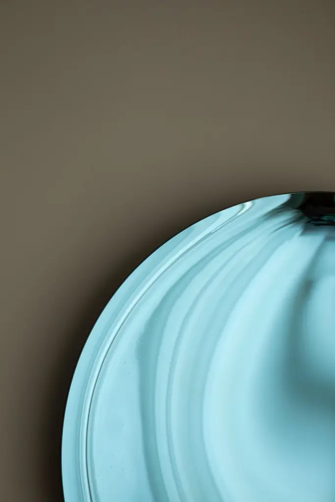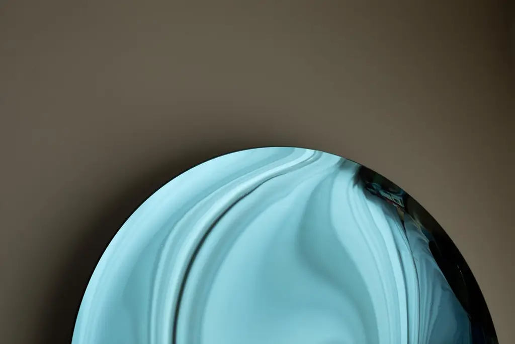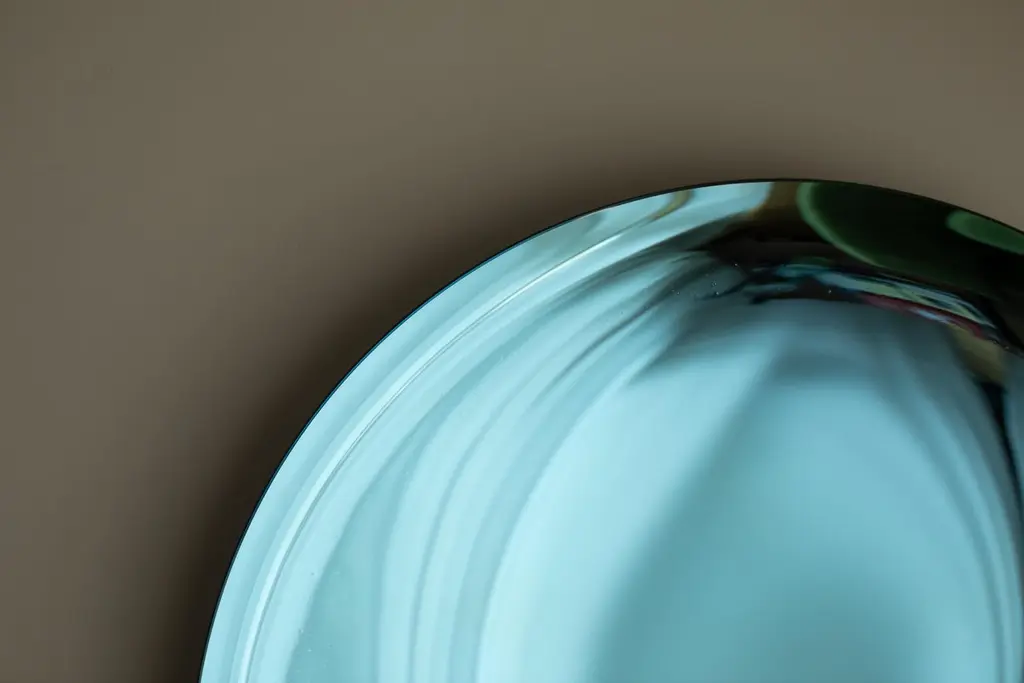 Bare Blue Wall Mirror by OOM Contemporary GlassDimensions: Ø 95 cm.Materials: Silver nitrate on 6 mm dark blue curved glass.Discover the Dome Collection, where glass artistry meets innovative design. This unique series features both plain and hand-painted curved mirrors, masterfully crafted using Murano Glass combined with ceramic enamels and metallic lusters. Drawing inspiration from the dynamic world of contemporary design, the Dome Collection redefines the boundaries of creativity and craftsmanship.BAREShowcasing the pure elegance of silver combined with glass in different shades of colors, these pieces embody simplicity and sophistication, achieving an astonishing visual effect through their refined, minimalist design.At OOM, we believe in the transformative power of artisanal craftsmanship and the enduring beauty of design glass.Since 1987, we’ve been dedicated to crafting exquisite pieces that seamlessly blend contemporary design with traditional techniques, resulting in objects that elevate spaces to an unparalleled level of beautyand sophistication. At OOM, we believe in the transformative power of artisanal craftsmanship and the enduring beauty of design glass.Rooted in the rich heritage of Venice, our journey began in 1987, driven by a passion for creating extraordinary glassworks that capture the essence of contemporary design. Each OOM piece is a testament to our dedication to quality, heritage, and innovation.