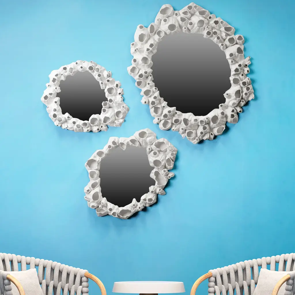 Elegantly cling on to the beauty of the ocean with the Barnacle Mirror from Kenneth Cobonpue. Ride the tides effortlessly, as intricate clusters of marine life patterns and shapes are unveiled. Let the glimmering reflection of the sea transport you back to sunny summer days, ready to enhance any space with nature-inspired beauty. Highlights