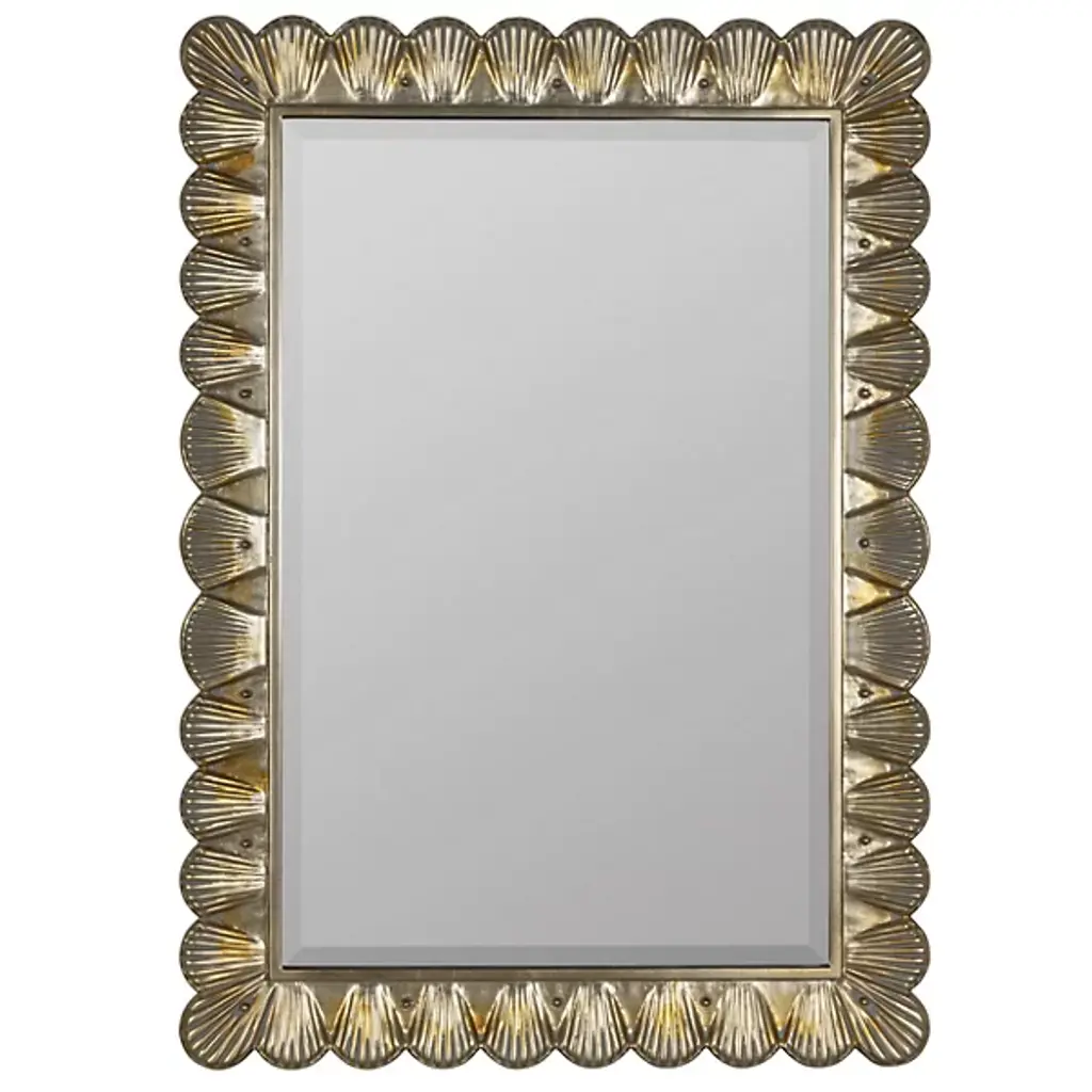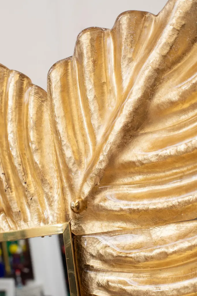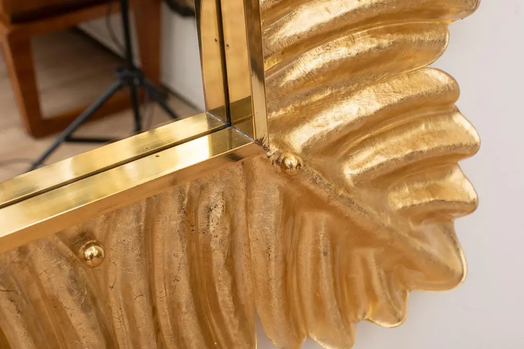 Barocco style gilded leaf Murano glass mirror, Italy in stockRectangular mirror plate surrounded with undulating leaf form glass tiles gold leafed held by brass cabochons.Handcrafted by a team of artisans in Venice, Italy.Can be easily hung vertically or horizontally with metal hanging bracket on back. Weight Lbs 50.Pair availableLocated in our store in Miami ready for shipping.