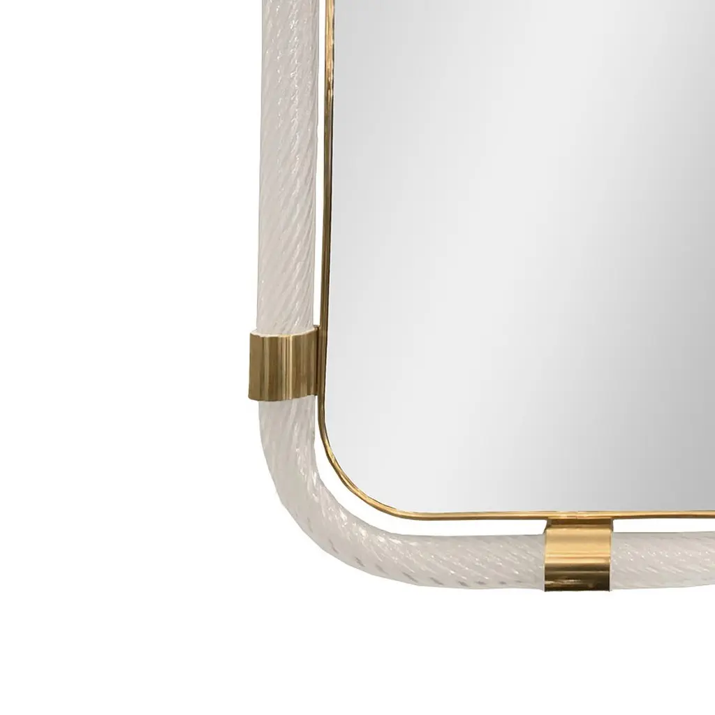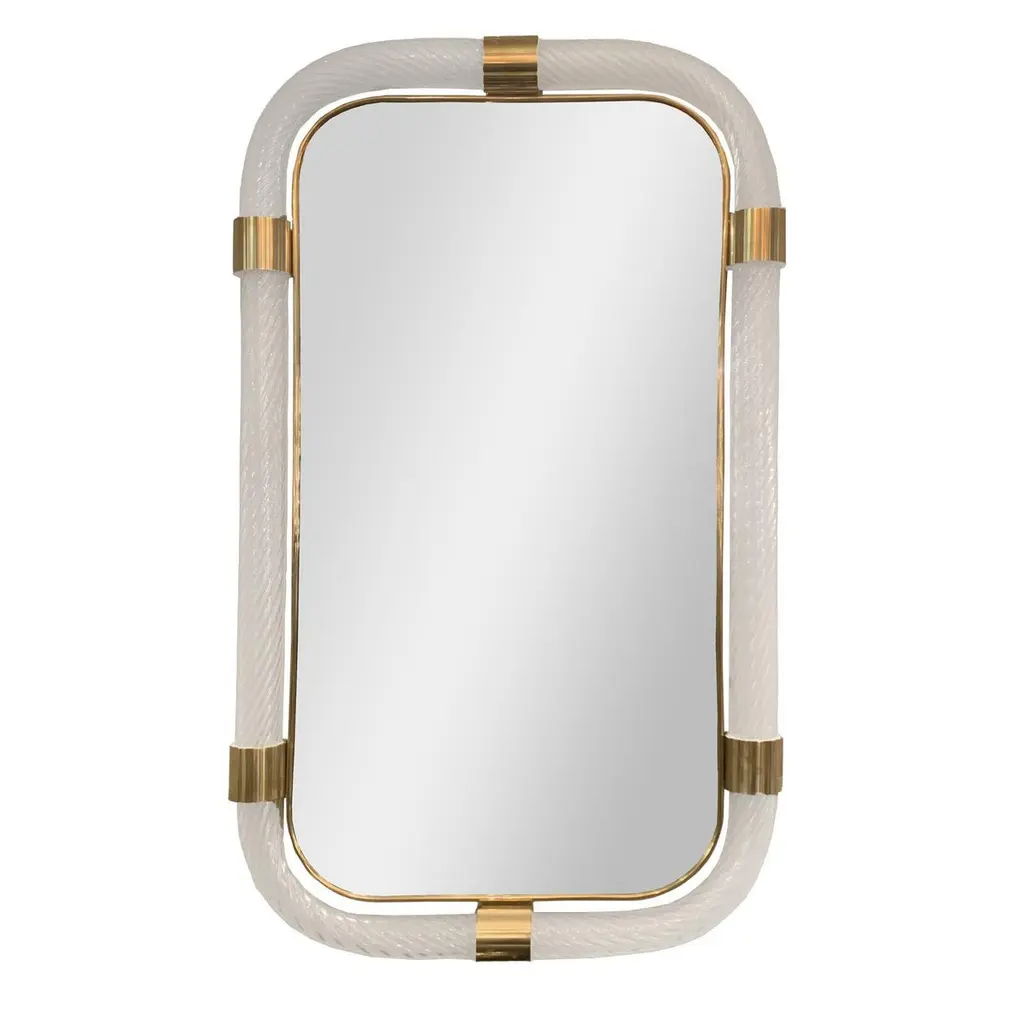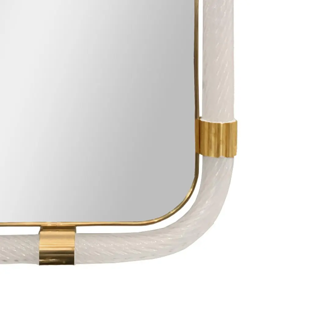 Elegant Murano twisted glass rectangular mirror with radial corners and brackets in polished brass. Inspired by the artistry of Angelo Barovier. Italy, 2022.