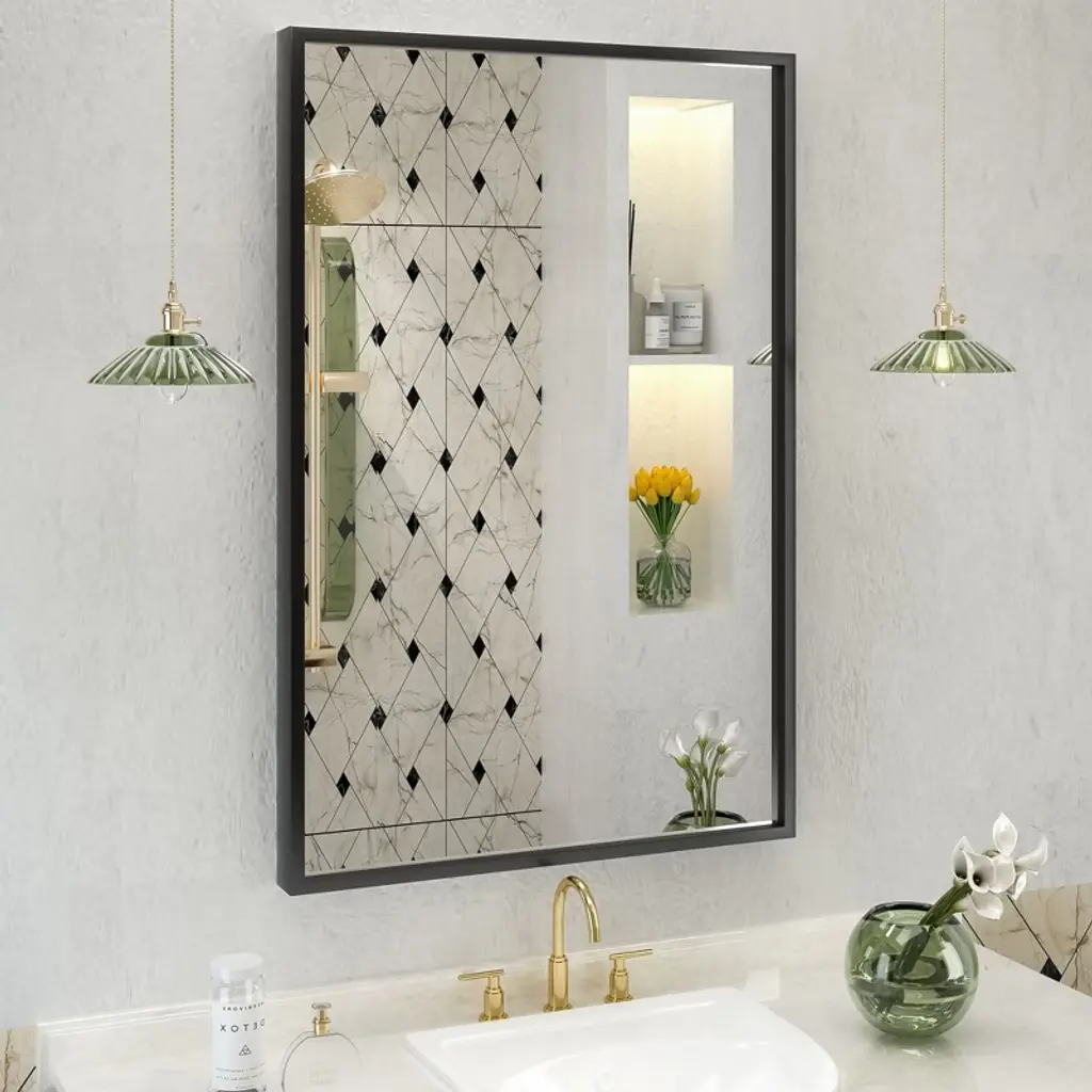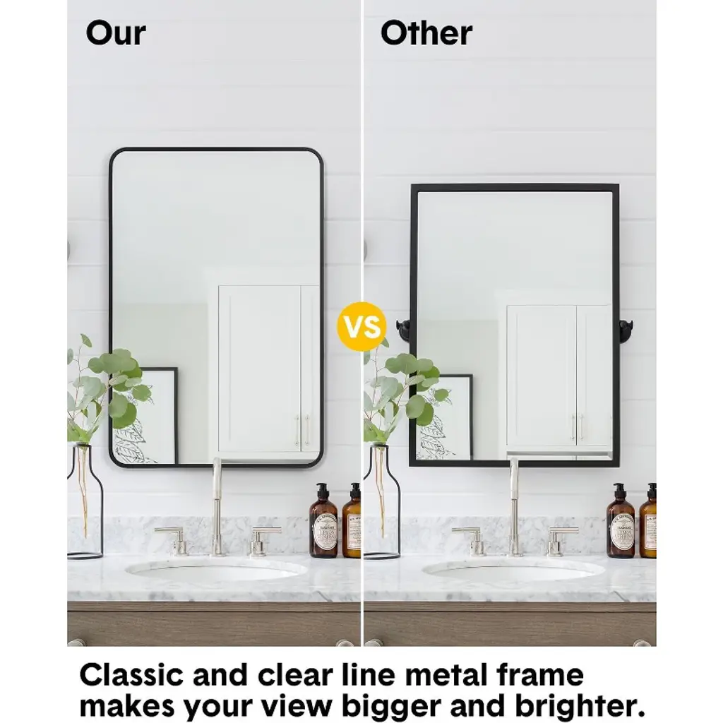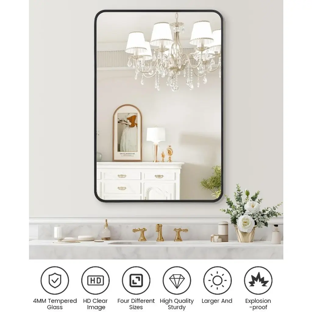 Bathroom Mirror 24x36 Inch, Black Framed Vanity Mirror with Rounded CornersProduct Description:Elevate your bathroom with this sophisticated 24x36 Inch Vanity Mirror, featuring a sleek matte black metal frame with contemporary rounded corners. Designed for versatile installation, this mirror can be hung horizontally or vertically to perfectly fit your space and aesthetic preferences. Crafted with premium 5mm polished glass and explosion-proof safety features, it delivers crystal-clear, distortion-free reflections while ensuring durability and peace of mind. The modern design and flexible orientation make it an ideal centerpiece for bathrooms, bedrooms, and entryways.?Key Features:1. Dual-Orientation DesignMaximize flexibility with a mirror designed to hang both horizontally and vertically. The 24x36 inch dimensions work beautifully above single or double vanities when mounted horizontally, or create an elegant vertical statement in narrow spaces. This adaptable design allows you to customize the layout to your specific wall space and visual preferences.2. Premium 5mm Polished GlassExperience exceptional clarity with 5mm thick polished glass featuring sterling silver backing. This superior construction provides sharper, more accurate reflections than standard 4mm mirrors while offering enhanced durability. The explosion-proof quality ensures added safety for household use.3. Modern Matte Black FrameThe sturdy aluminum alloy frame features a matte black finish with precisely welded rounded corners for a contemporary look. The dust-resistant surface maintains its sleek appearance with minimal maintenance, while the durable construction withstands bathroom humidity without corrosion.4. Streamlined InstallationEnjoy quick and straightforward mounting with included hanging strips that support easy installation in just 3-5 minutes. The simple process allows for secure attachment to most wall surfaces without specialized tools, making it accessible for DIY installation while ensuring professional-looking results.5. Safety-Engineered ConstructionDesigned with multiple protective features including an explosion-proof membrane and secure drop-tested packaging. The comprehensive safety measures ensure safe delivery and reliable performance, providing confidence in both the product's durability and your household's safety.Specifications:? Dimensions: 24" x 36"? Frame Material: Aluminum Alloy? Frame Finish: Matte Black? Glass Thickness: 5mm? Frame Style: Rounded Corners? Installation: Horizontal or Vertical Mount? Safety Features: Explosion-Proof Membrane? Room Compatibility: Bathroom, Bedroom, Living Room, Hallway? Included: Hanging Strips? Style: Modern/Contemporary
