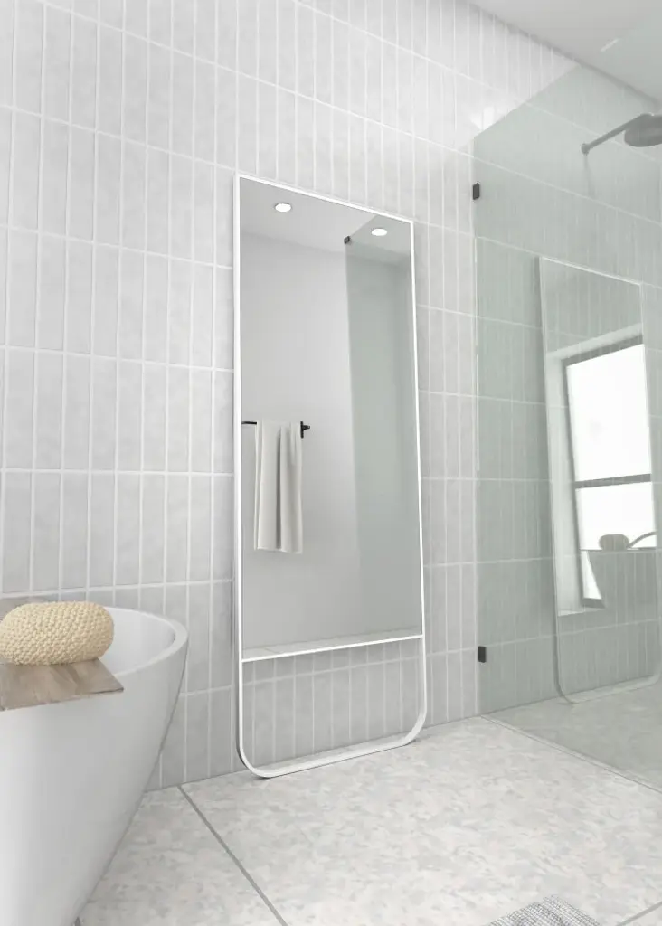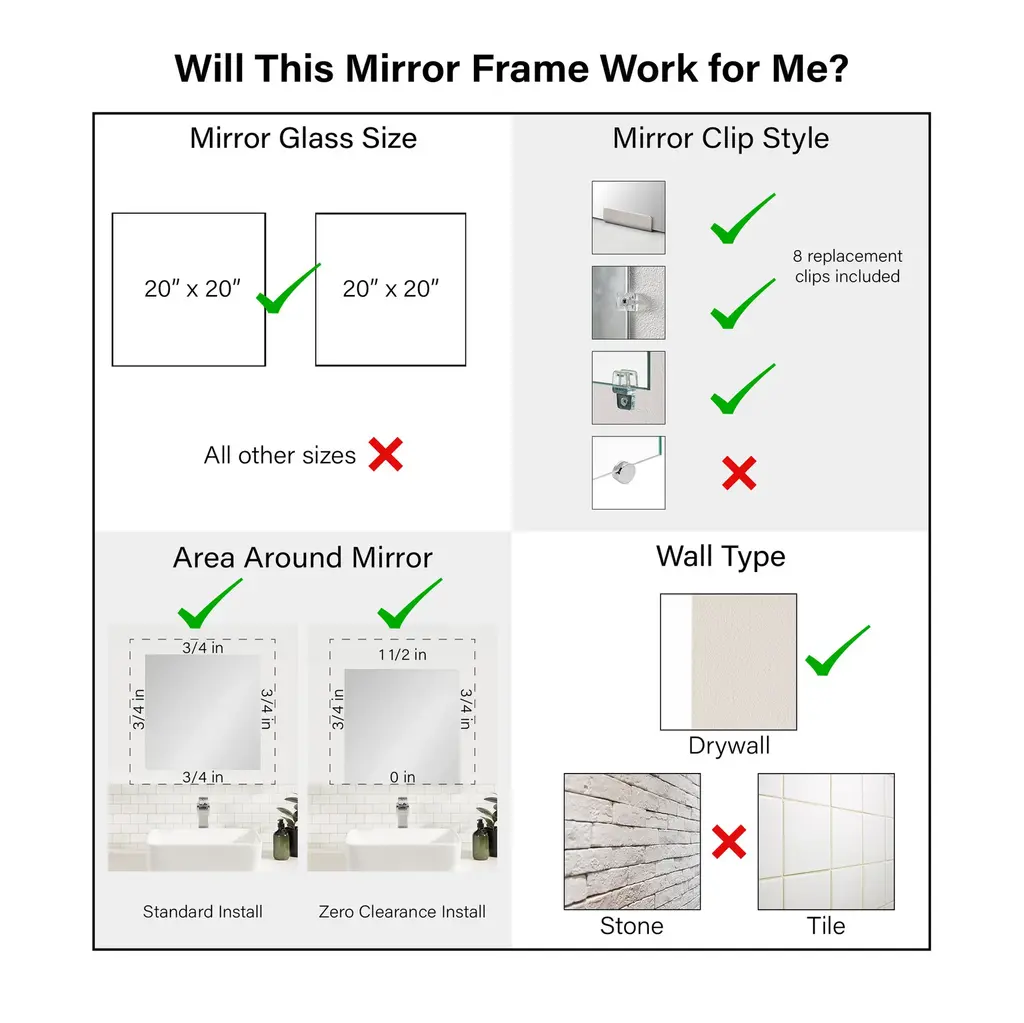 Upcycle your plain, unframed mirror into a stunning centerpiece with this Brushed Black mirror frame. Designed to be installed OVER your existing mirror glass, this frame effortlessly attaches without the hassle of removing the mirror from your wall. It's a seamless upgrade that breathes new life into your space, covers damaged edges, and can be removed with no trace. It's DIY with minimal effort and maximum impact. The Brushed Black frame is a satin black frame with a flat profile and light brush marks creating a slightly metallic appearance. It is 2 in. wide and stands 0.75 in. off the wall.Features:MIRROR MAKEOVER: Designed to be installed OVER your existing bare mirror, you can frame your bathroom mirror at home without removing it from the wall. Simply hang the fully assembled frame on the wall above your mirror and secure it to the mirror glass with the removable tape. The frame is not permanent and perfect for homeowners, renters, apartments, senior living, builders, and remodelers alike.INCLUDED IN KIT: Fully assembled waterproof bathroom mirror frame sized to work on a non-beveled frameless mirror, hanging hardware, nails, mounting tape, flush mount mirror replacement clips, plus paper and video installation instructions. Actual mirror glass is not included. Everything you need is included to hang, peel, and stick this frame to your existing mirror for an instant upcycle. It's the simplest DIY decor upgrade ever!SIZING INFORMATION: This frame fits on a non-beveled frameless mirror only - MIRROR GLASS NOT INCLUDED. Hangs both vertically and horizontally.SPACE REQUIREMENTS FOR INSTALLATION: The frame will overhang the glass .75 inches on all sides to conceal the edges, including unsightly water damage and mirror clips. If your glass rests directly on a backsplash or counter, the frame requires 1.5" on the top edge to accommodate this.REMOVEABLE AND WATERPROOF: The Brushed Black Frame is a satin black frame with a flat profile and light brush marks creating a slightly metallic appearance. It's fully removable from the glass after use and is made of a recycled polystyrene plastic core decorated with a durable, colorfast finish to withstand regular bathroom cleaning. It's also waterproof and proven for home and commercial use.ASSEMBLED IN THE USA: Each piece is assembled to order in Madison, WI USA