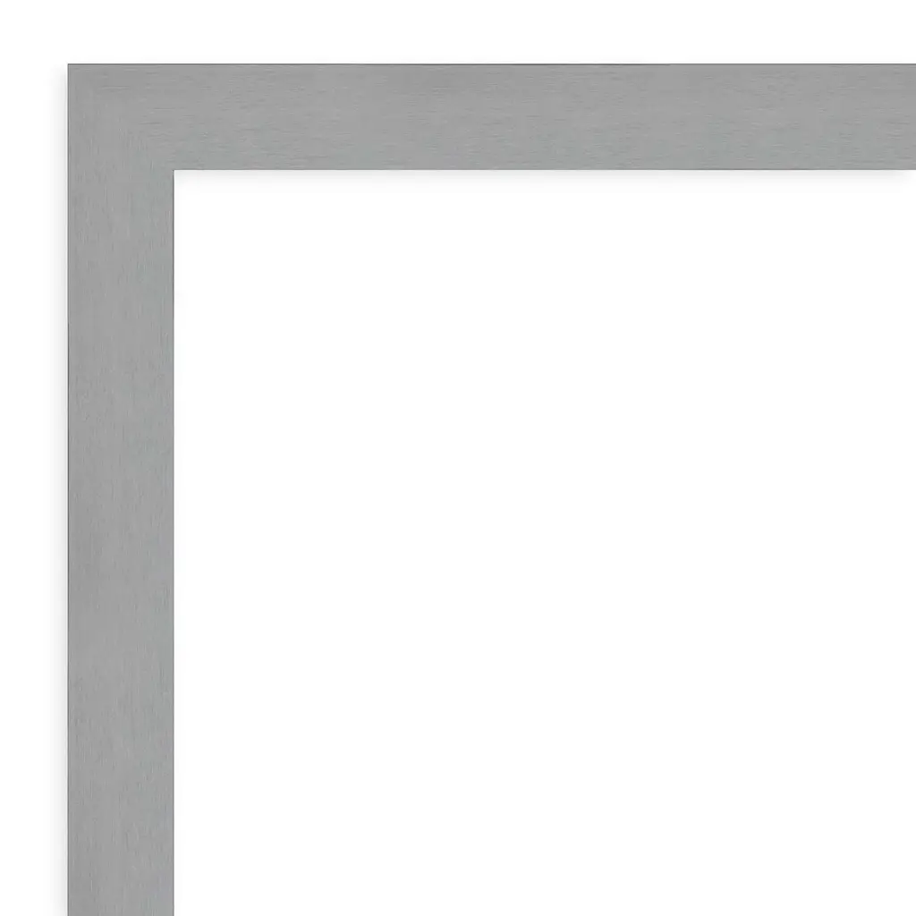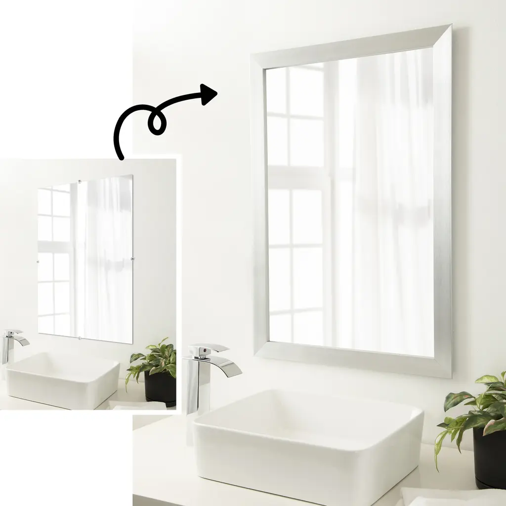 Upcycle your plain, unframed mirror into a stunning centerpiece with this Brushed Nickel mirror frame. Designed to be installed OVER your existing mirror glass, this frame effortlessly attaches without the hassle of removing the mirror from your wall. It's a seamless upgrade that breathes new life into your space, covers damaged edges, and can be removed with no trace. It's DIY with minimal effort and maximum impact. The Brushed Nickel frame is a contemporary, brushed, light silver frame with a flat profile, metallic sheen, and minimalist shape. It is 2 in. wide and stands 0.75 in. off the wall.Features:MIRROR MAKEOVER: Designed to be installed OVER your existing bare mirror, you can frame your bathroom mirror at home without removing it from the wall. Simply hang the fully assembled frame on the wall above your mirror and secure it to the mirror glass with the removable tape. The frame is not permanent and perfect for homeowners, renters, apartments, senior living, builders, and remodelers alike.INCLUDED IN KIT: Fully assembled waterproof bathroom mirror frame sized to work on a non-beveled frameless mirror, hanging hardware, nails, mounting tape, flush mount mirror replacement clips, plus paper and video installation instructions. Actual mirror glass is not included. Everything you need is included to hang, peel, and stick this frame to your existing mirror for an instant upcycle. It's the simplest DIY decor upgrade ever!SIZING INFORMATION: This frame fits on a non-beveled frameless mirror only - MIRROR GLASS NOT INCLUDED. Hangs both vertically and horizontally.SPACE REQUIREMENTS FOR INSTALLATION: The frame will overhang the glass .75 inches on all sides to conceal the edges, including unsightly water damage and mirror clips. If your glass rests directly on a backsplash or counter, the frame requires 1.5" on the top edge to accommodate this.REMOVEABLE AND WATERPROOF: The Brushed Nickel Frame is a contemporary, brushed, light silver frame with a flat profile, metallic sheen, and minimalist shape. It's fully removable from the glass after use and is made of a recycled polystyrene plastic core decorated with a durable, colorfast finish to withstand regular bathroom cleaning. It's also waterproof and proven for home and commercial use.ASSEMBLED IN THE USA: Each piece is assembled to order in Madison, WI USA