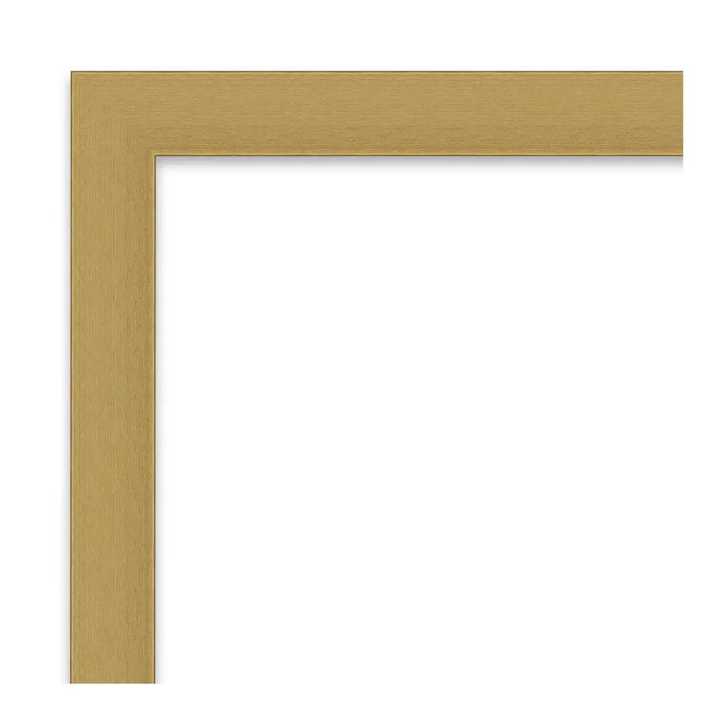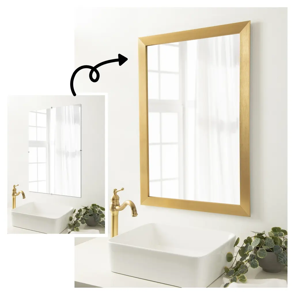 Upcycle your plain, unframed mirror into a stunning centerpiece with this Grace Brushed Gold mirror frame. Designed to be installed OVER your existing mirror glass, this frame effortlessly attaches without the hassle of removing the mirror from your wall. It's a seamless upgrade that breathes new life into your space, covers damaged edges, and can be removed with no trace. It's DIY with minimal effort and maximum impact. The Grace Brushed Gold frame is a brushed gold frame with a flat surface and smooth matte finish. It is 2 in. wide and stands 0.75 in. off the wall.Features:MIRROR MAKEOVER: Designed to be installed OVER your existing bare mirror, you can frame your bathroom mirror at home without removing it from the wall. Simply hang the fully assembled frame on the wall above your mirror and secure it to the mirror glass with the removable tape. The frame is not permanent and perfect for homeowners, renters, apartments, senior living, builders, and remodelers alike.INCLUDED IN KIT: Fully assembled waterproof bathroom mirror frame sized to work on a non-beveled frameless mirror, hanging hardware, nails, mounting tape, flush mount mirror replacement clips, plus paper and video installation instructions. Actual mirror glass is not included. Everything you need is included to hang, peel, and stick this frame to your existing mirror for an instant upcycle. It's the simplest DIY decor upgrade ever!SIZING INFORMATION: This frame fits on a non-beveled frameless mirror - MIRROR GLASS NOT INCLUDED. Hangs both vertically and horizontally.SPACE REQUIREMENTS FOR INSTALLATION: The frame will overhang the glass .75 inches on all sides to conceal the edges, including unsightly water damage and mirror clips. If your glass rests directly on a backsplash or counter, the frame requires 1.5" on the top edge to accommodate this.REMOVEABLE AND WATERPROOF: The Grace Brushed Gold Frame is a brushed gold frame with a flat surface and smooth matte finish. It's fully removable from the glass after use and is made of a recycled polystyrene plastic core decorated with a durable, colorfast finish to withstand regular bathroom cleaning. It's also waterproof and proven for home and commercial use.ASSEMBLED IN THE USA: Each piece is assembled to order in Madison, WI USA