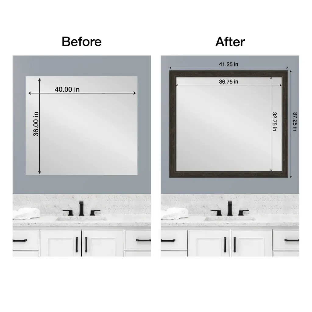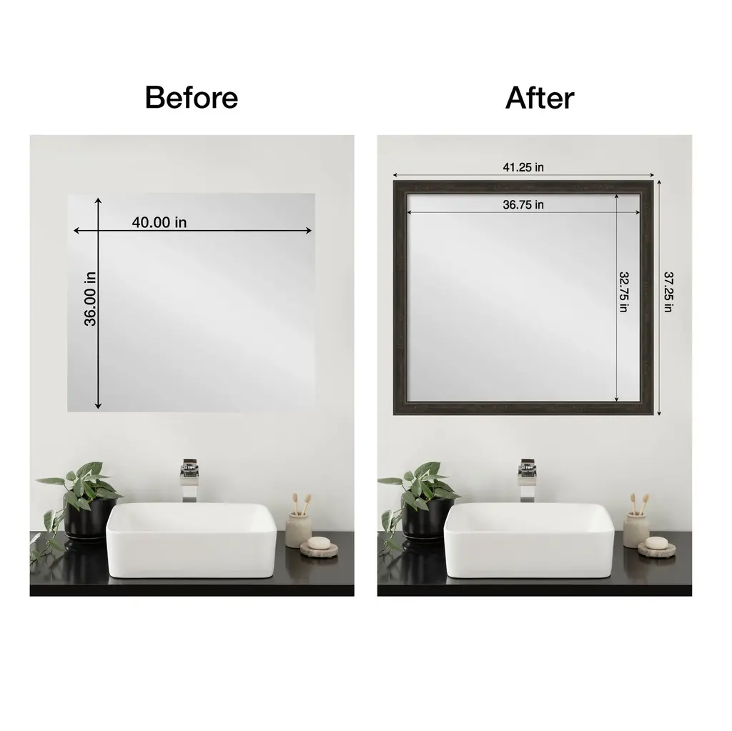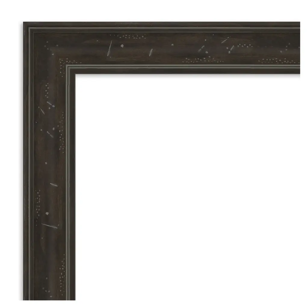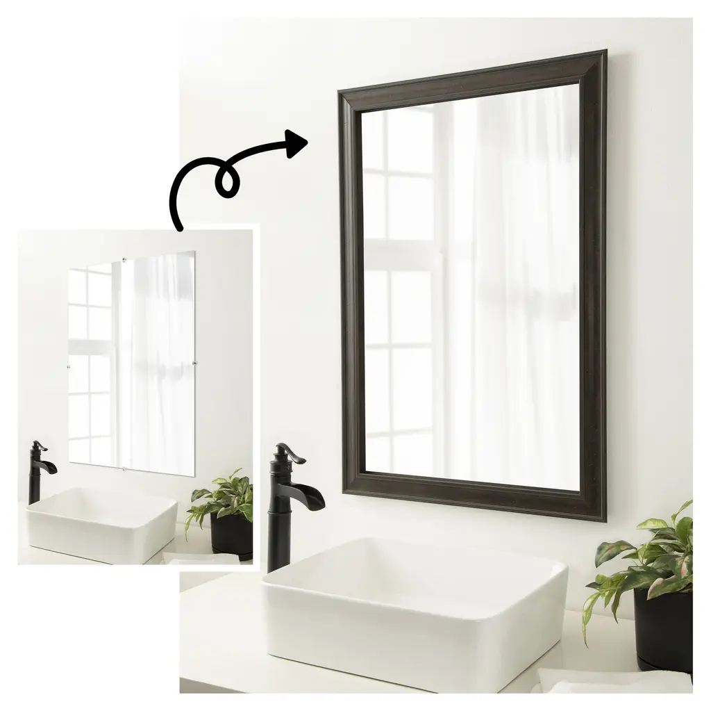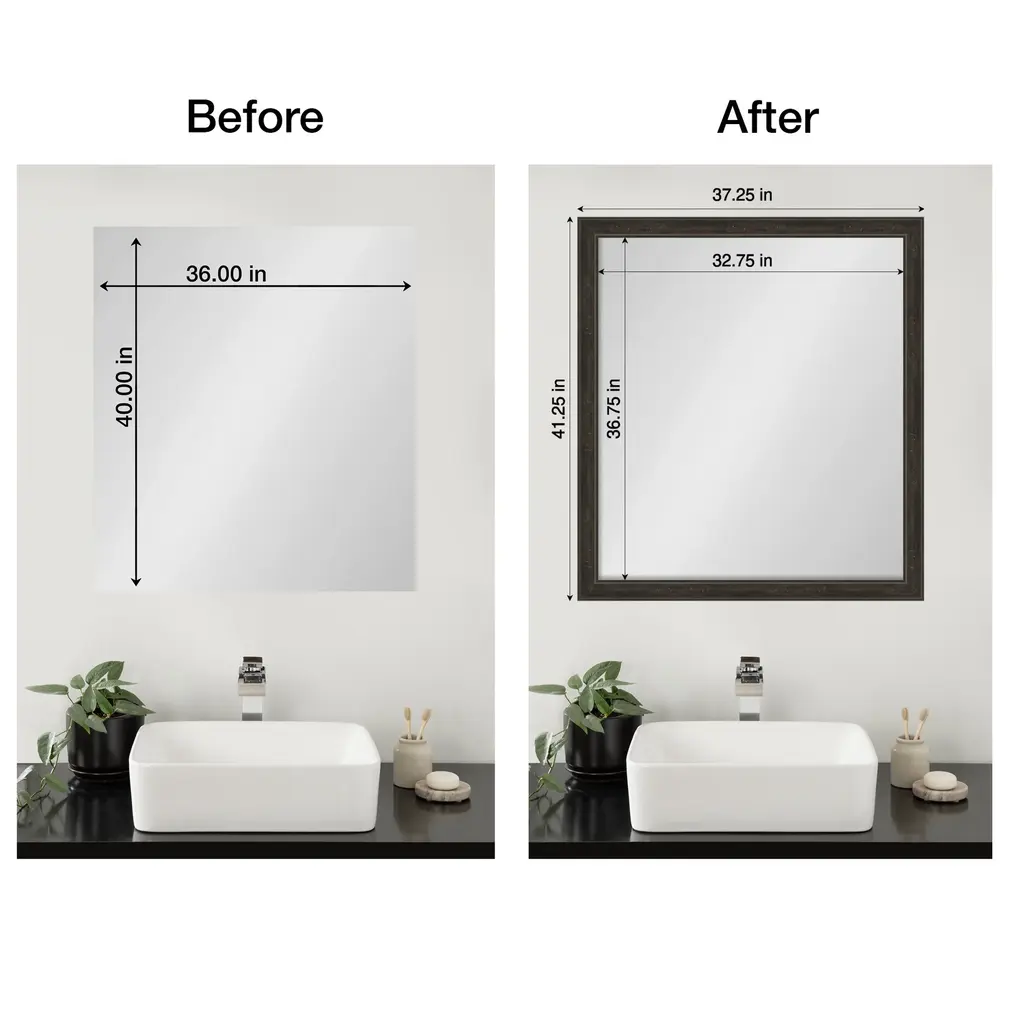 Upcycle your plain, unframed mirror into a stunning centerpiece with this Shipwreck Greywash Narrow mirror frame. Designed to be installed OVER your existing mirror glass, this frame effortlessly attaches without the hassle of removing the mirror from your wall. It's a seamless upgrade that breathes new life into your space, covers damaged edges, and can be removed with no trace. It's DIY with minimal effort and maximum impact. The Shipwreck Greywash Narrow frame is a dark brown frame with a distressed grey-washed finish and weathered pockmark details. It is 2.25 in. wide and stands 1 in. off the wall.Features:MIRROR MAKEOVER: Designed to be installed OVER your existing bare mirror, you can frame your bathroom mirror at home without removing it from the wall. Simply hang the fully assembled frame on the wall above your mirror and secure it to the mirror glass with the removable tape. The frame is not permanent and perfect for homeowners, renters, apartments, senior living, builders, and remodelers alike.INCLUDED IN KIT: Fully assembled waterproof bathroom mirror frame sized to work on a non-beveled frameless mirror, hanging hardware, nails, mounting tape, flush mount mirror replacement clips, plus paper and video installation instructions. Actual mirror glass is not included. Everything you need is included to hang, peel, and stick this frame to your existing mirror for an instant upcycle. It's the simplest DIY decor upgrade ever!SIZING INFORMATION: This frame fits on a non-beveled frameless mirror - MIRROR GLASS NOT INCLUDED. Hangs both vertically and horizontally.SPACE REQUIREMENTS FOR INSTALLATION: The frame will overhang the glass .75 inches on all sides to conceal the edges, including unsightly water damage and mirror clips. If your glass rests directly on a backsplash or counter, the frame requires 1.5" on the top edge to accommodate this.REMOVEABLE AND WATERPROOF: The Shipwreck Greywash Narrow Frame is a dark brown frame with a distressed grey-washed finish and weathered pockmark details. It's fully removable from the glass after use and is made of a recycled polystyrene plastic core decorated with a durable, colorfast finish to withstand regular bathroom cleaning. It's also waterproof and proven for home and commercial use.ASSEMBLED IN THE USA: Each piece is assembled to order in Madison, WI USA