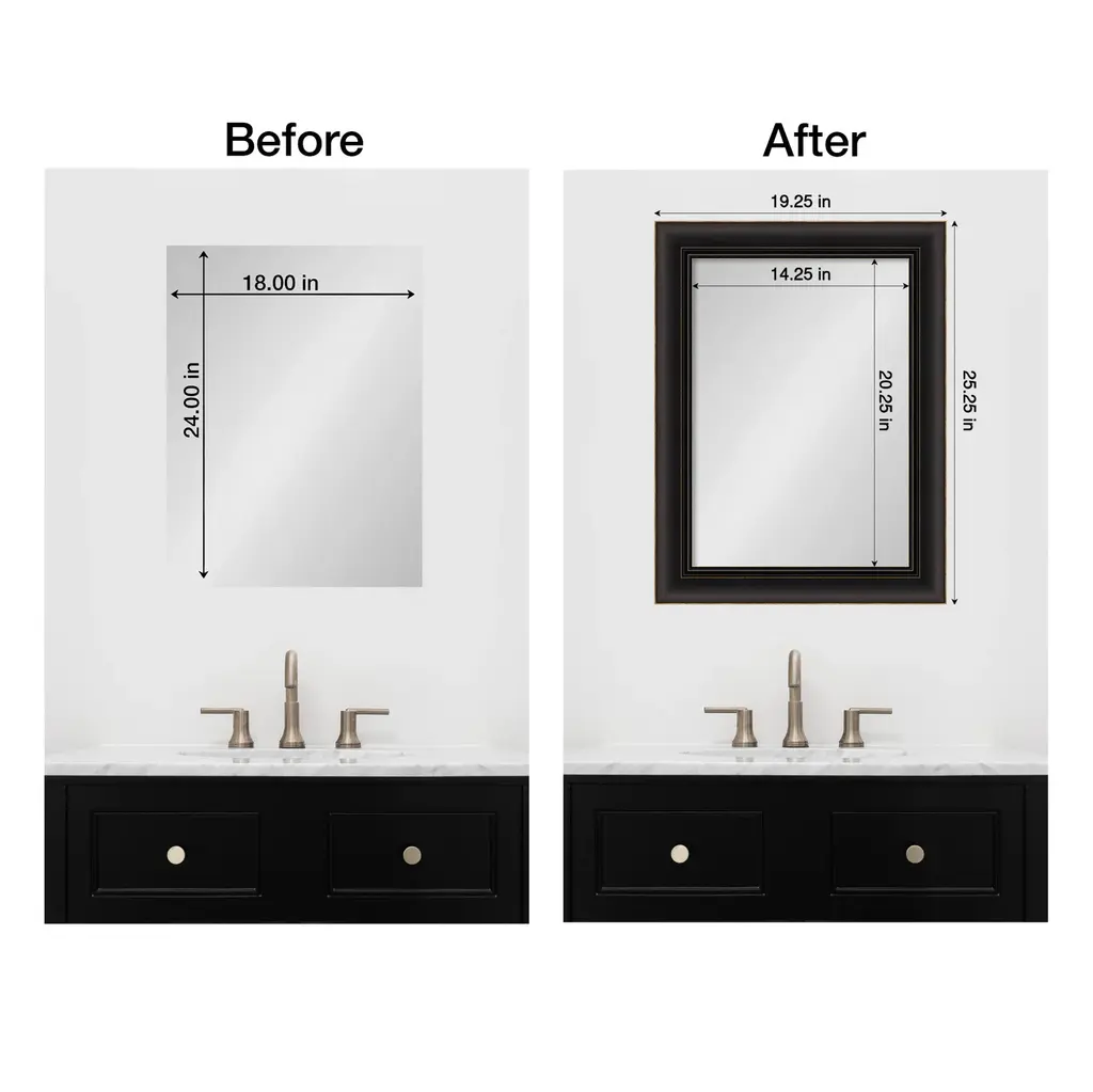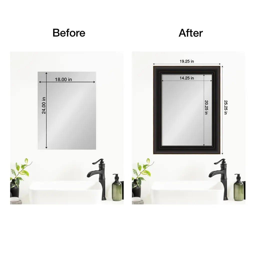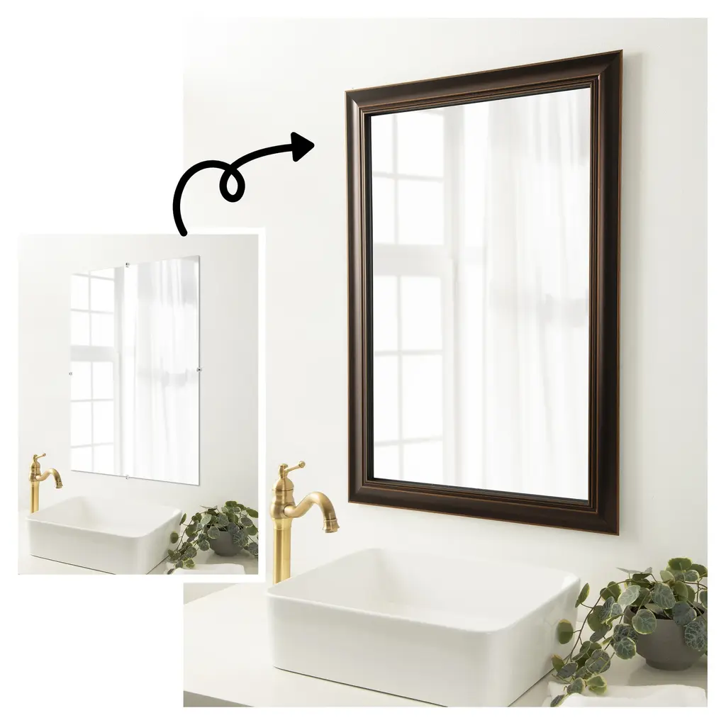 Upcycle your plain, unframed mirror into a stunning centerpiece with this Trio Oil Rubbed Bronze mirror frame. Designed to be installed OVER your existing mirror glass, this frame effortlessly attaches without the hassle of removing the mirror from your wall. It's a seamless upgrade that breathes new life into your space, covers damaged edges, and can be removed with no trace. It's DIY with minimal effort and maximum impact. The Trio Oil Rubbed Bronze frame is an espresso brown frame with bronze brushstrokes and edges with the look of oil-rubbed bronze. It is 2.5 in. wide and stands 1 in. off the wall.Features:MIRROR MAKEOVER: Designed to be installed OVER your existing bare mirror, you can frame your bathroom mirror at home without removing it from the wall. Simply hang the fully assembled frame on the wall above your mirror and secure it to the mirror glass with the removable tape. The frame is not permanent and perfect for homeowners, renters, apartments, senior living, builders, and remodelers alike.INCLUDED IN KIT: Fully assembled waterproof bathroom mirror frame sized to work on a non-beveled frameless mirror, hanging hardware, nails, mounting tape, flush mount mirror replacement clips, plus paper and video installation instructions. Actual mirror glass is not included. Everything you need is included to hang, peel, and stick this frame to your existing mirror for an instant upcycle. It's the simplest DIY decor upgrade ever!SIZING INFORMATION: This frame fits on a non-beveled frameless mirror - MIRROR GLASS NOT INCLUDED. Hangs both vertically and horizontally.SPACE REQUIREMENTS FOR INSTALLATION: The frame will overhang the glass .75 inches on all sides to conceal the edges, including unsightly water damage and mirror clips. If your glass rests directly on a backsplash or counter, the frame requires 1.5" on the top edge to accommodate this.REMOVEABLE AND WATERPROOF: The Trio Oil Rubbed Bronze Frame is an espresso brown frame with bronze brushstrokes and edges with the look of oil-rubbed bronze. It's fully removable from the glass after use and is made of a recycled polystyrene plastic core decorated with a durable, colorfast finish to withstand regular bathroom cleaning. It's also waterproof and proven for home and commercial use.ASSEMBLED IN THE USA: Each piece is assembled to order in Madison, WI USA