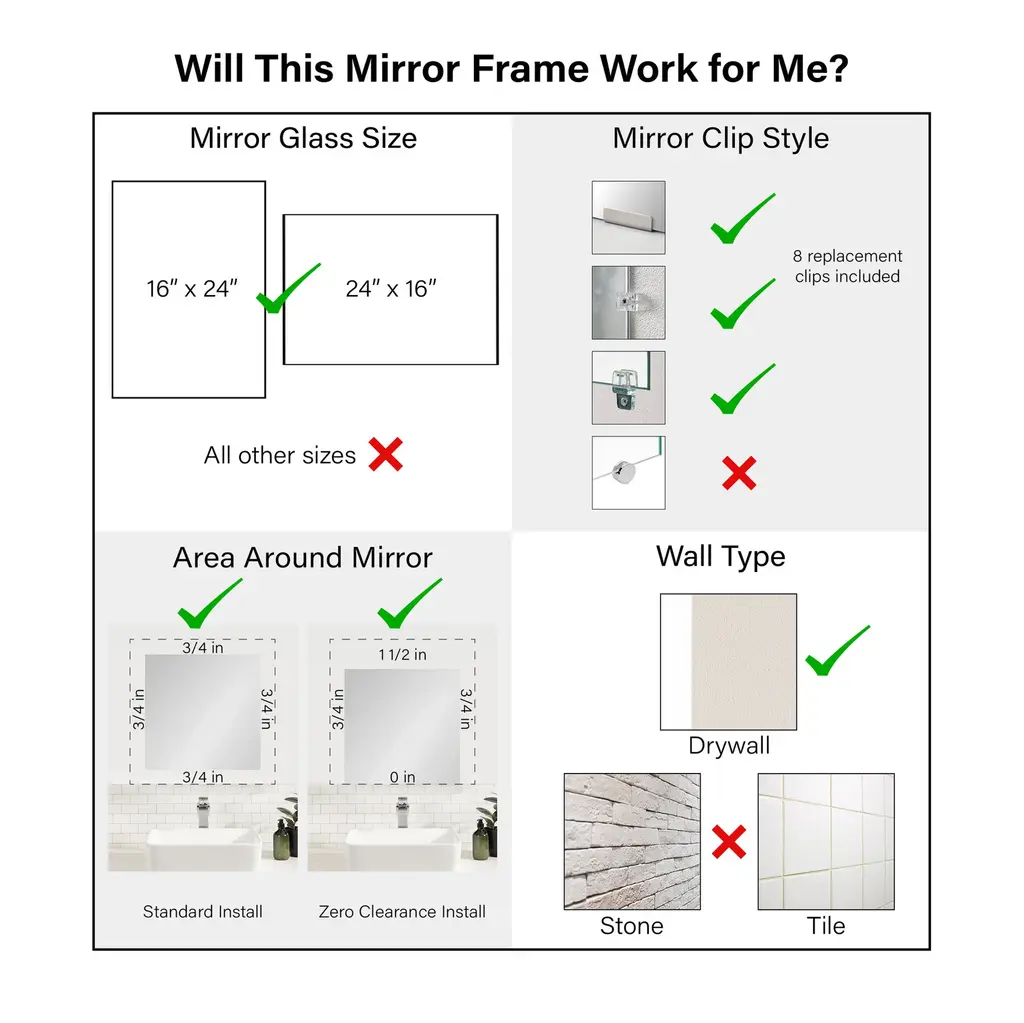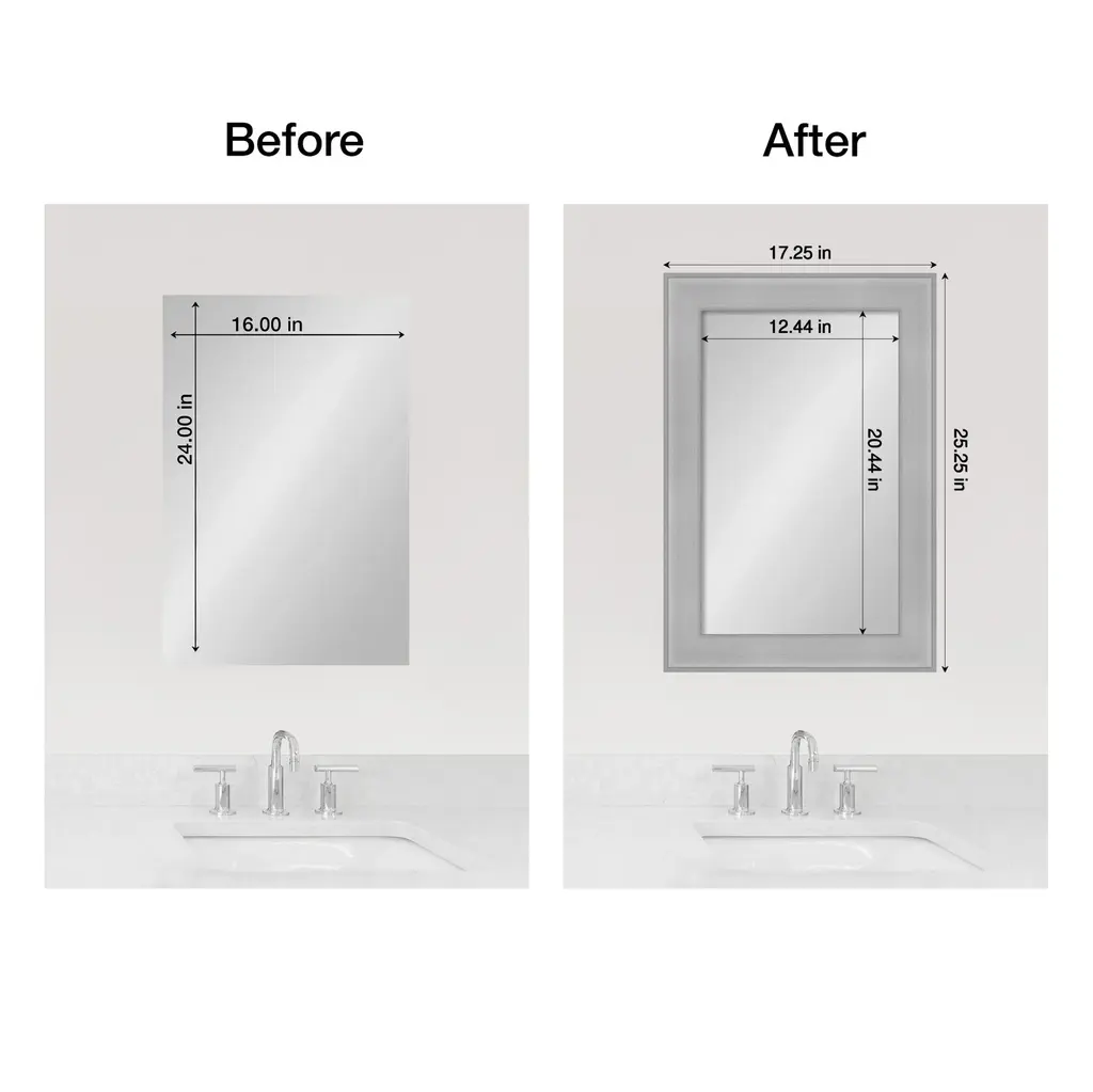 Upcycle your plain, unframed mirror into a stunning centerpiece with this Vista Brushed Nickel mirror frame. Designed to be installed OVER your existing mirror glass, this frame effortlessly attaches without the hassle of removing the mirror from your wall. It's a seamless upgrade that breathes new life into your space, covers damaged edges, and can be removed with no trace. It's DIY with minimal effort and maximum impact. The Vista Brushed Nickel frame is a wide, flat brushed metallic light silver frame with smooth matte silver inner and outer edges. It is 2.5 in. wide and stands 1 in. off the wall.Features:MIRROR MAKEOVER: Designed to be installed OVER your existing bare mirror, you can frame your bathroom mirror at home without removing it from the wall. Simply hang the fully assembled frame on the wall above your mirror and secure it to the mirror glass with the removable tape. The frame is not permanent and perfect for homeowners, renters, apartments, senior living, builders, and remodelers alike.INCLUDED IN KIT: Fully assembled waterproof bathroom mirror frame sized to work on a non-beveled frameless mirror, hanging hardware, nails, mounting tape, flush mount mirror replacement clips, plus paper and video installation instructions. Actual mirror glass is not included. Everything you need is included to hang, peel, and stick this frame to your existing mirror for an instant upcycle. It's the simplest DIY decor upgrade ever!SIZING INFORMATION: This frame fits on a non-beveled frameless mirror - MIRROR GLASS NOT INCLUDED Hangs both vertically and horizontally.SPACE REQUIREMENTS FOR INSTALLATION: The frame will overhang the glass .75 inches on all sides to conceal the edges, including unsightly water damage and mirror clips. If your glass rests directly on a backsplash or counter, the frame requires 1.5" on the top edge to accommodate this.REMOVEABLE AND WATERPROOF: The Vista Brushed Nickel Frame is a wide, flat brushed metallic light silver frame with smooth matte silver inner and outer edges. It's fully removable from the glass after use and is made of a recycled polystyrene plastic core decorated with a durable, colorfast finish to withstand regular bathroom cleaning. It's also waterproof and proven for home and commercial use.ASSEMBLED IN THE USA: Each piece is assembled to order in Madison, WI USA