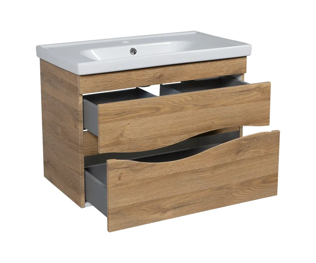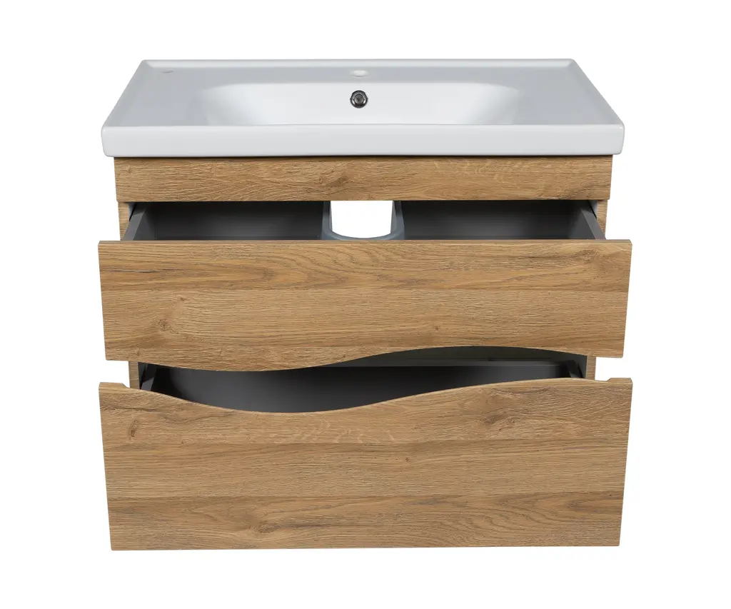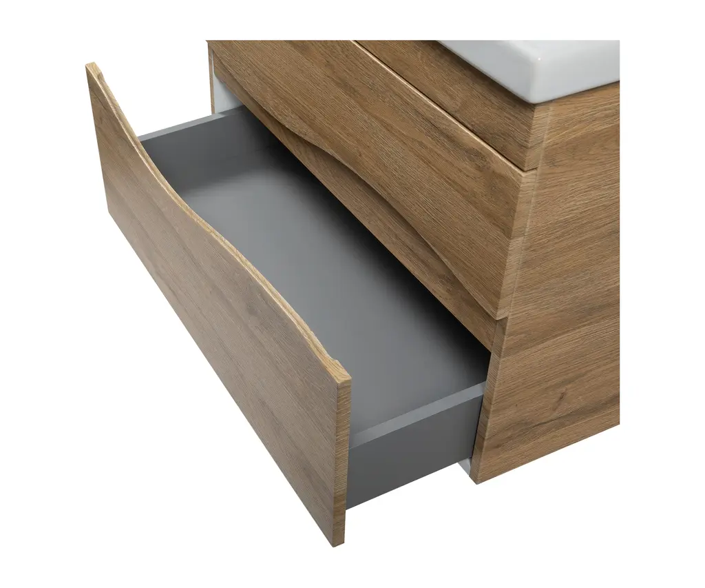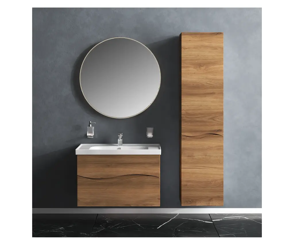 STANDART SET INCLUDES: Vanity with Washbasin Wave Teak Natural in size 32" and mirror Simple 32" sizeMATERIALS: Materials are resistant to humidity and temperature fluctuationsFINISHING: fronts and sides covered with three layers of primer and two layers of polyurethane paint manufactured by the Italian company “KEMICHAL”.EUROPEAN QUALITY: Furniture fittings certified and meet the European quality standards. Partial extension soft closing rails “Blum Tandem” (Austria)FURNITURE High-quality washbasinsStandard Set Includes Vanity with WashbasinThe stylish WAVE collection: impeccable furniture for the bathroomEnchanting furniture with a unique design captivates at first sight, inviting you to enjoy all the benefits of beauty and comfort. It is a great purchase for special interiors, where the restrained luxury subtly speaks of the discerning taste of the owners. The authentic design, the highest quality materials, and the thoughtfulness of the smallest components. That is the secret of the popularity of the legendary collection.The designer line Wave is the first among the bestThe model collection consists of a console cabinet with the Frame sink and an additional console cabinet of various sizes.The products are available for order in several color solutions:Gray Matt;Rosewood;High Gloss White;Natural Teak;White Gloss PVC;The unique feature of the "Wave" collection is the LED backlighting of the original pattern applied using sandblasting. The mirror panels are made by the Belgian company "AGC".The hardware is certified and meets world quality standards. Partially extendable "Blum", "Tandem" mechanisms (Austria) are used. All doors have a soft close mechanism. The technology of concealed mechanisms ensures smooth movement of drawers, making their use even more comfortable.The "CeraStyle" (Turkey) sink is made of quality ceramic resistant to temperature and mechanical effects.The facade and side panels are coated with three layers of primer and painted with two layers of glossy polyurethane paint produced by "KEMICHAL" (Italy).The colorful furniture will become the central element of any interior and will not go unnoticed. The well-thought-out storage system will pleasantly surprise you with its impeccable practicality.The main advantages of the Alpha furniture collection areThe combination of innovative technologies and the best traditions produces premium bathroom furnitureThe elegant designs and mirrors with imaginative patterns surrounded by LED lights turn ordinary furniture into an aristocratic work of art;The collection is made using materials from leading global brands, ensuring the longevity and ecological sustainability of the product;The high level of material resistance to moisture, mechanical and temperature influences, ultraviolet rays, mold, etc;Maintaining the original shape, functionality, and color for several decades, with basic operating rules followed;Individual approach to manufacturing orders - the ability to choose the necessary dimensions and color of cabinets and stands;Everyday surface care does not require expensive tools or much time;The Wave model line harmoniously combines with both classic and modern interiors. Recommended styles include retro, classic, minimalism, Scandinavian, hi-tech, eco, constructivism, contemporary, Eastern, and others.;Furniture of the highest quality and luxurious design will create an atmosphere of respectability and comfort. Wave is a radiant collection for true romantics.