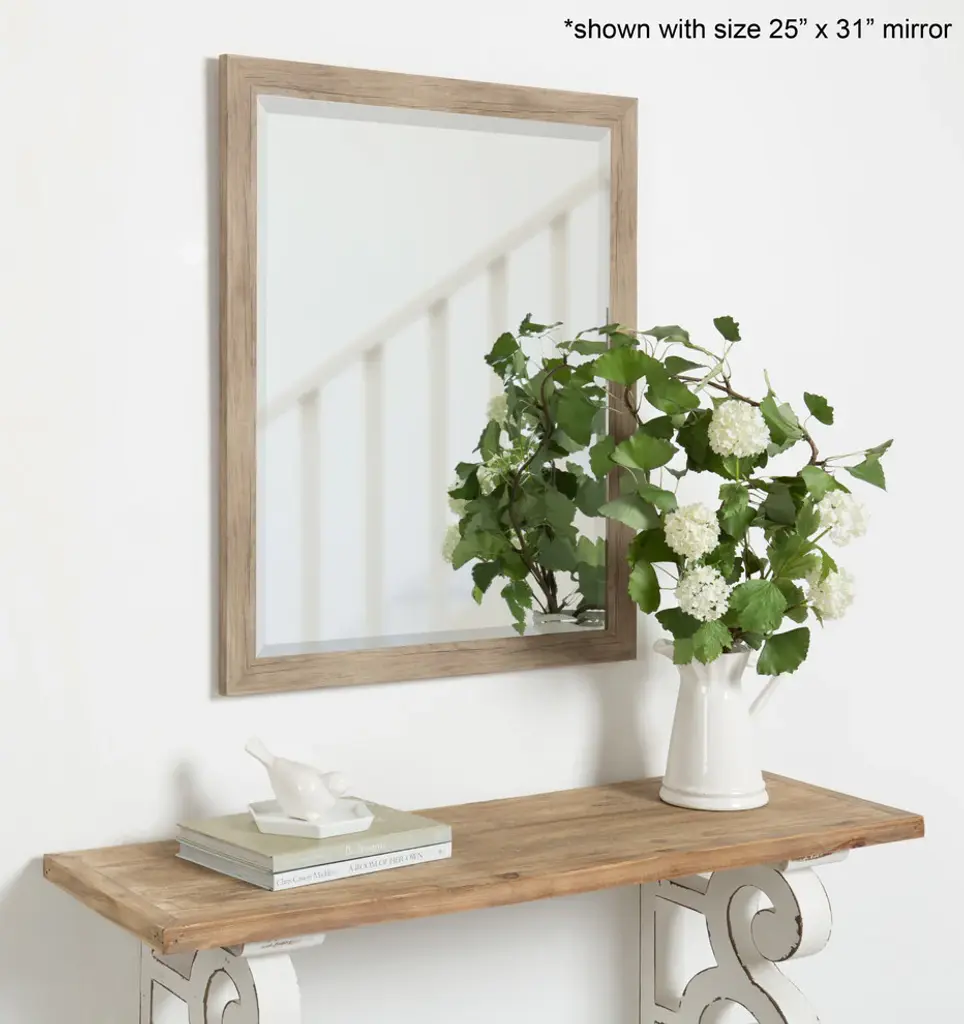 Using a mirror to dress up a part of your home is a simple choice With the Beatrice rectangular wall mirror by DesignOvation. It is a beautiful addition to any wall and an essential element in your home decor. An easy way to revamp a space, the flexible sized 27"x39" rectangle frame has the perfect dimensions to add a stylish statement to a hallway, bedroom or living room. You could even place two on adjacent walls for opening up space in any smaller room. The substantial size makes it a natural selection for your bathroom either as a tasteful piece of wall art or a practical vanity mirror. The warm casual feel creates a stylish look in a modern farmhouse design and blends With other styles well, so it is sure to fit perfectly in a kitchen, hallway or dining room too. The frame is made of a sturdy polystyrene material and has a 1.75" wide profile. The beveled mirror surface is a nice size at 23.5"x35.5", reflecting lots of light and brightening up any space.
