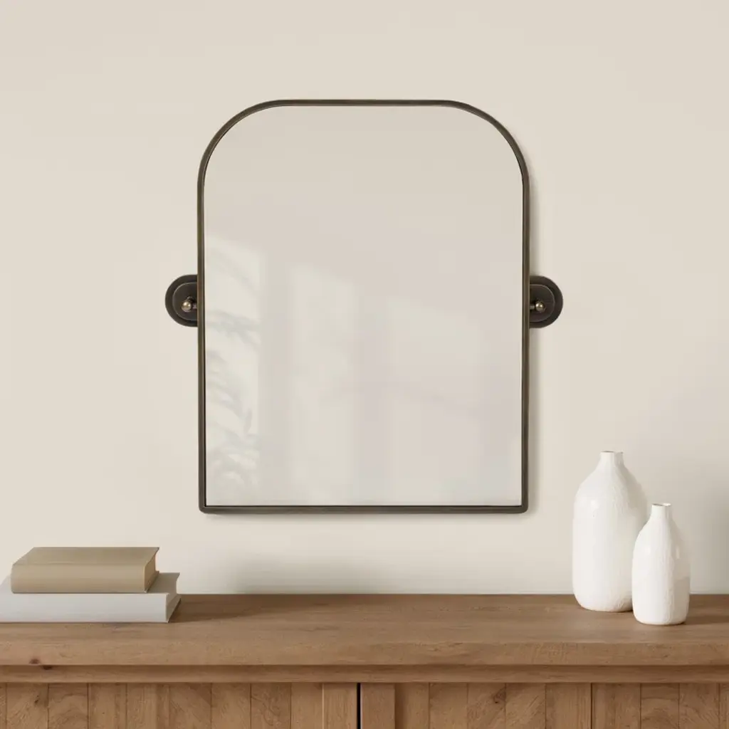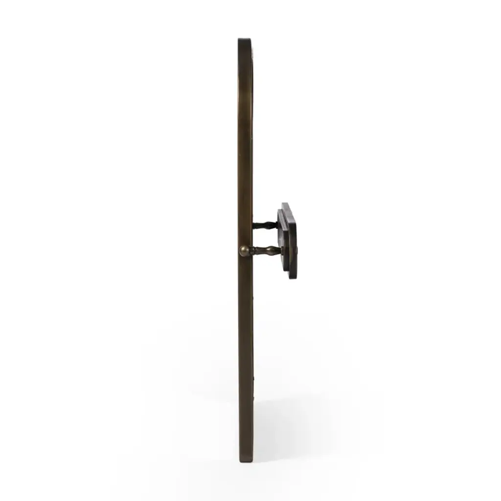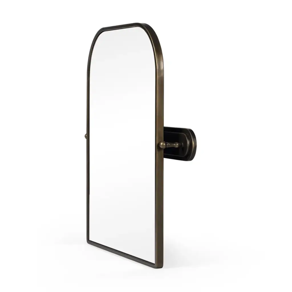 A design collaboration by Amber Lewis and Four Hands.Aged iron frames this bath-safe wall mirror. Mounted on vertical pivots and finished with pill-shaped wall mount and ball finial detailing.