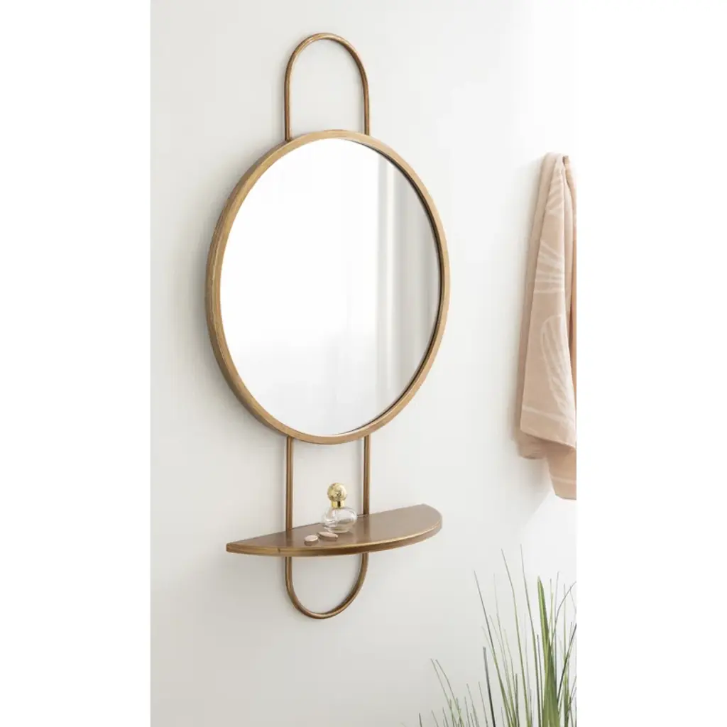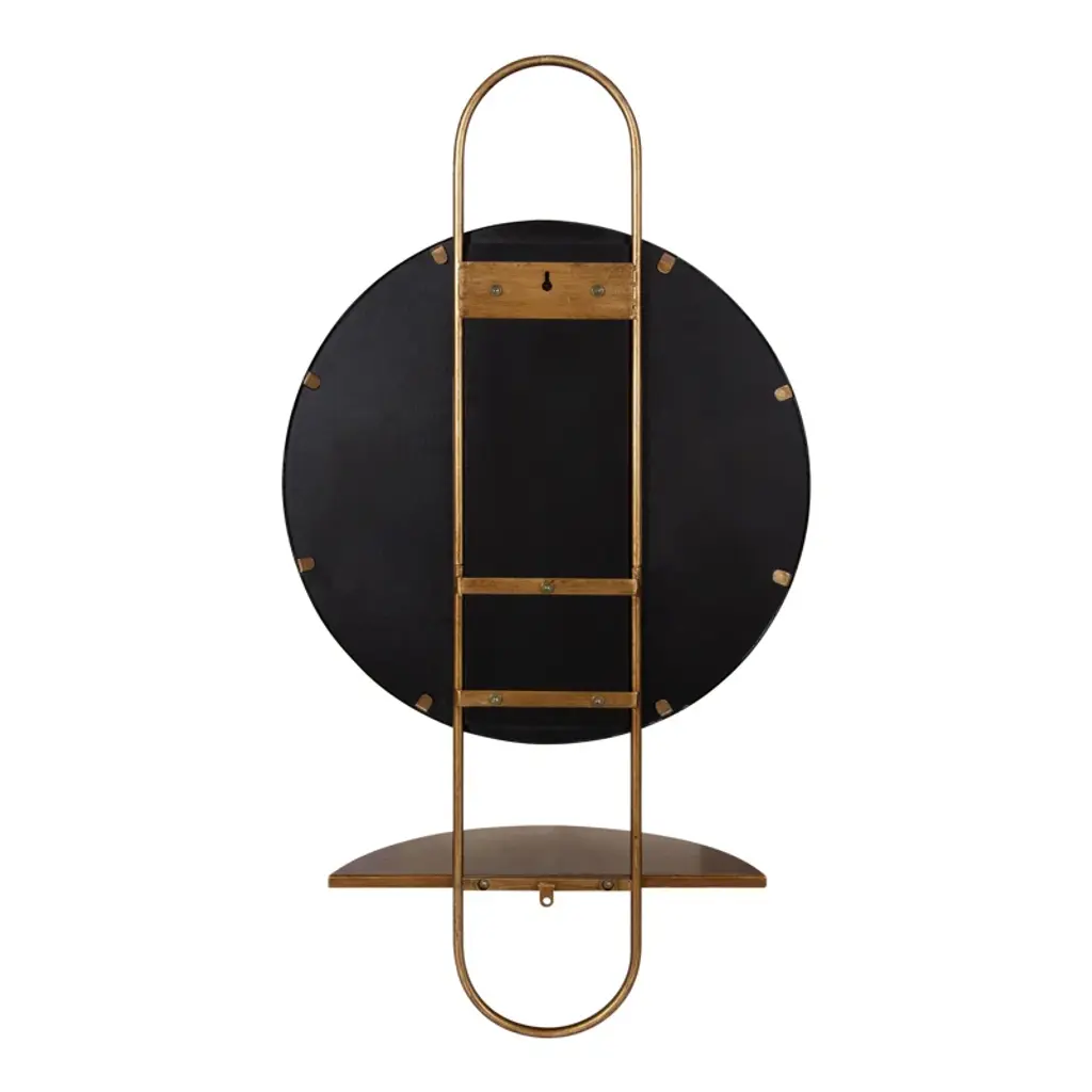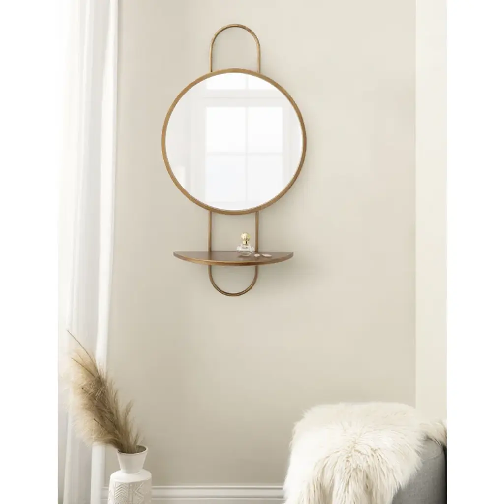 Add a transformative accent to your space with this functional round mirror with shelf. Perfect for any narrow wall seeking a hint of vibrance or storage, this mirror with shelf gives you both with style in mind. Built from high-quality materials, the mirror features a metal frame and shelf, so you know that you're getting a resilient accent piece that was made to last. The painted finish also offers a charming aesthetic that has the capability of blending into any room with a little decorative nudge. Hang this accent mirror in only a matter of seconds with a keyhole hanger securely attached to the back. This mirror also features foam padding along the back of the base to prevent it from scuffing your walls. Feature it in any mid-century living room, bedroom, entryway, dining room, bathroom, hallway, or entryway foyer. Or, it would serve as a perfect makeup mirror with a shelf to hold your favorite perfume, some makeup products, or a pair of earrings.