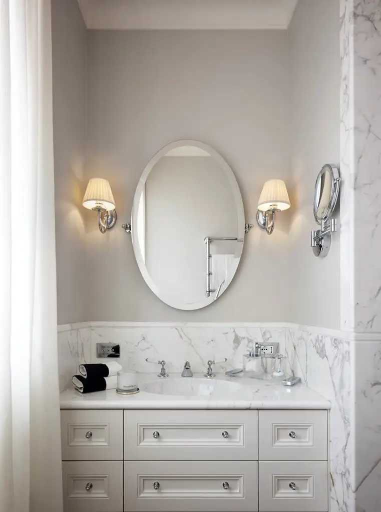 BEAUTY 1 is a tilting bathroom mirror with an essential design whose elegance is emphasised by its beveled edges and turned brass joints. Available in two sizes, it can be fixed to the wall in a horizontal or vertical position.