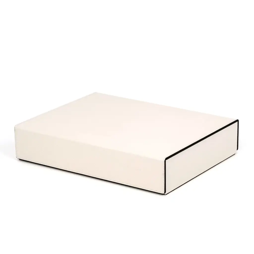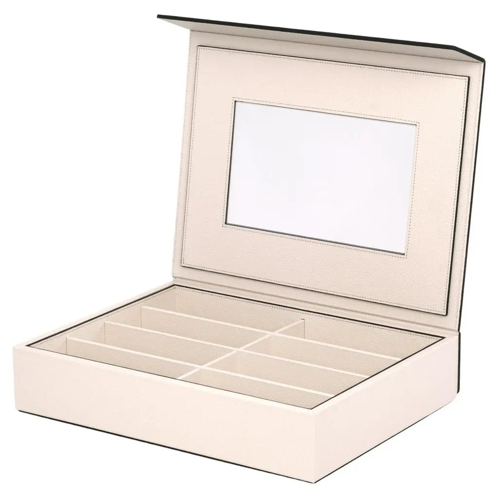 Combining tradition and modern design, the Pinetti glasses box exudes luxury and elegance. Featuring a wood base and fully covered in beige calfskin leather, it offers ample space to store up to eight pairs of glasses. The integrated mirror on the lid adds extra functionality. Available in a variety of colors. Contact the concierge for more information.