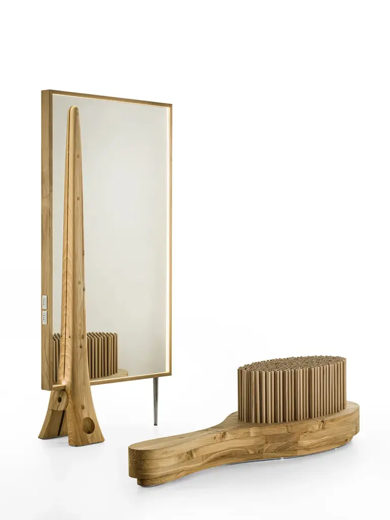 BEKKUCCIO - Mirror crafted from solid scented cedar wood, celebrating one of the most iconic objects in the world of hairstyling: the hair clip. In this visionary interpretation by Aldo Coppola Jr., the hair clip is transformed into a sculptural structure made of solid cedar wood, supporting a large mirror framed by integrated LED lighting.The Aldo Coppola brand has always shared a deep connection with nature: from the use of henna and natural raw materials to recyclable aluminum packaging. It’s from this philosophy that WOOD NATURE was born—a furniture collection crafted from solid cedar wood sourced from responsibly managed forests, transformed into a statement of sustainable design.Riva1920 is the perfect partner to bring this vision to life, thanks to its excellence in woodworking, artisanal craftsmanship, and deep respect for natural materials. Both brands share the same mission: to create timeless icons—authentic pieces made to last.WOOD NATURE also pays homage to the art of hairstyling. Each piece is inspired by the iconic tools of the trade, reimagined through an artistic lens. Design and functionality come together, making these furnishings ideal not only for Aldo Coppola salons but also for home interiors.“When an object is created with soul, it has no boundaries. It’s not just for hairstylists—it’s for anyone who loves design, quality, and true beauty.” — Aldo Coppola Jr.A perfect fusion of nature and form, tradition and innovation, functionality and emotion. Because true luxury lies in owning something with a story, with meaning, and with a soul.