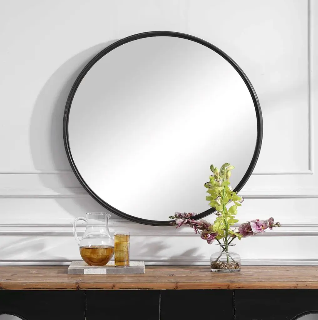 This simple round mirror highlights a sturdy iron frame with a curved raised edge in an aged black coating. The minimalistic design makes it perfect for incorporating into various style environments.