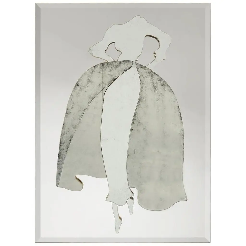 The Belle Mirror is an innovative design statement that commands attention within a space. This dimensional piece showcases a human figure in églomisé, adorned in an elegant dress with light, medium, and dark tones. The figure, showcasing Gold Coast trim, is placed atop a rectangular panel of beveled glass. This mirror is affixed with French cleats and may only be hung in a vertical orientation.