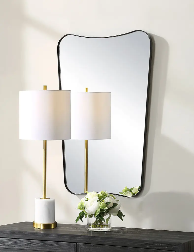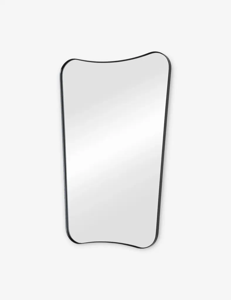 The Belvoir mirror offers sleek simplicity with its slim brass-finished frame. Its tapered shape bows at the top and bottom, styling an artful silhouette with a modern edge. Mount this wall mirror from your entryway to bath for a finishing touch that's both functional and chic.