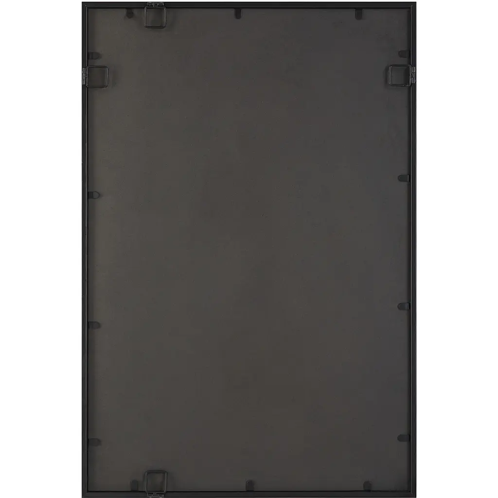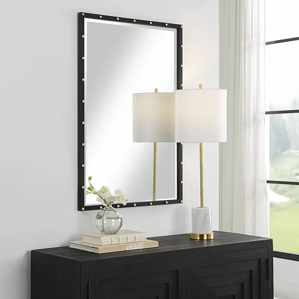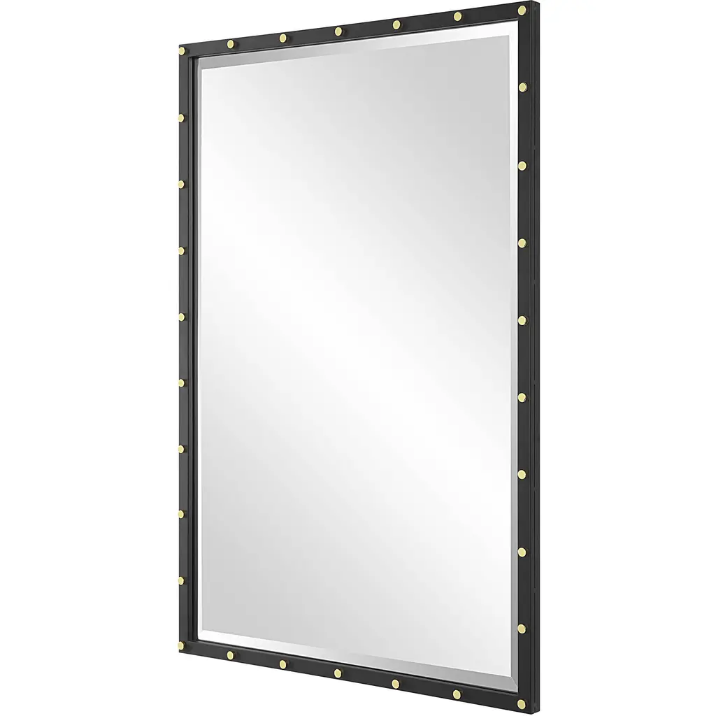 This Urban Industrial Design Features An Iron Frame Finished In Matte Black Adorned With Plated Brass Smooth Screw Caps. Mirror Has A Generous 1 1/4" Bevel. May Be Hung Horizontal Or Vertical.