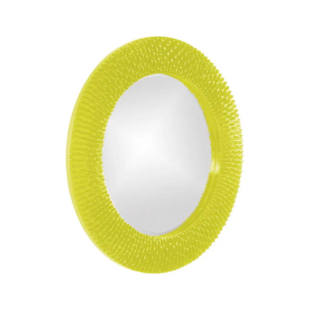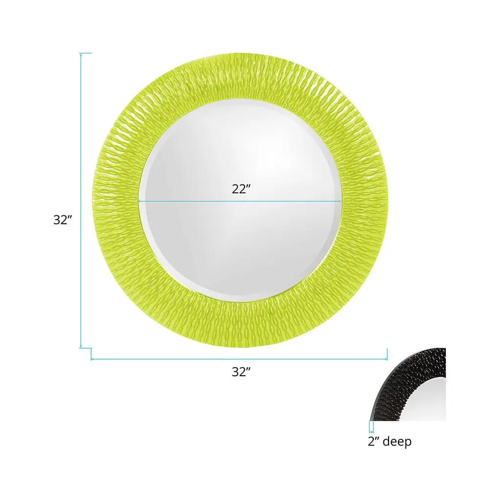 Bergman features a round frame characterized by a textured ribbed frame. It is then painted with our custom glossy green lacquer finish. It is a perfect focal point for an entryway, bathroom, bedroom or any room in your home. D-rings are affixed to the back of the mirror so it is ready to hang right out of the box! The Bergman Mirror is part of our custom paint program and is available in one of fourteen vivid colors. It is proudly painted in the USA.